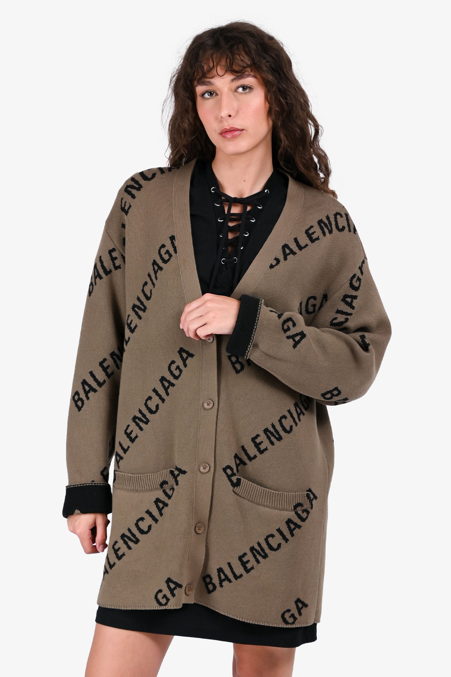 Refresh availabilityBalenciaga Green Cotton/Wool Logo All Over Cardigan. 5 front button closure. Reverse colour-way interior. 2 front slip pockets. Tonal stitching.