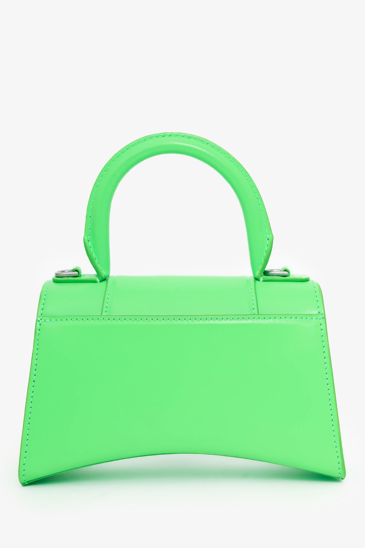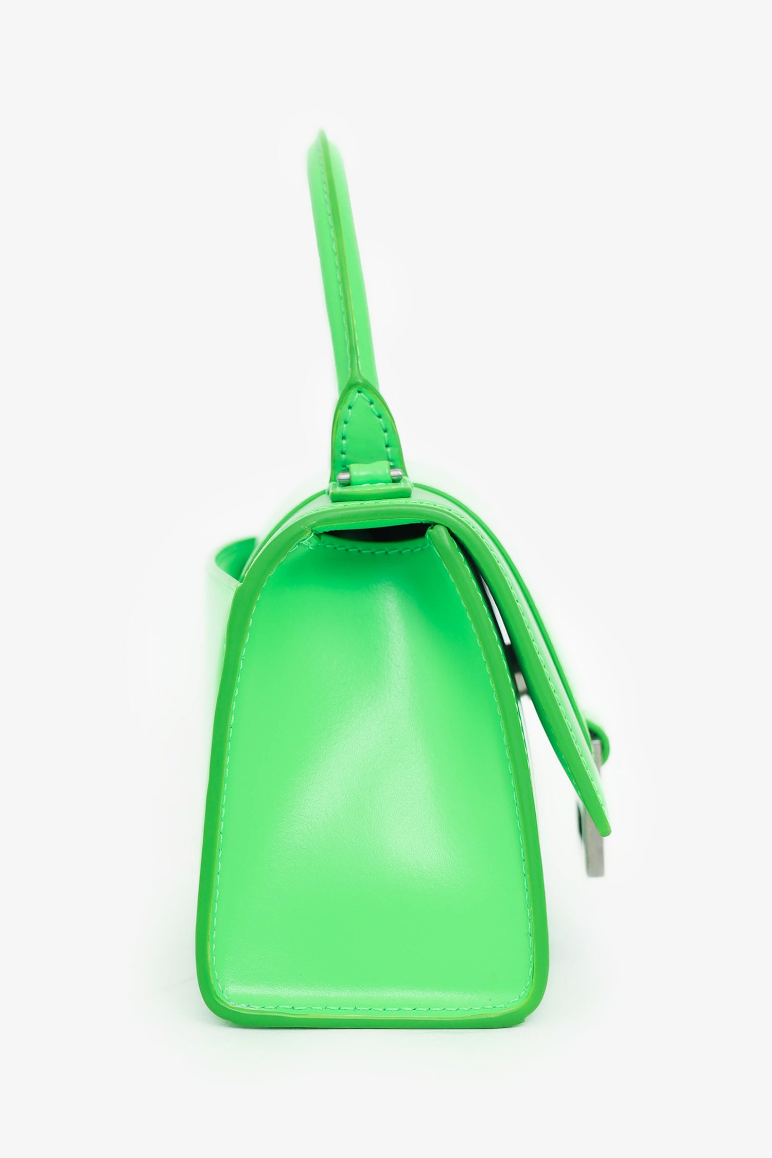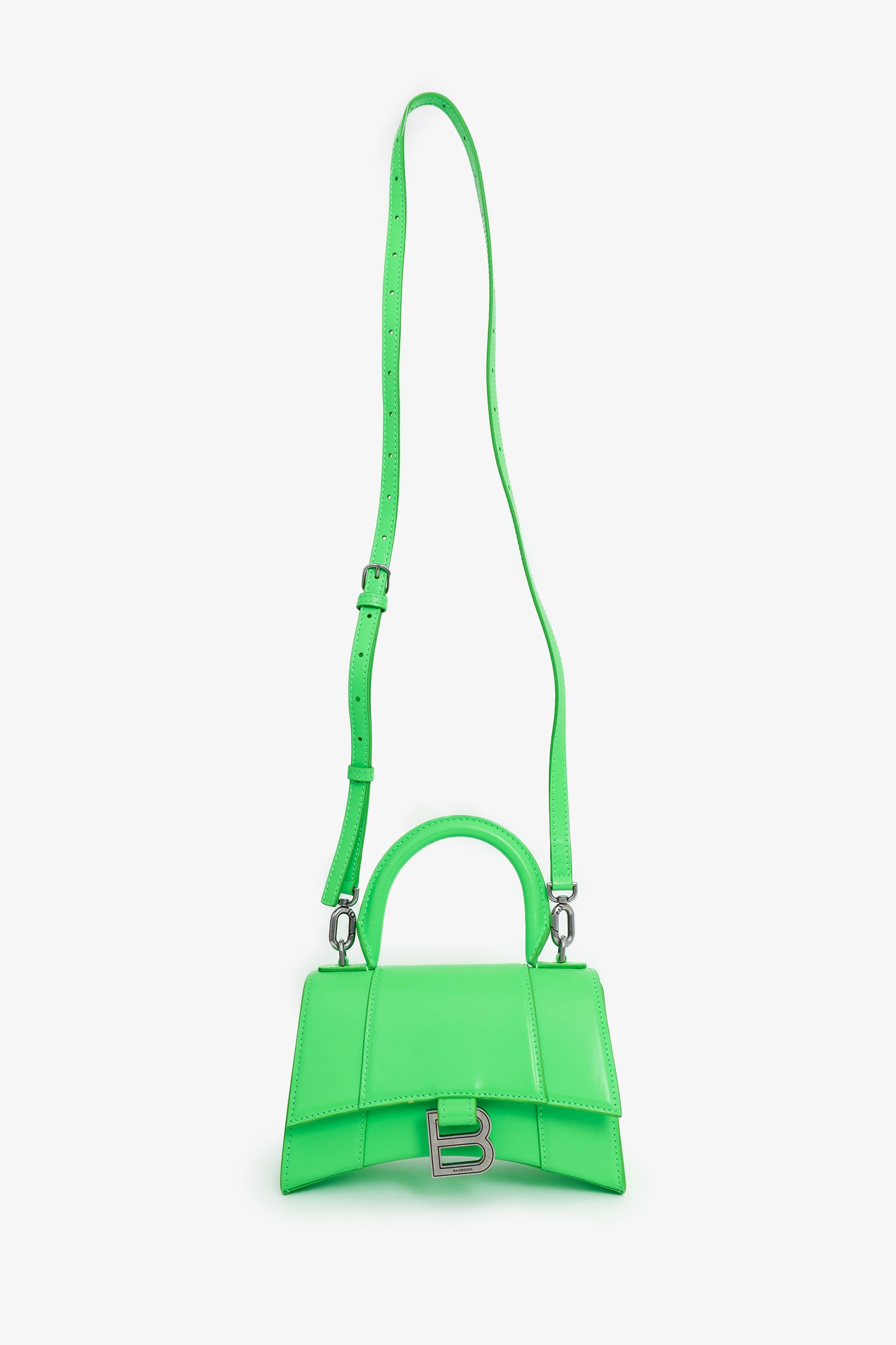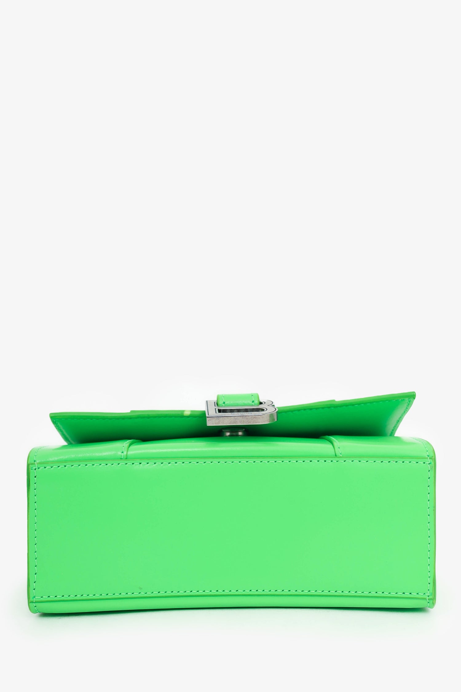 Refresh availabilityBalenciaga Green Leather Hourglass XS Top Handle Bag. Front fold-over flap with magnetic button closure. Single top handle. Adjustable/removable strap. Slip compartment on rear. Silver-tone hardware. Tonal stitching.