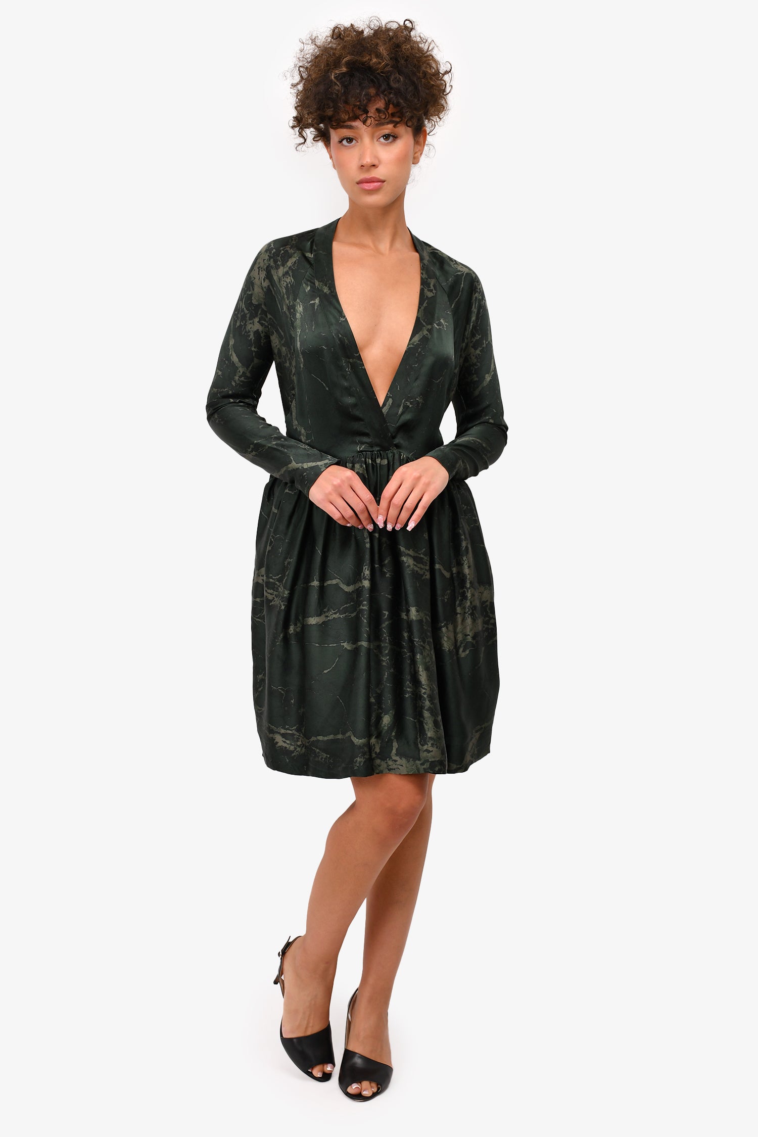 Refresh availabilityBalenciaga Green Printed Silk Mini Dress. Rear zip and hook closure. V-neck. Zippered cuffs. Half-lined.