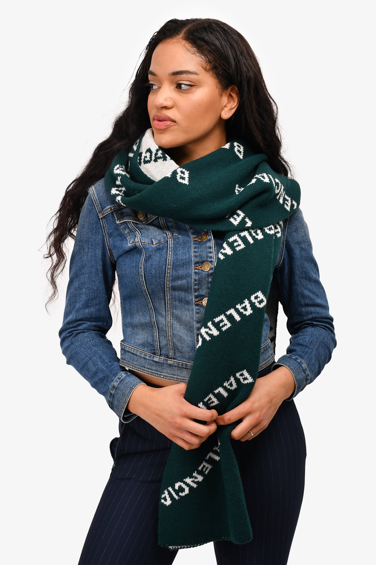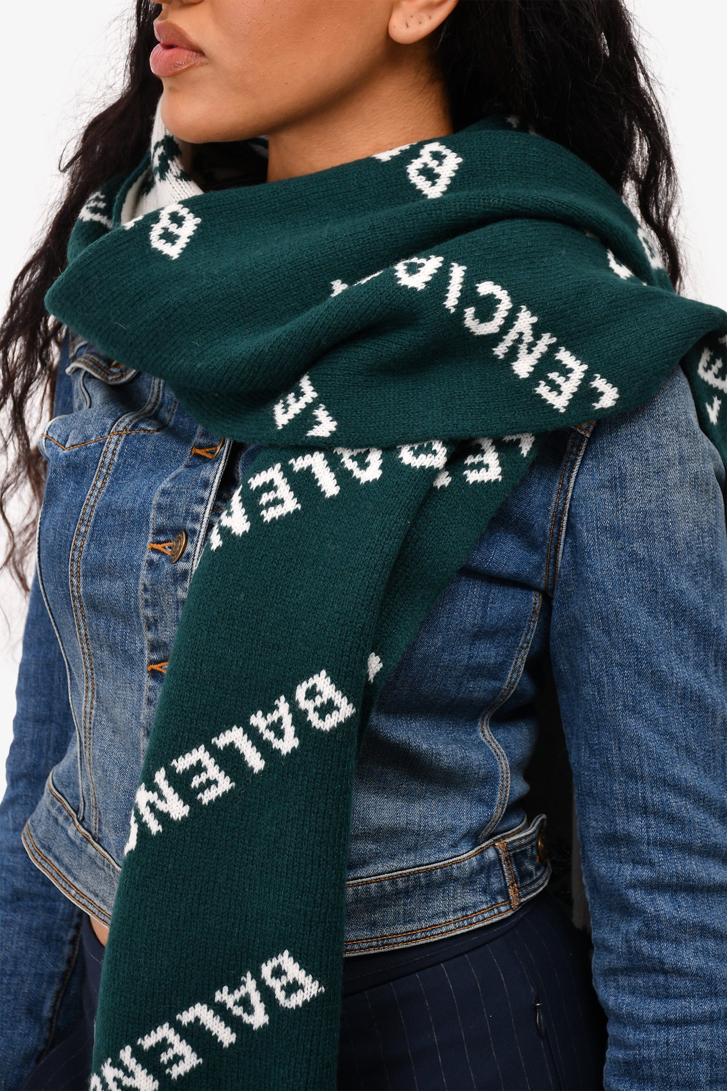 Refresh availabilityBalenciaga Green Wool Logo Scarf. Reversible with inverted colours. Tonal stitching.