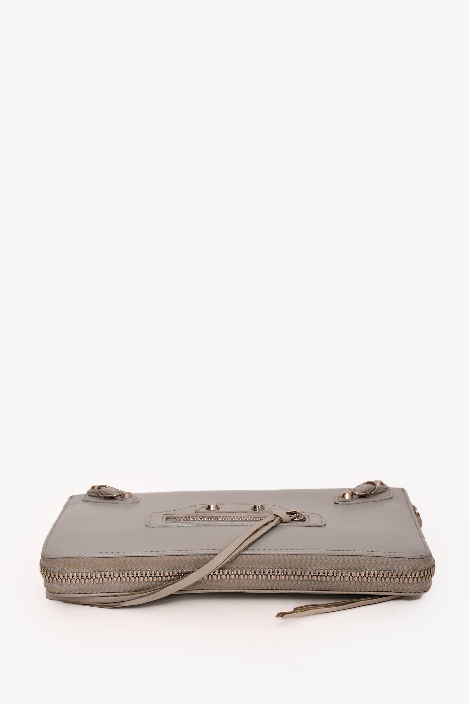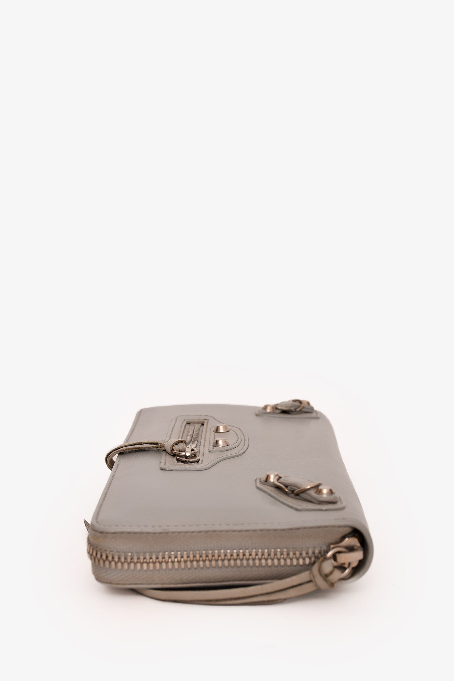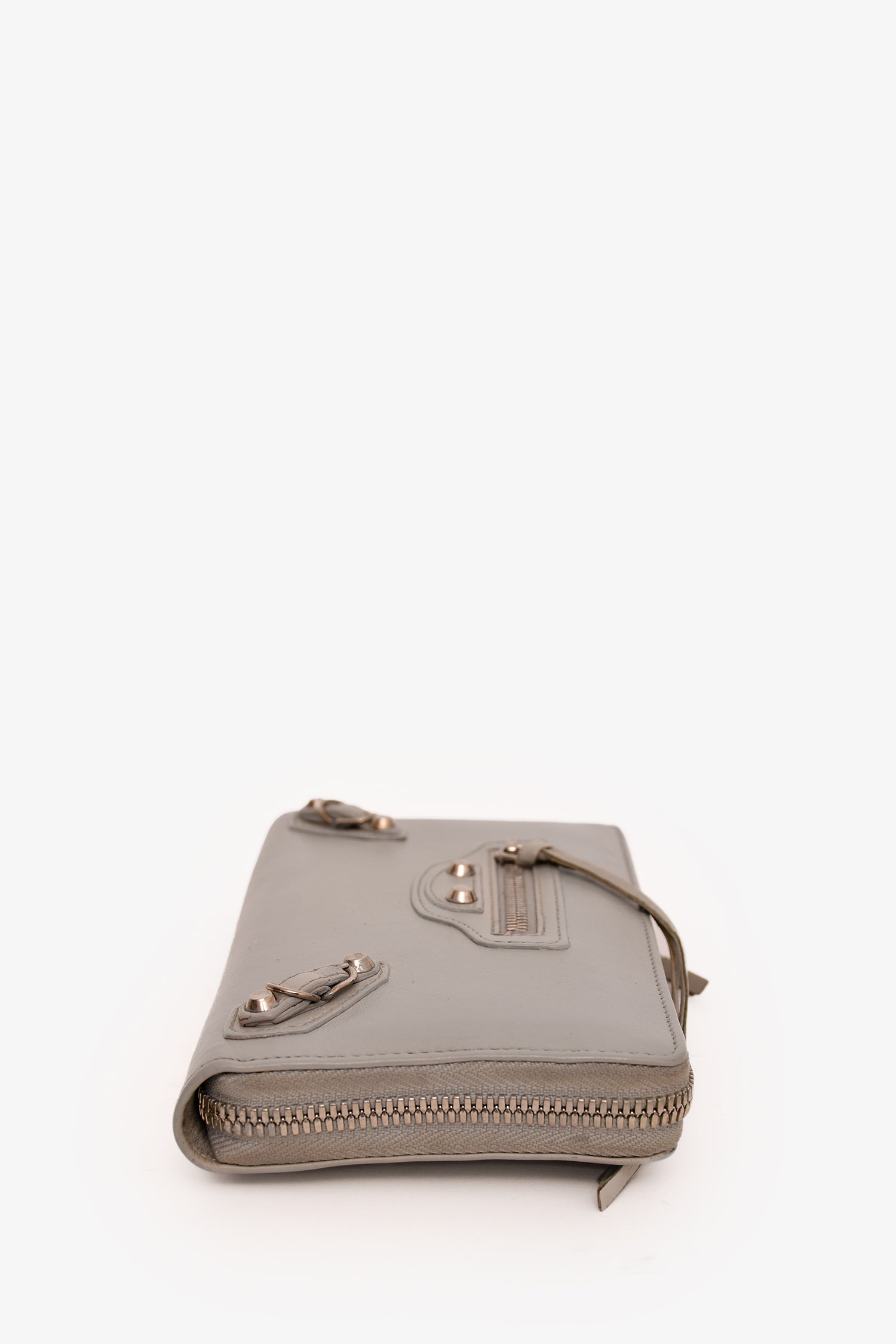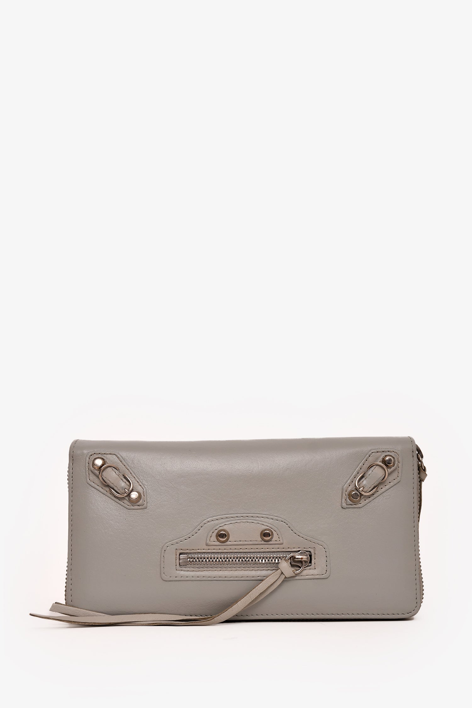 Refresh availabilityBalenciaga Grey Leather Classic City Continental Wallet. Silver-tone hardware. Front compartment with a zipped fastening. Zip-around. 12 card holder slots. Zipped compartment. 3 compartments. Tonal stitching.