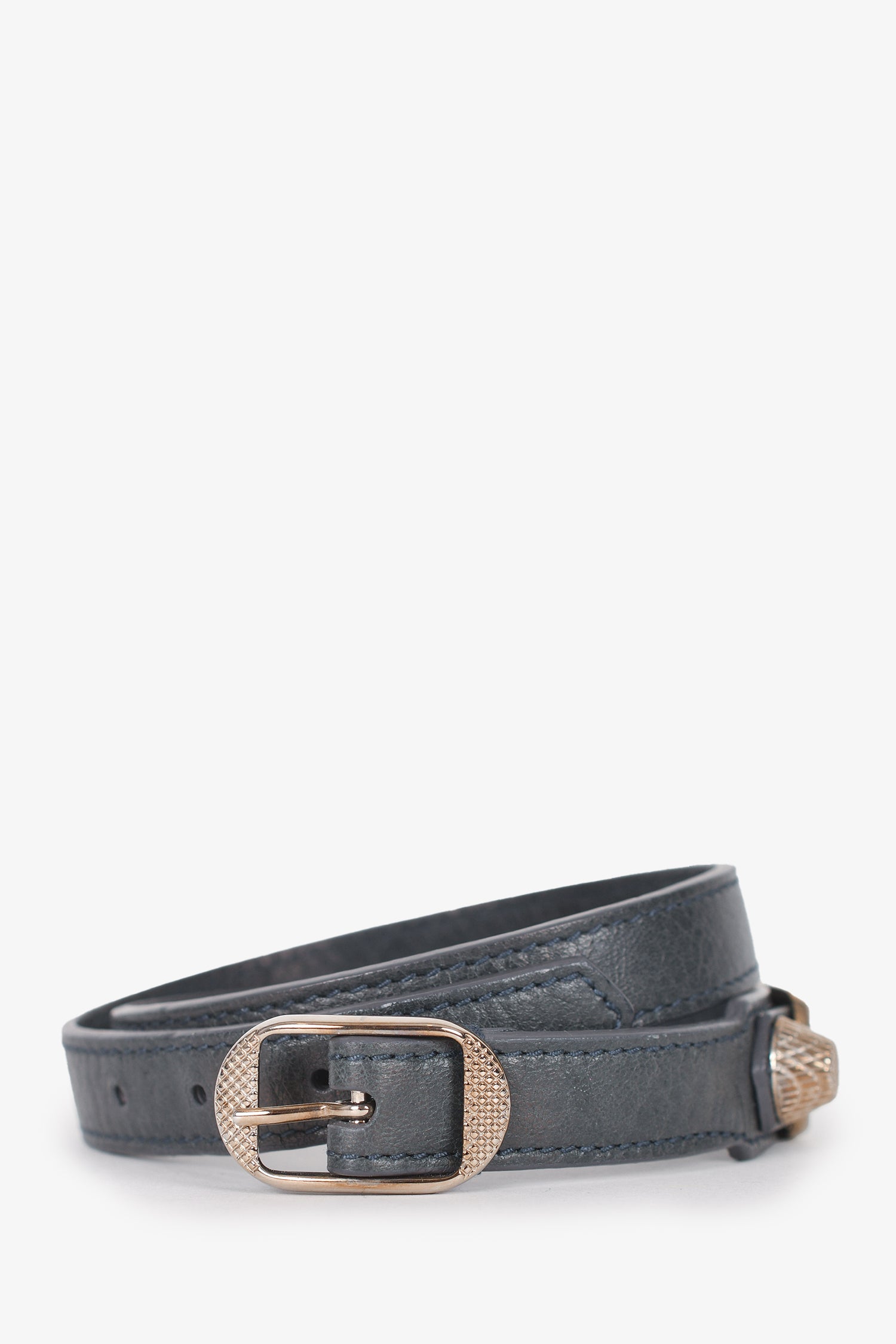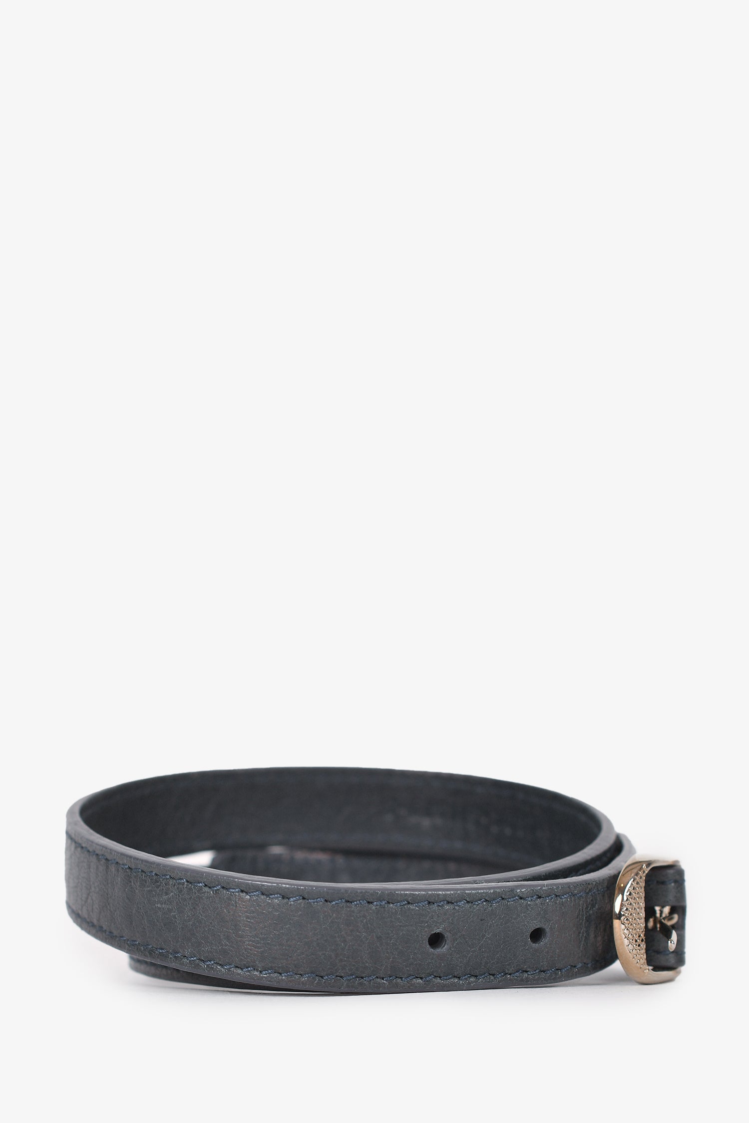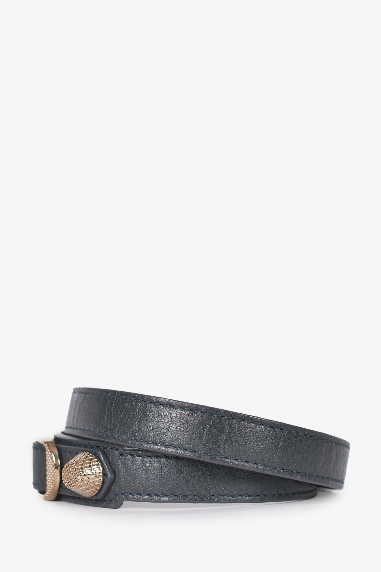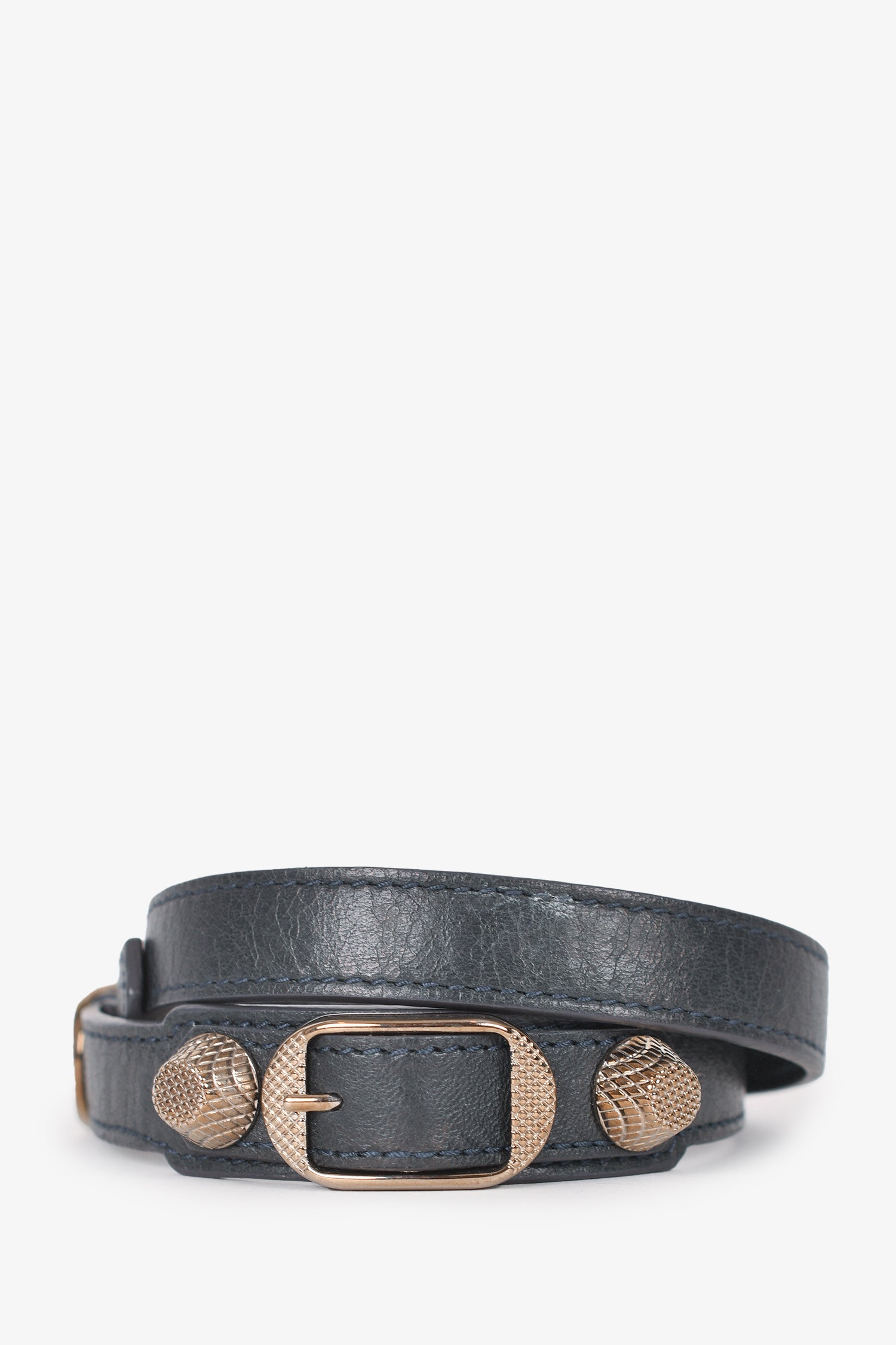 Refresh availabilityBalenciaga Grey Leather Silver Toned Studded Bracelet. Triple wrap. Buckle closure. Silver-tone hardware.