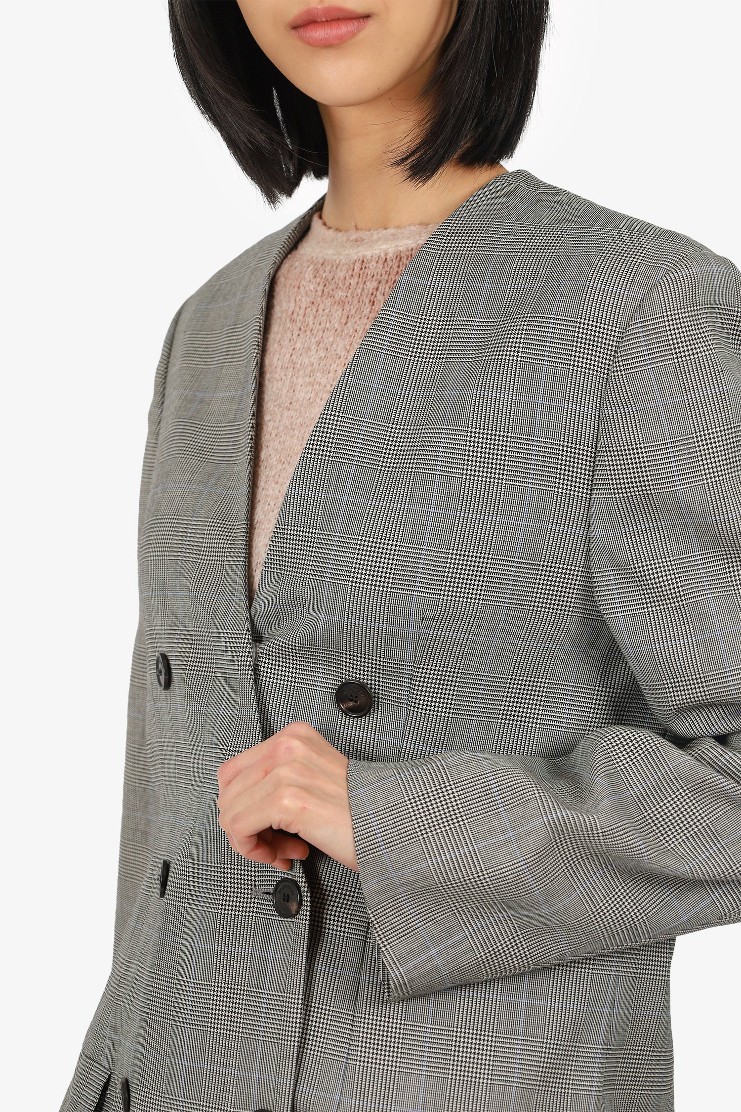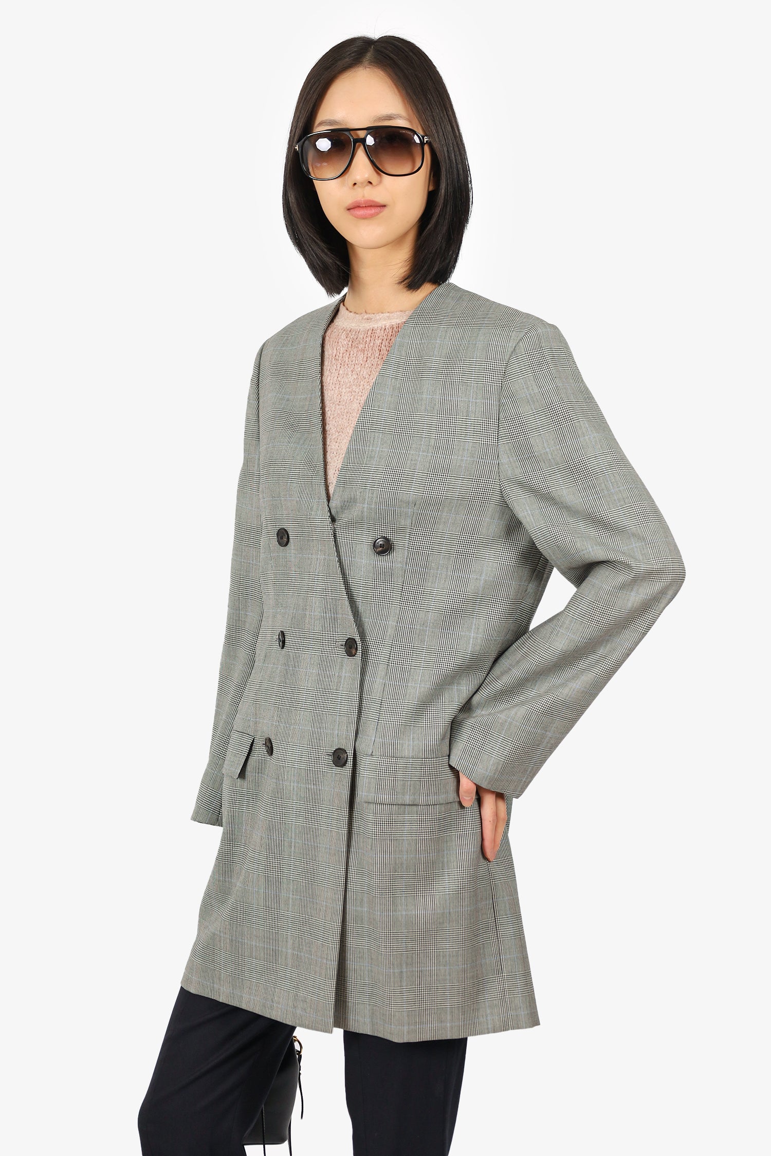 Refresh availabilityBalenciaga Grey Wool Plaid Blazer Jacket. V-neckline. Two sets of front button-up closure. 2 front exterior faux-pockets. Lined interior. Built-in shoulder pads. Tonal stitching.