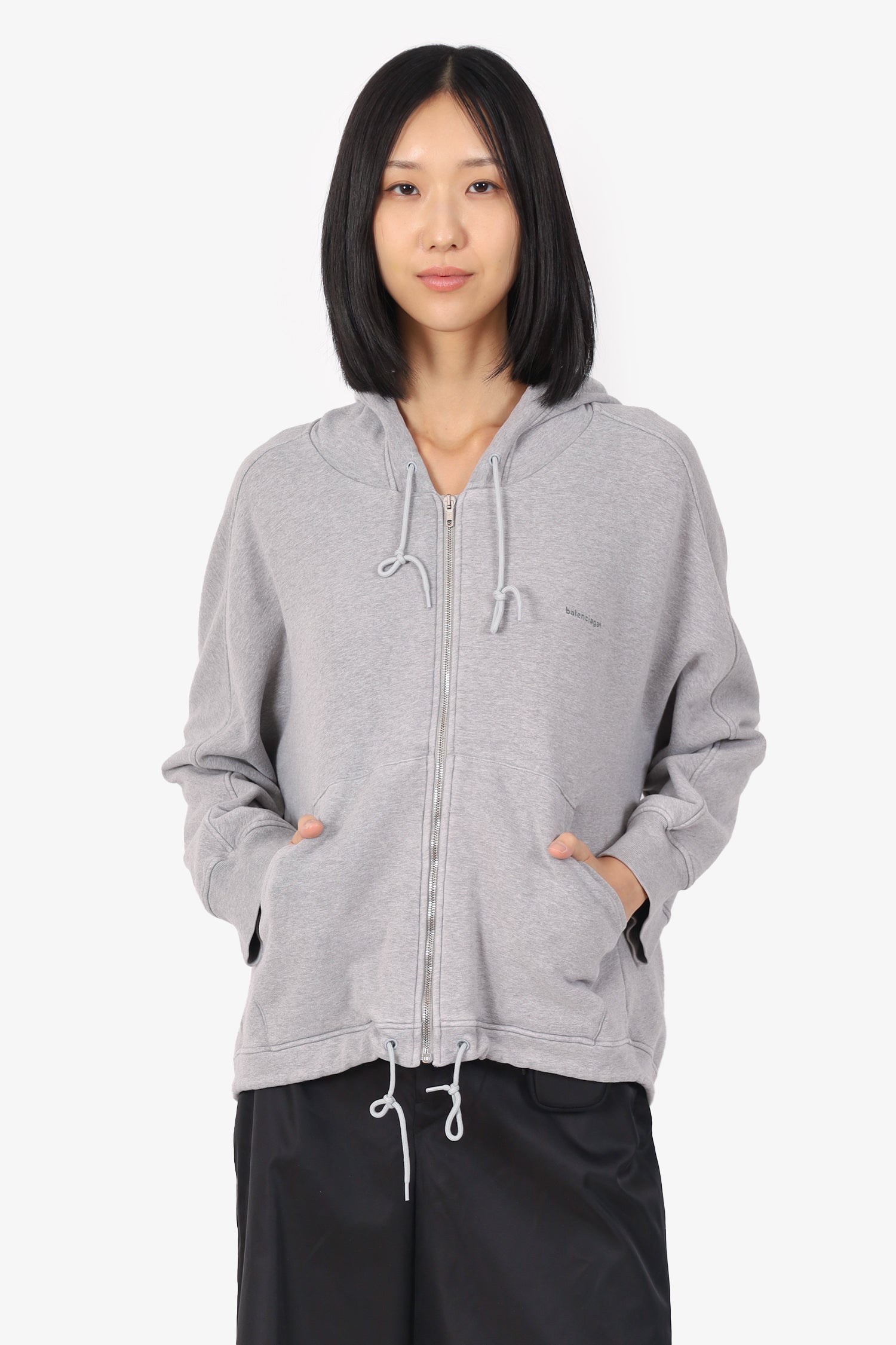 Refresh availabilityBalenciaga Grey Zip Up Hoodie. Pull-on. Front zip closure. Drawstrings at hood and waistline. Silver-tone hardware. Tonal stitching.