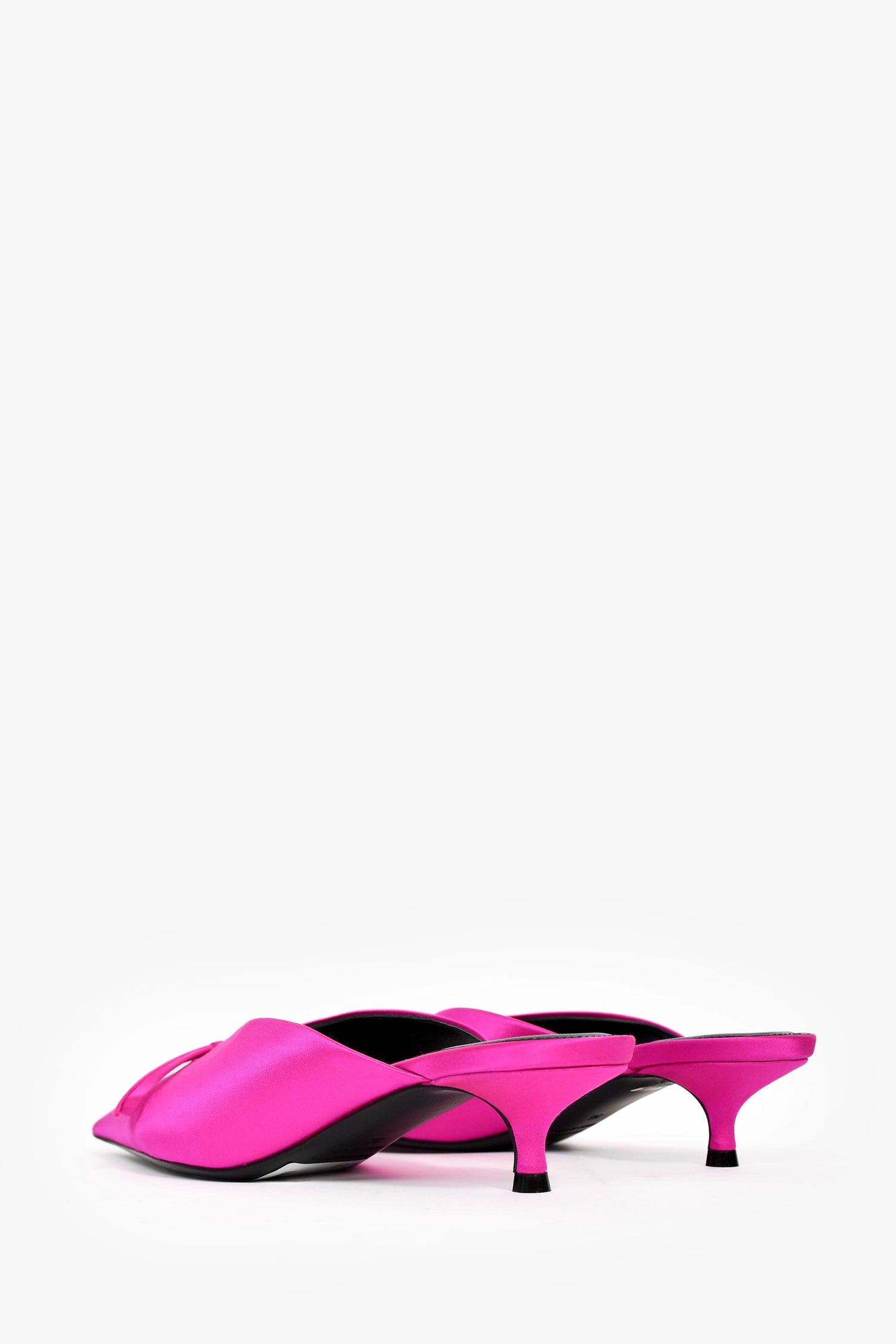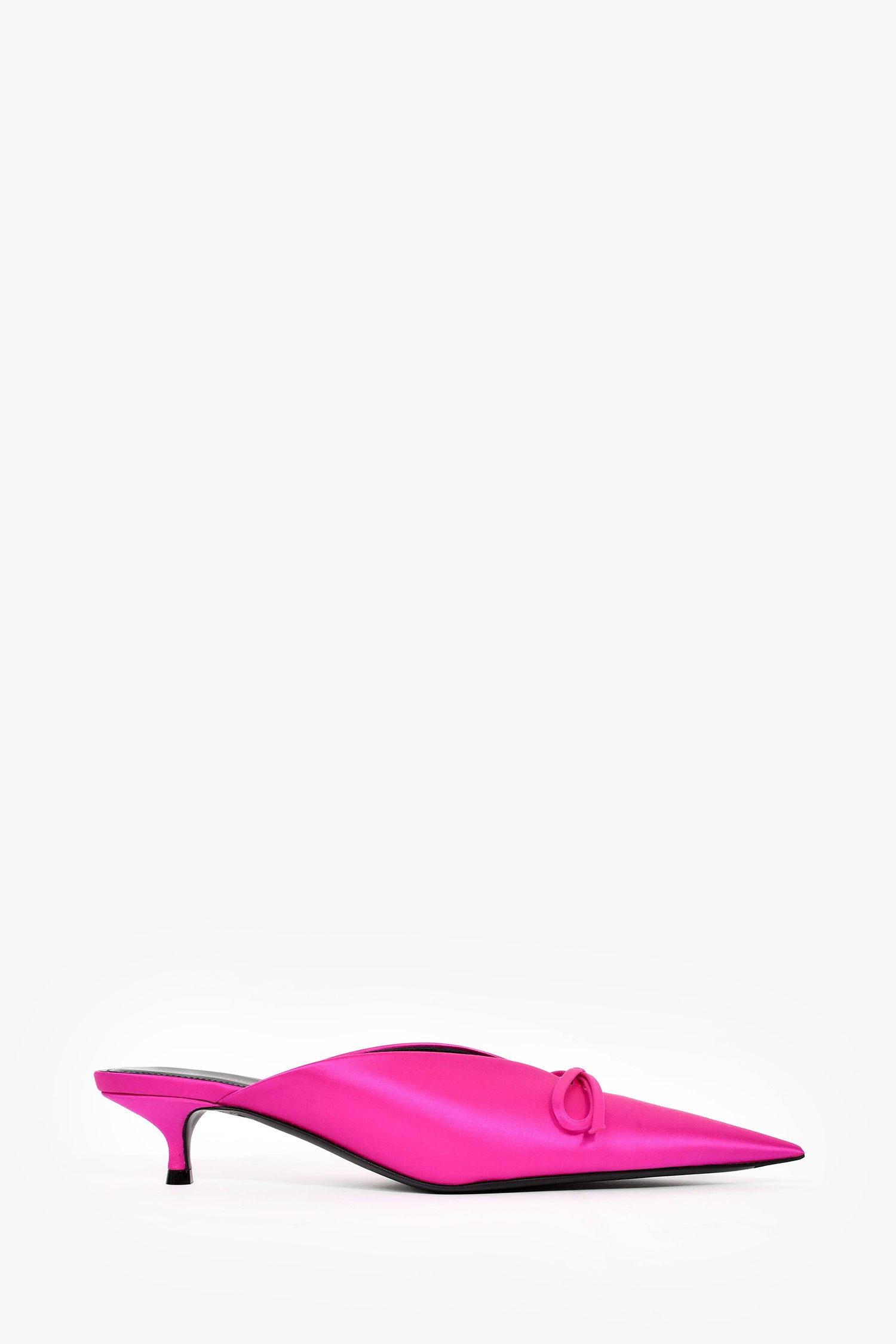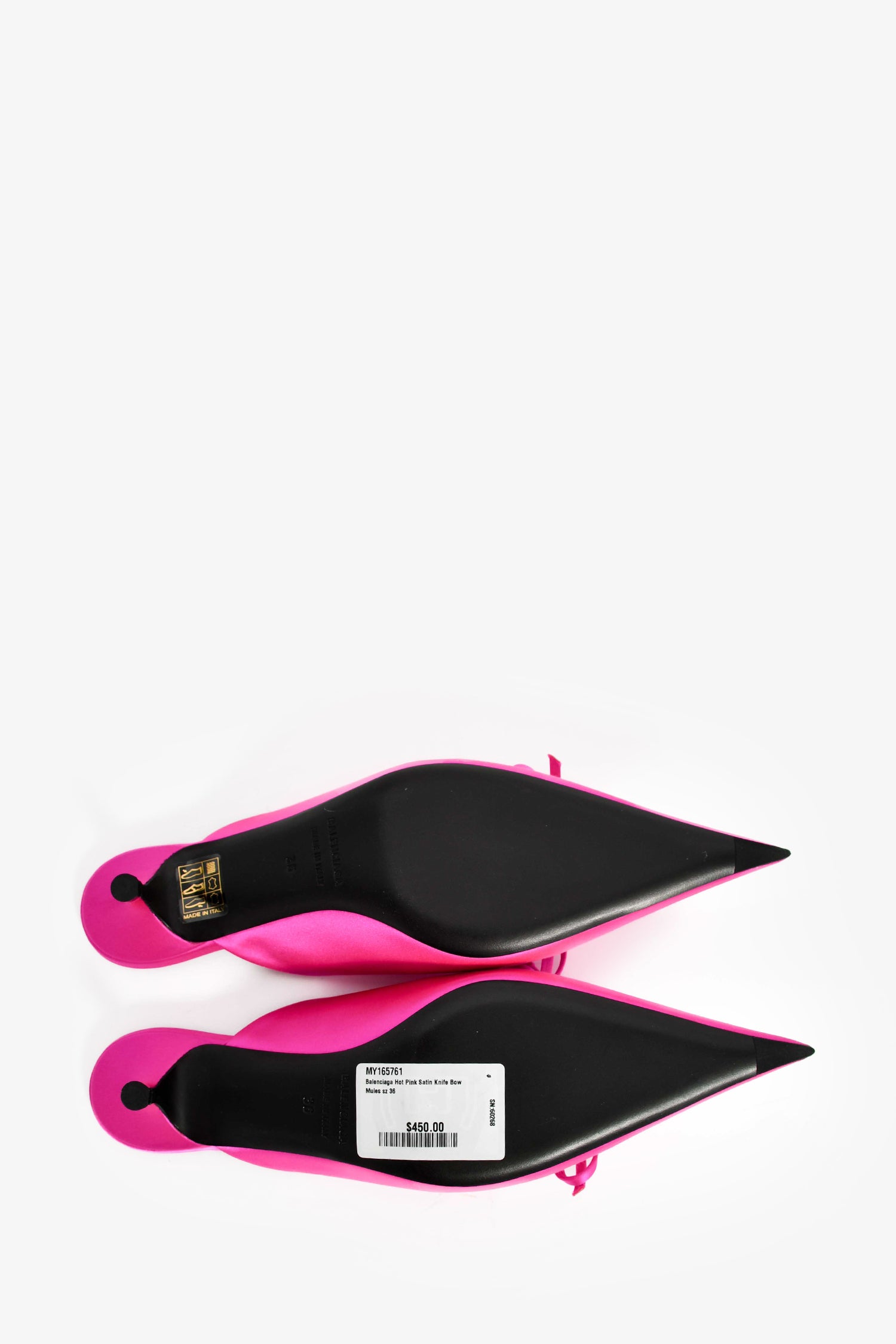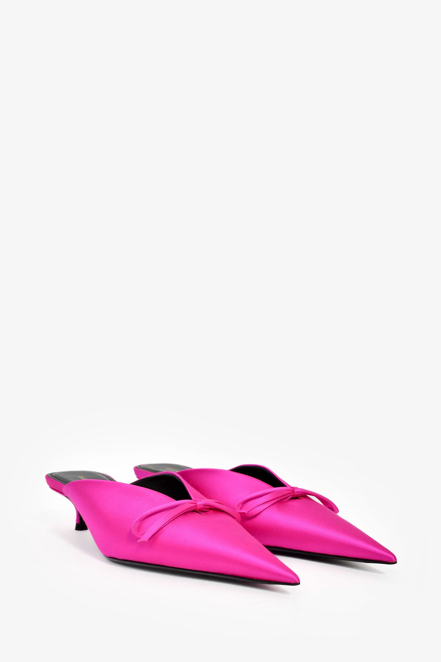 Refresh availabilityBalenciaga Hot Pink Satin Knife Bow Mules. Pointed toe. Leather insole. Tonal stitching.