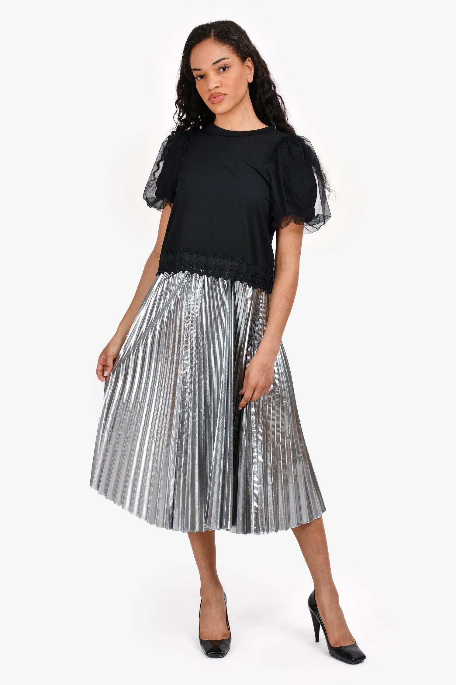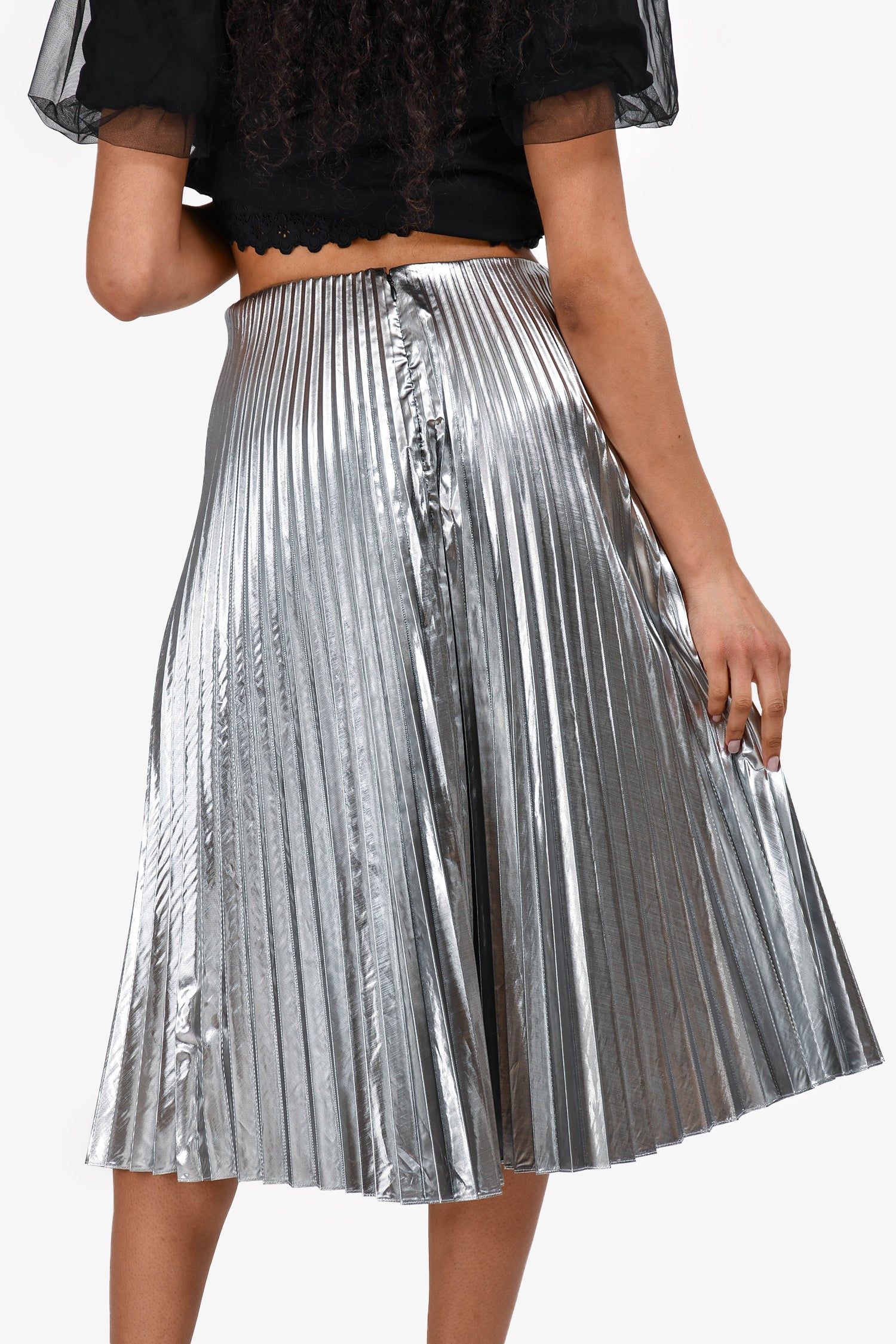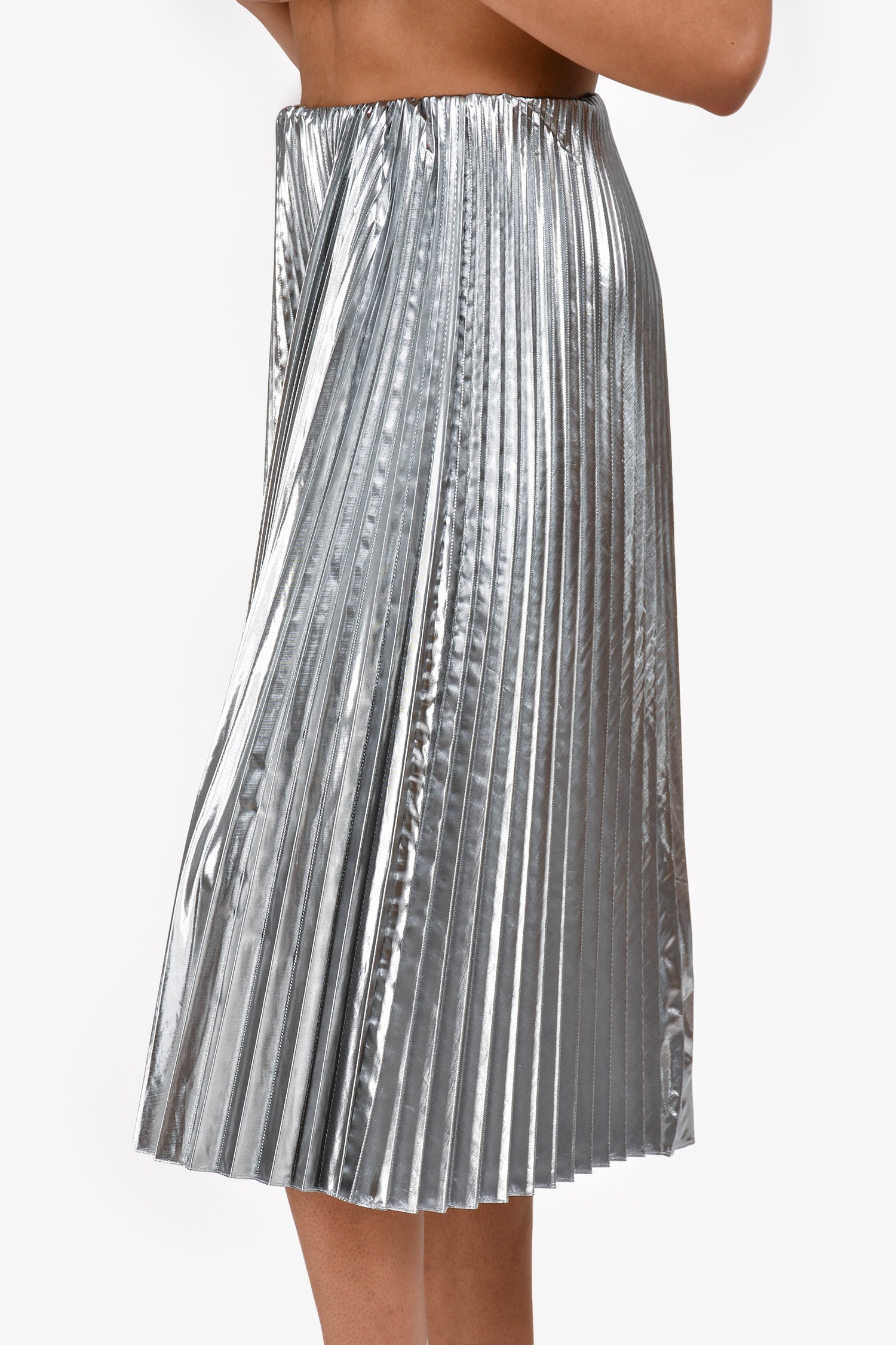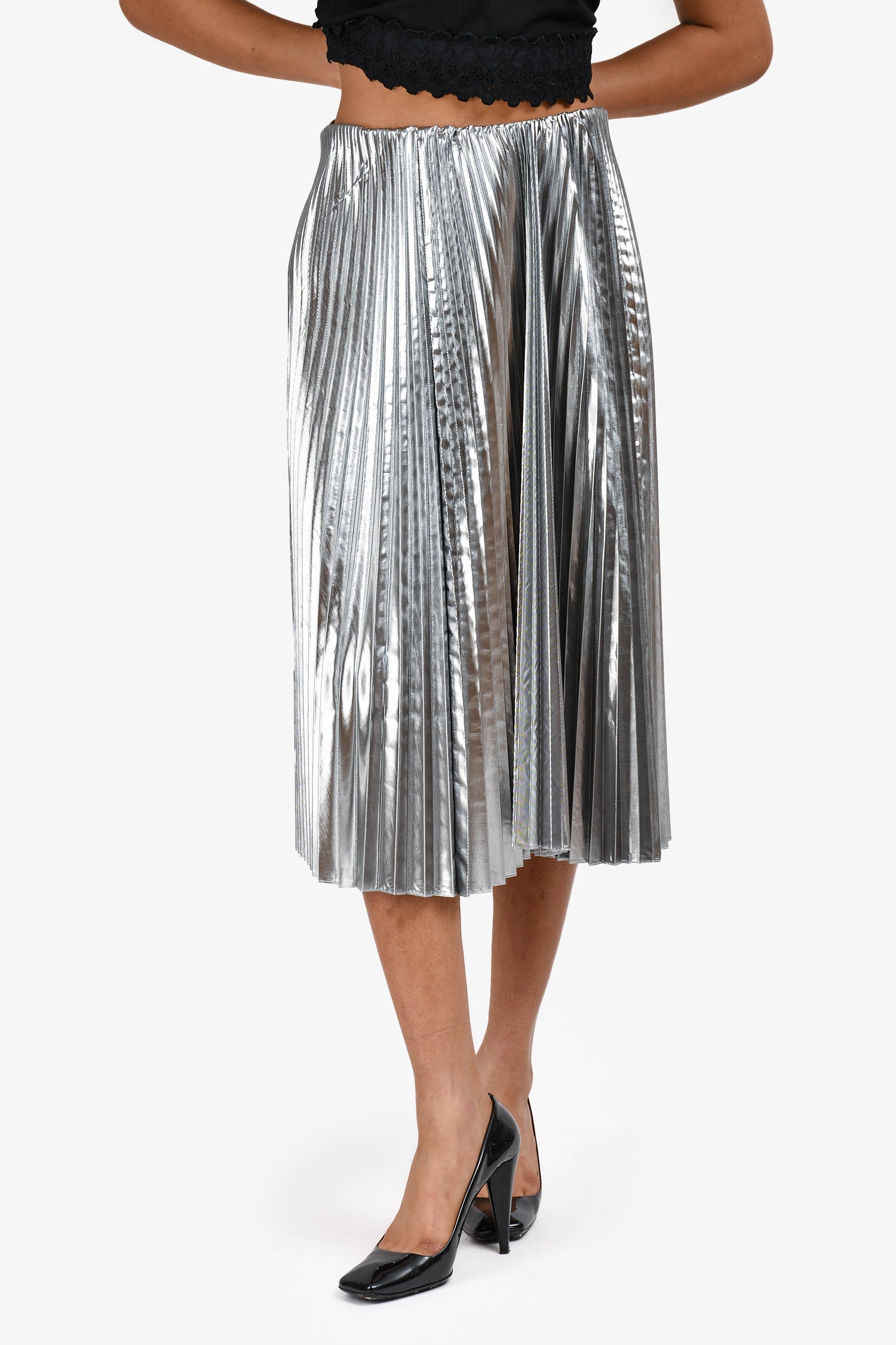 Refresh availabilityBalenciaga Metallic Silver Pleated Midi Skirt. High-rise waist. Back zip closure. Tonal stitching.