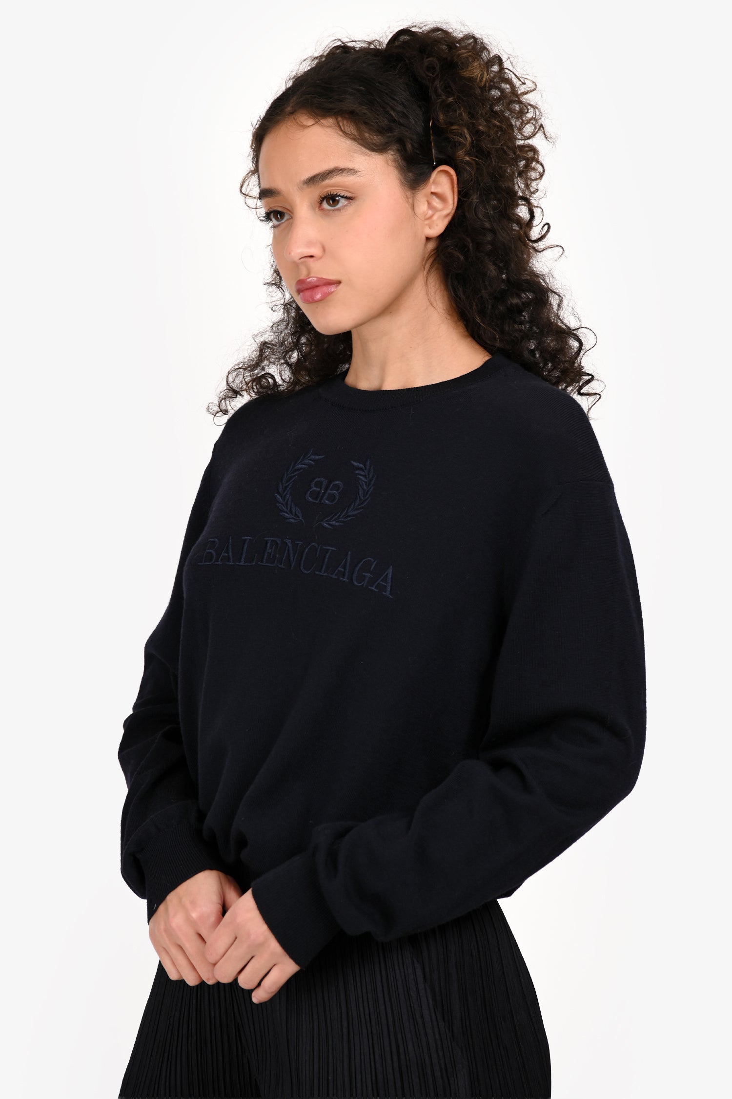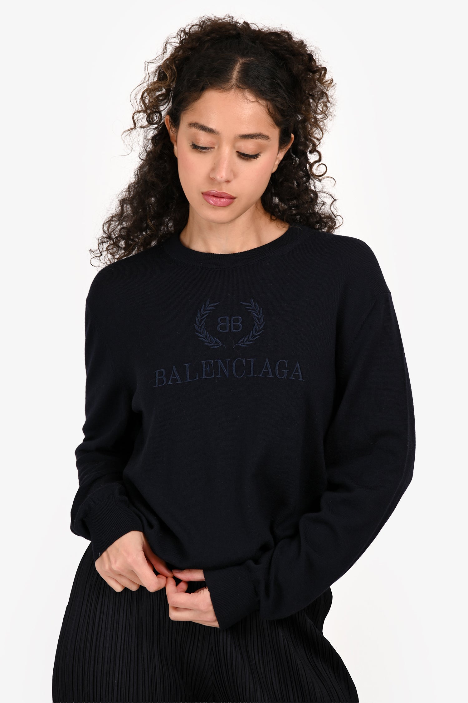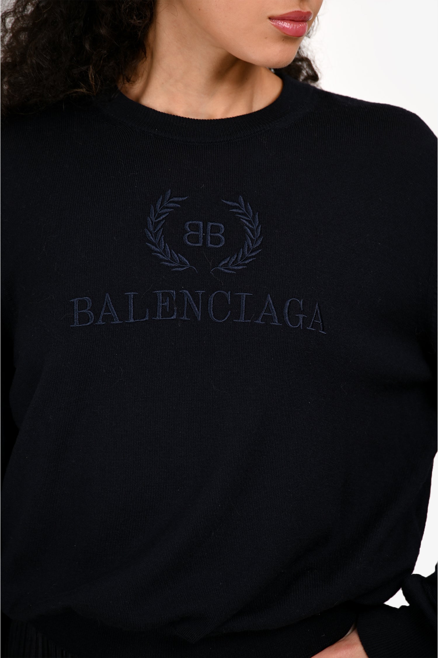 Refresh availabilityBalenciaga Navy Fine Knit Wool Logo Embroidered Sweater. Pull-on. Round neckline. Ribbed neck, cuffs, and hemline. Tonal stitching.