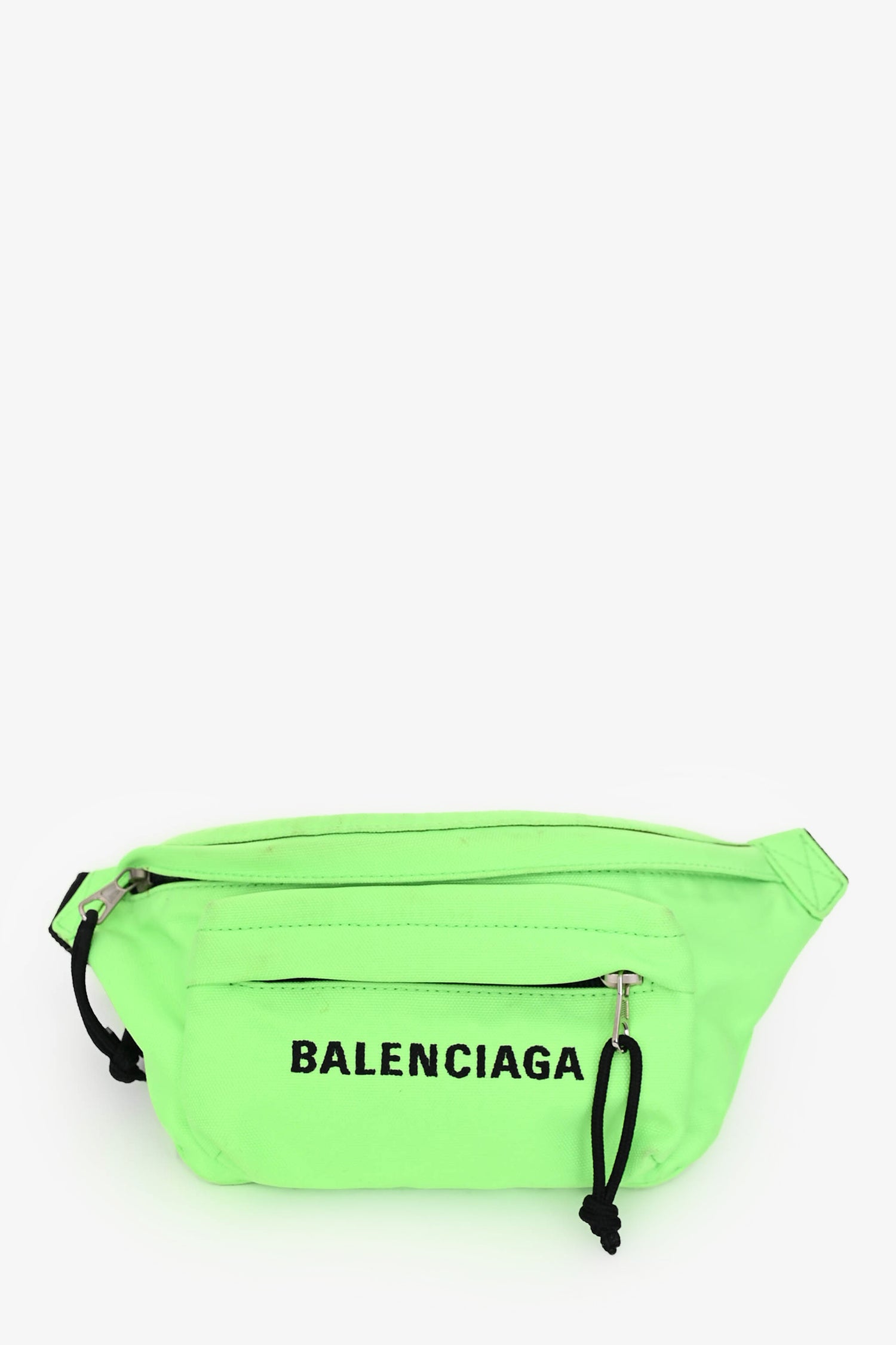 Refresh availabilityBalenciaga Neon Green Canvas Logo Belt Bag. Front zip closure. Adjustable belt strap with buckle fastening. 1 exterior zip pocket. Silver-tone hardware. Tonal stitching.