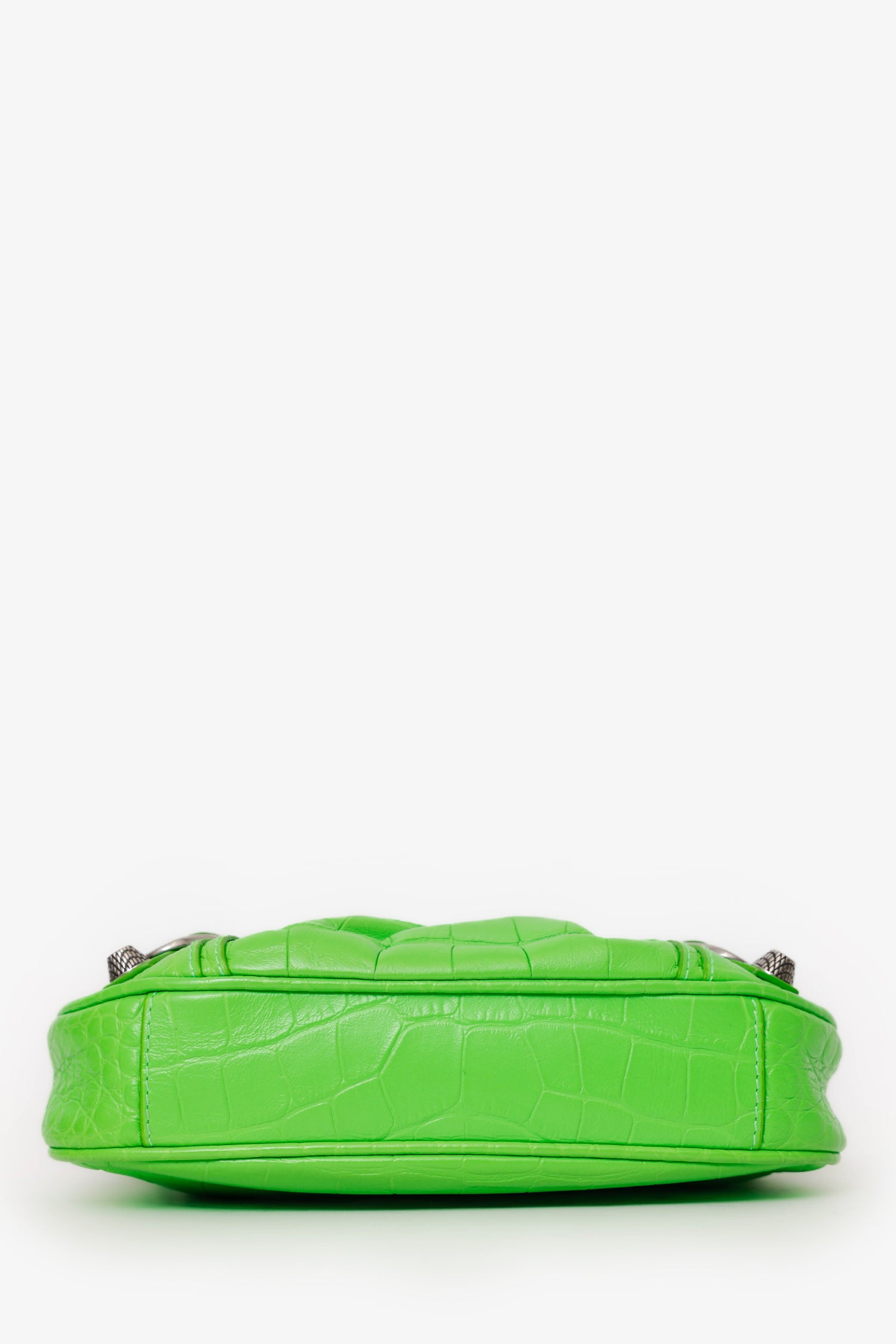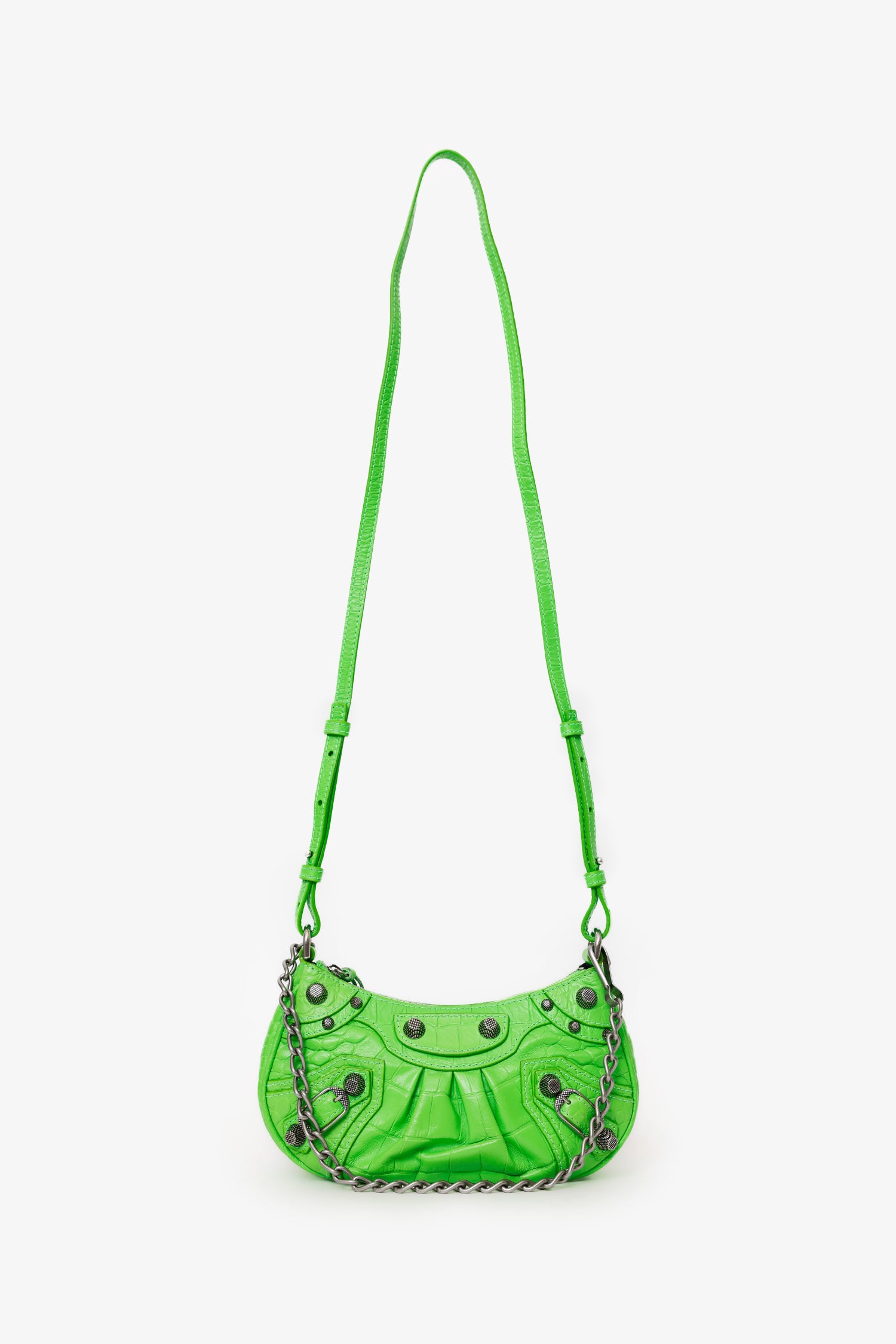 Refresh availabilityBalenciaga Neon Green Croc Embossed Leather Mini Le Cagole Crossbody Bag With Chain. Top zip closure. 2 removable straps; 1 chain link shoulder, and 1 leather crossbody. Lined interior with 2 rear slip pockets. Silver-tone hardware. Tonal stitching.