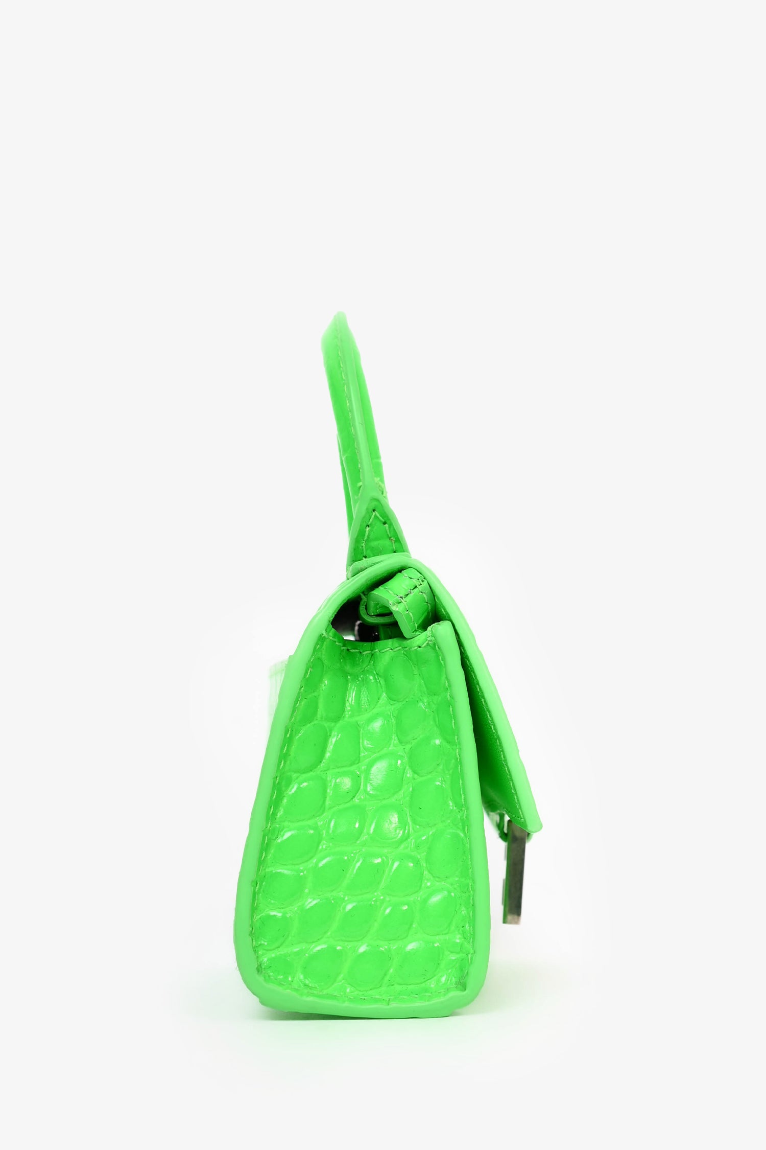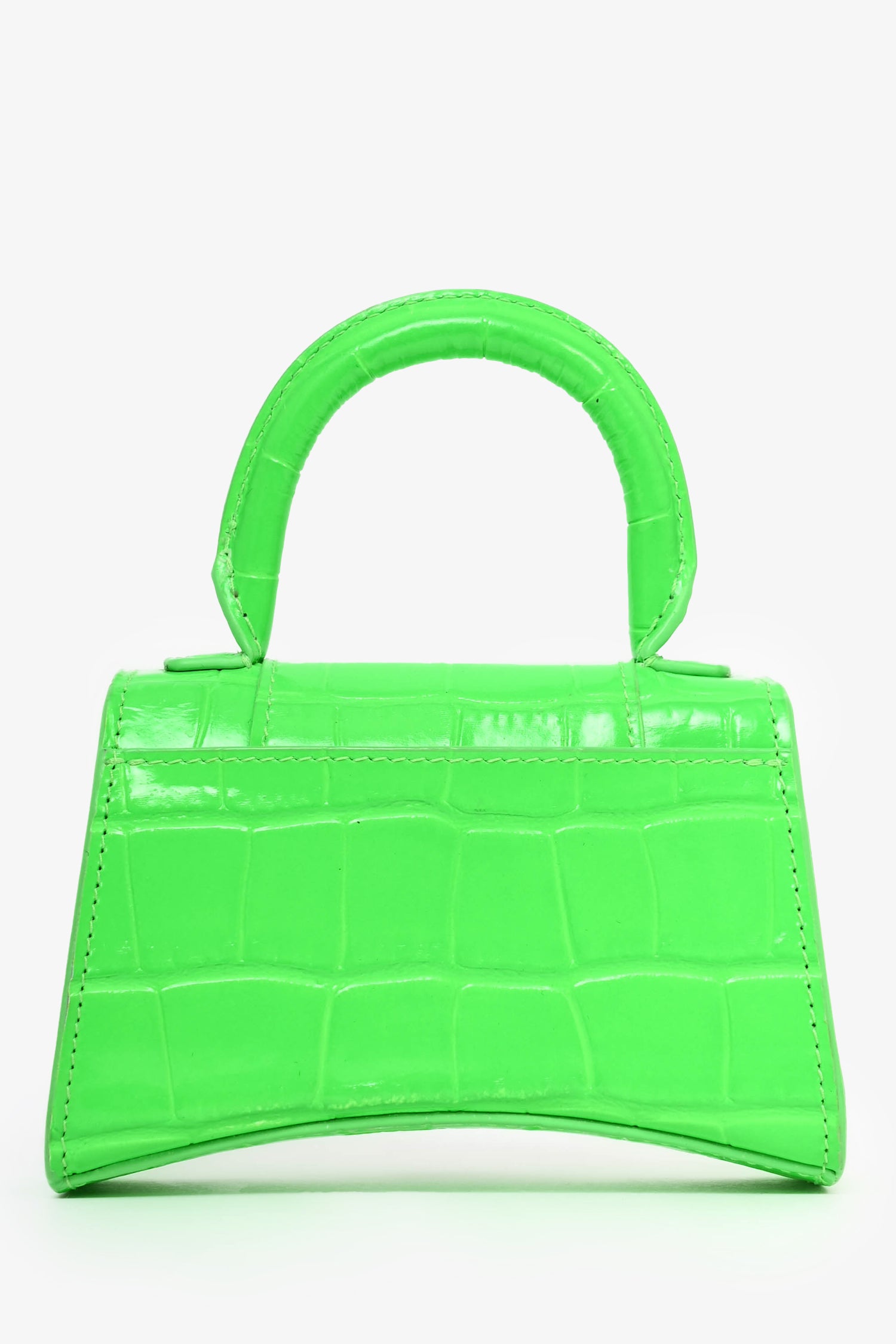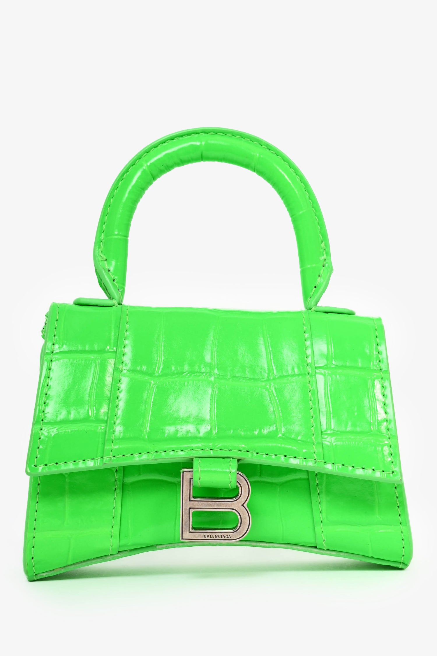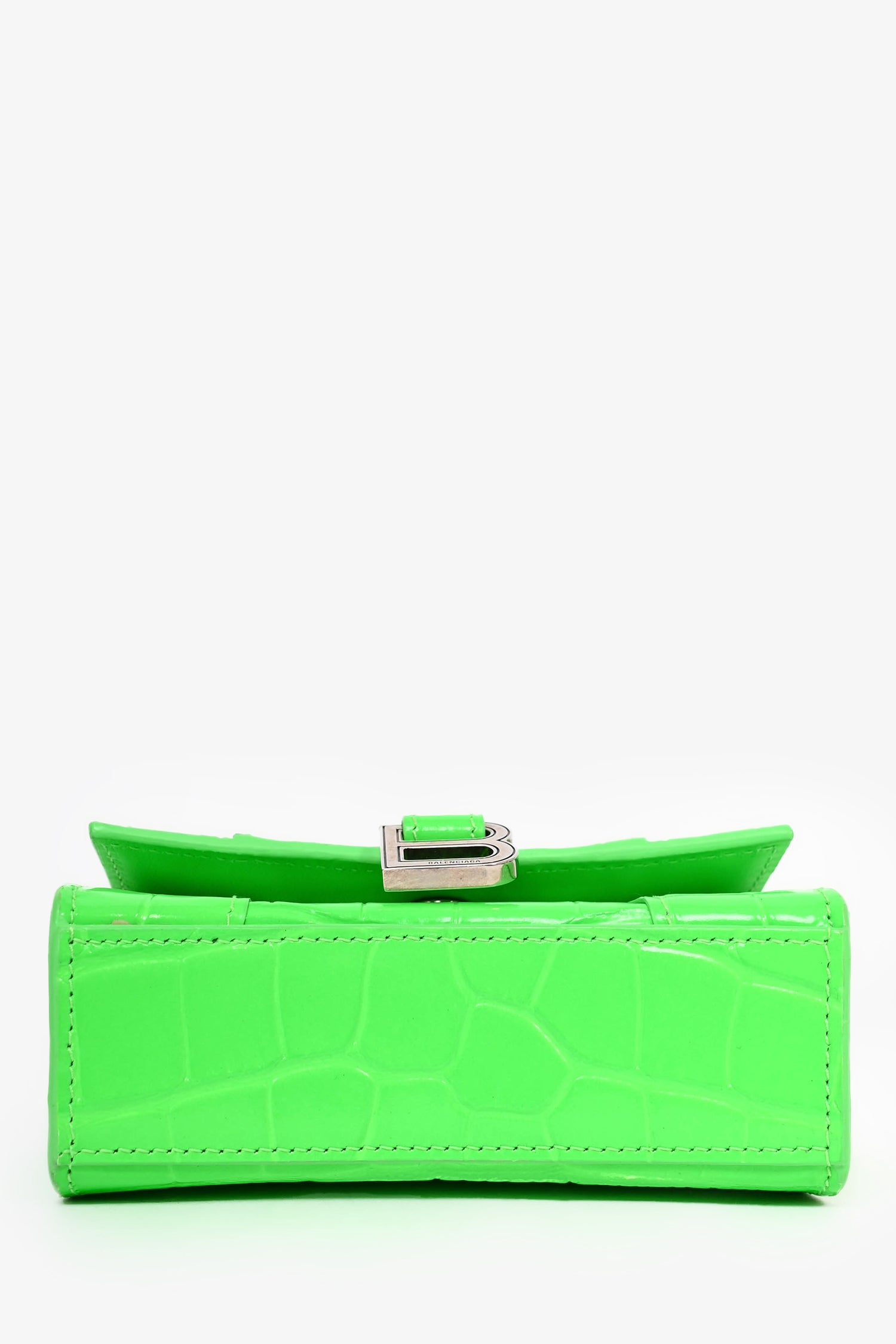 Refresh availabilityBalenciaga Neon Green Croc Embossed Nano Hourglass Crossbody. Fold-over flap with a snap closure. Silver-tone hardware. Single rolled top handle. Single adjustable crossbody strap. Tonal stitching.