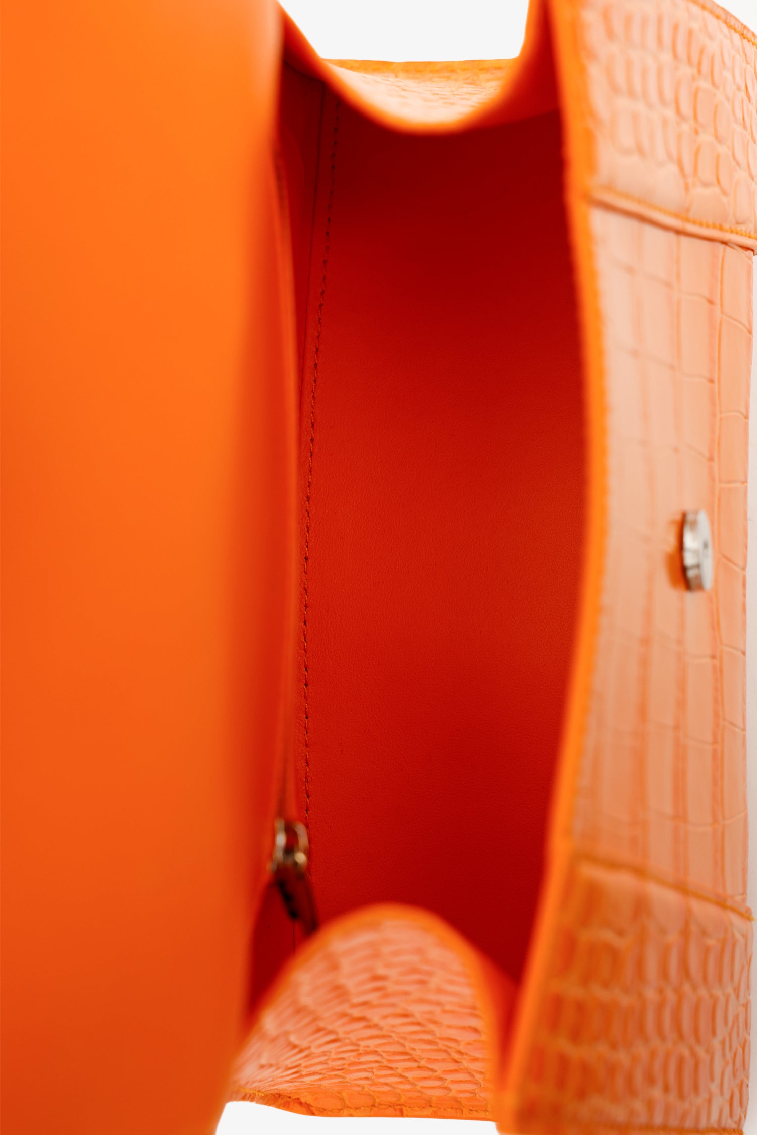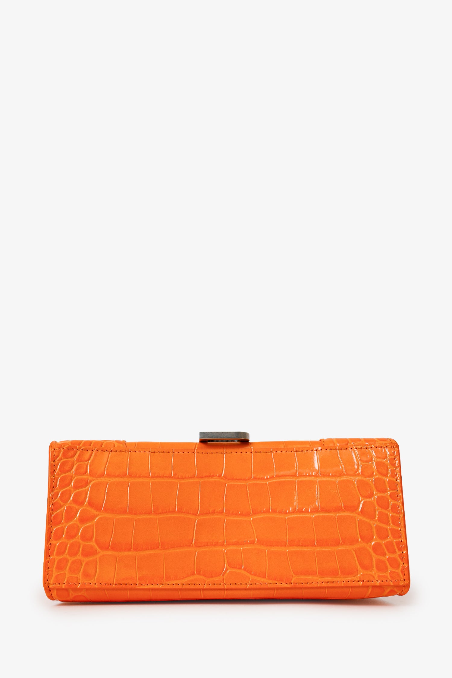 Refresh availabilityBalenciaga Orange Croc Embossed Small Hourglass Top Handle Bag With Strap. Front fold-over flap with snap-button-up closure. Top handle Removable shoulder strap with adjustable pull-through buckle closure. Single exterior rear slip pocket. Lined interior with single zip-up pocket. Gunmetal-tone hardware. Tonal stitching.