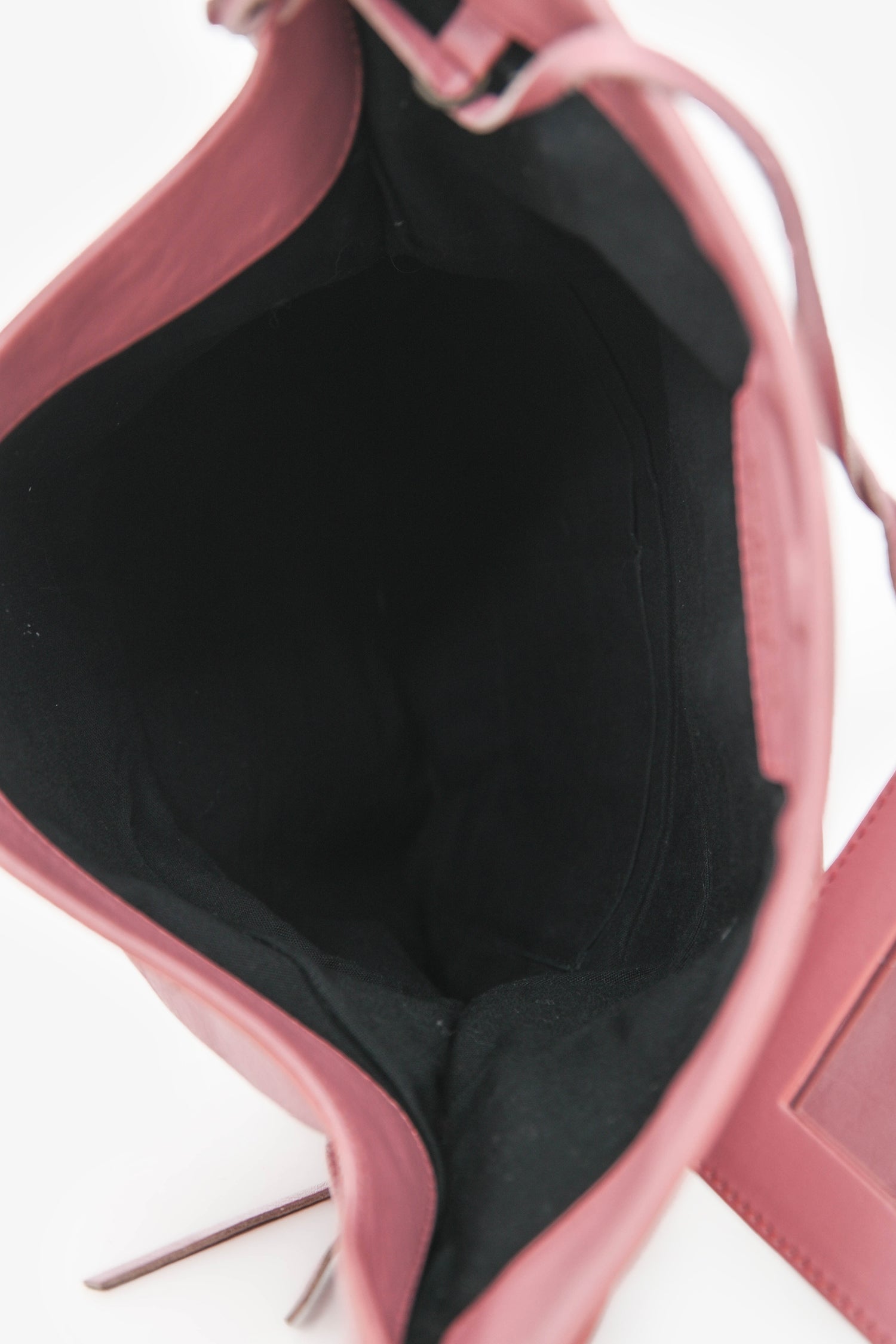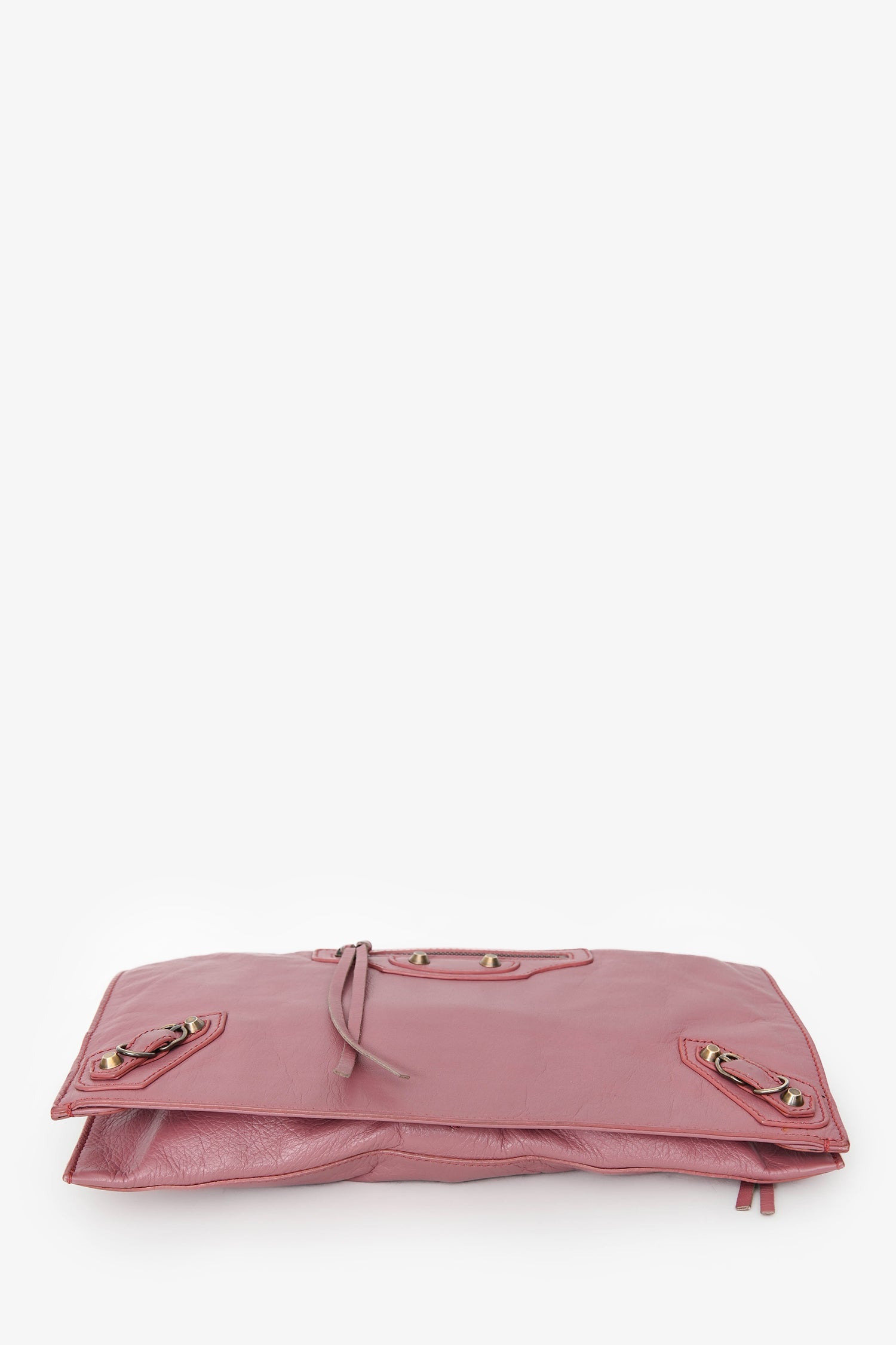 Refresh availabilityBalenciaga Pink Leather Envelope Clutch. Fold-over flap with magnetic button closure. 2 exterior zip pockets; 1 in the front, 1 in the rear. Textile-line interior. Single interior compartment with detachable mirror. Bronze-tone hardware. Tonal stitching.