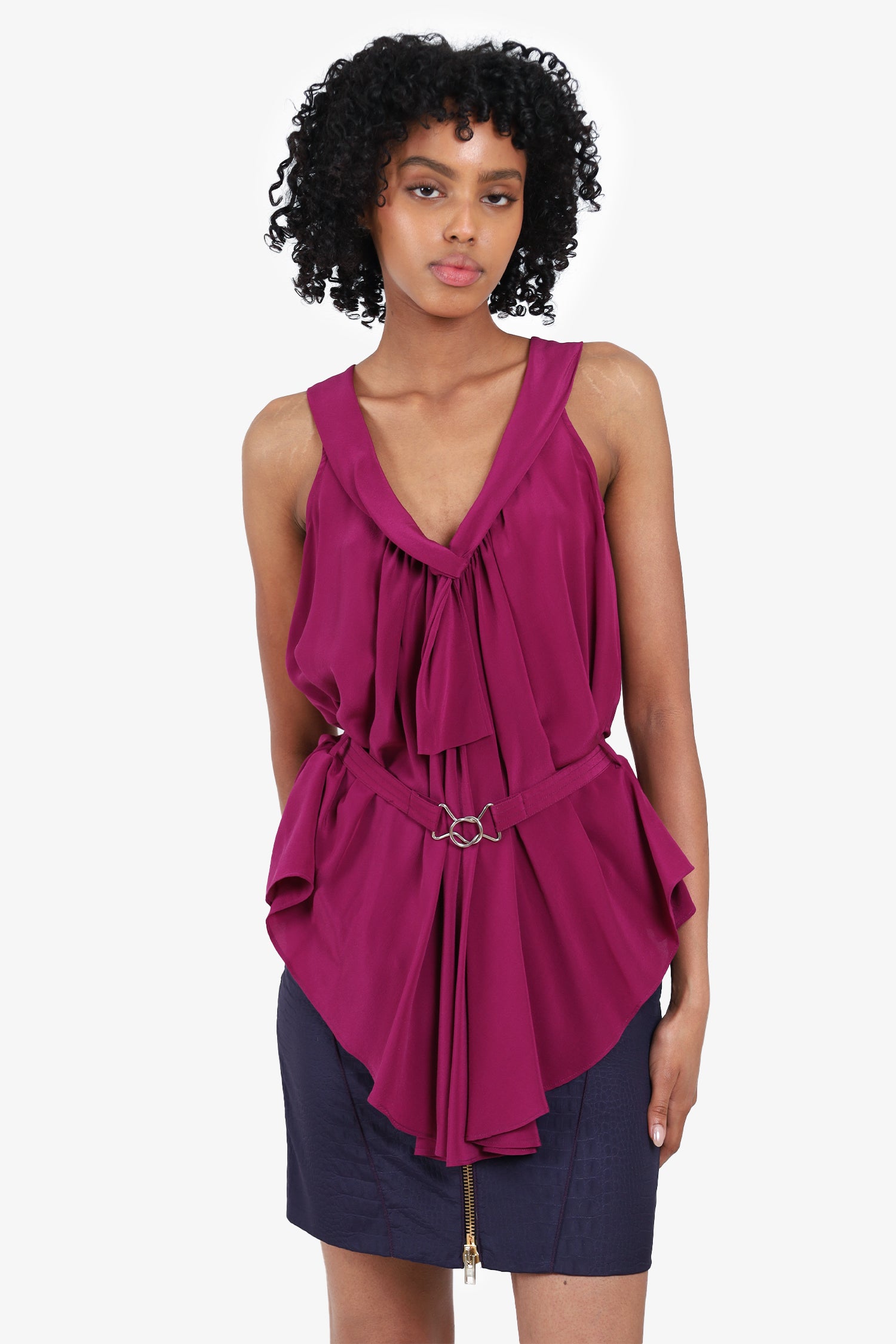 Refresh availabilityBalenciaga Purple Silk Pleated Belted Blouse. V-neckline. Pull-on. Ruffle detail throughout. Tonal stitching.