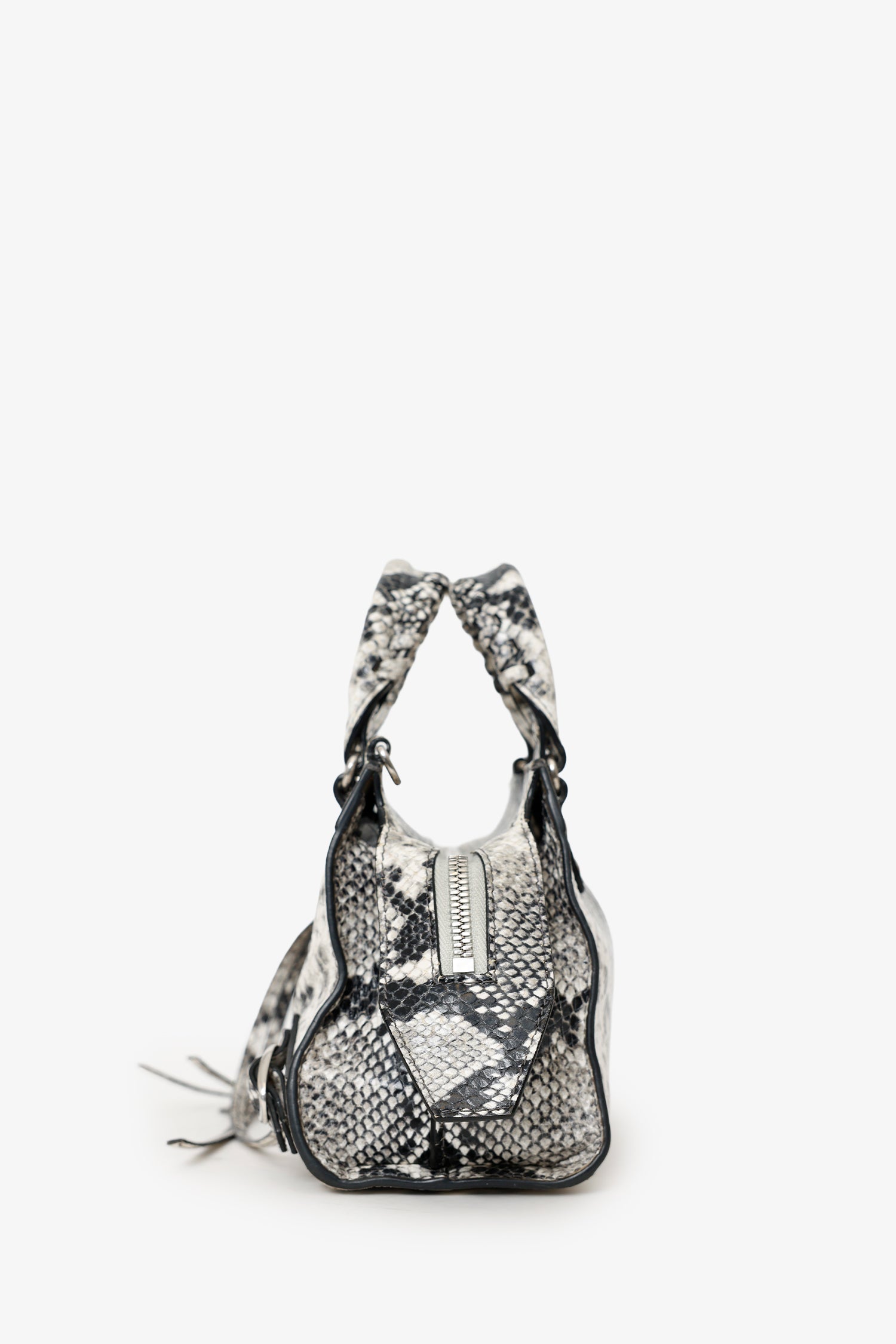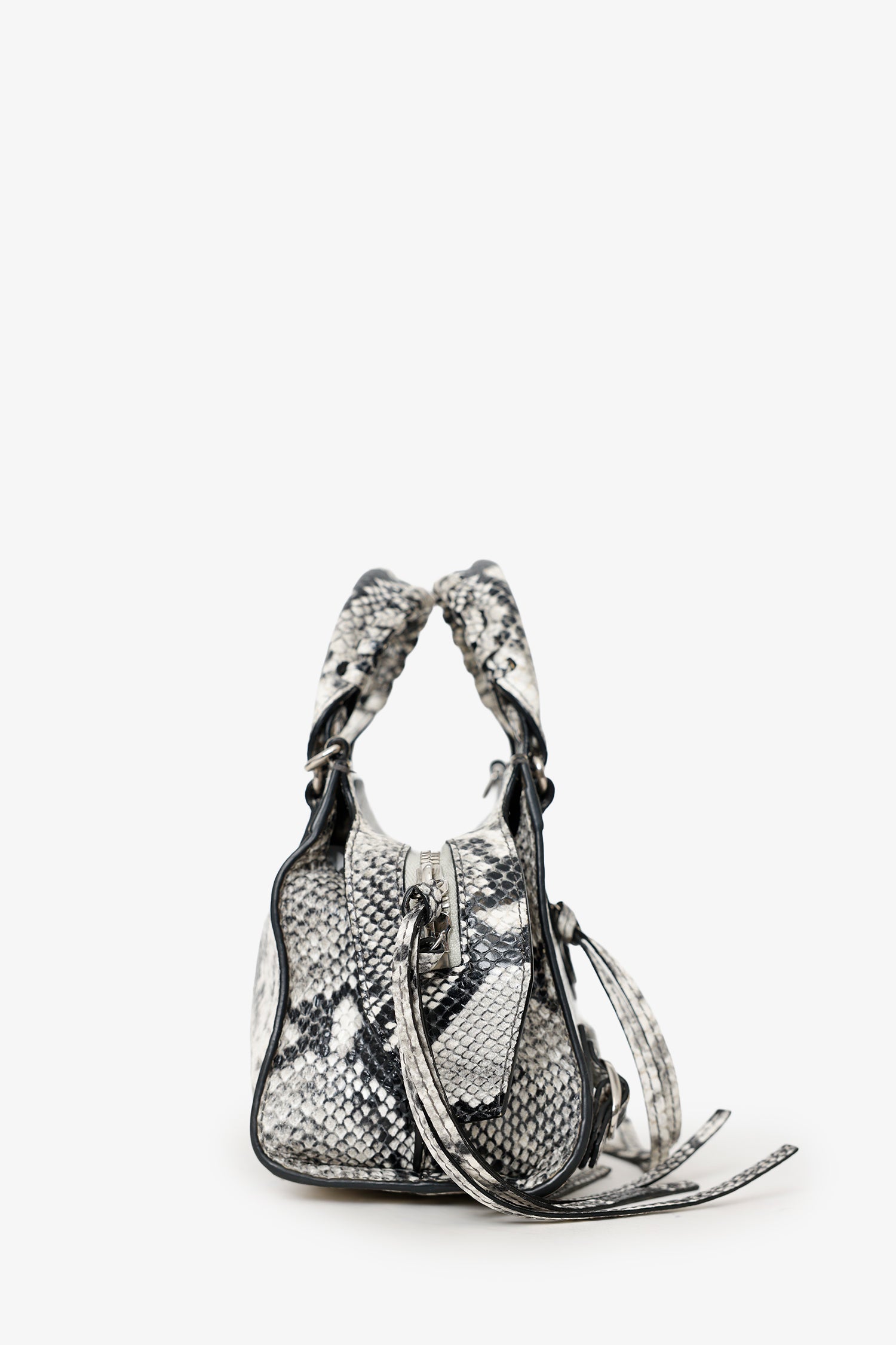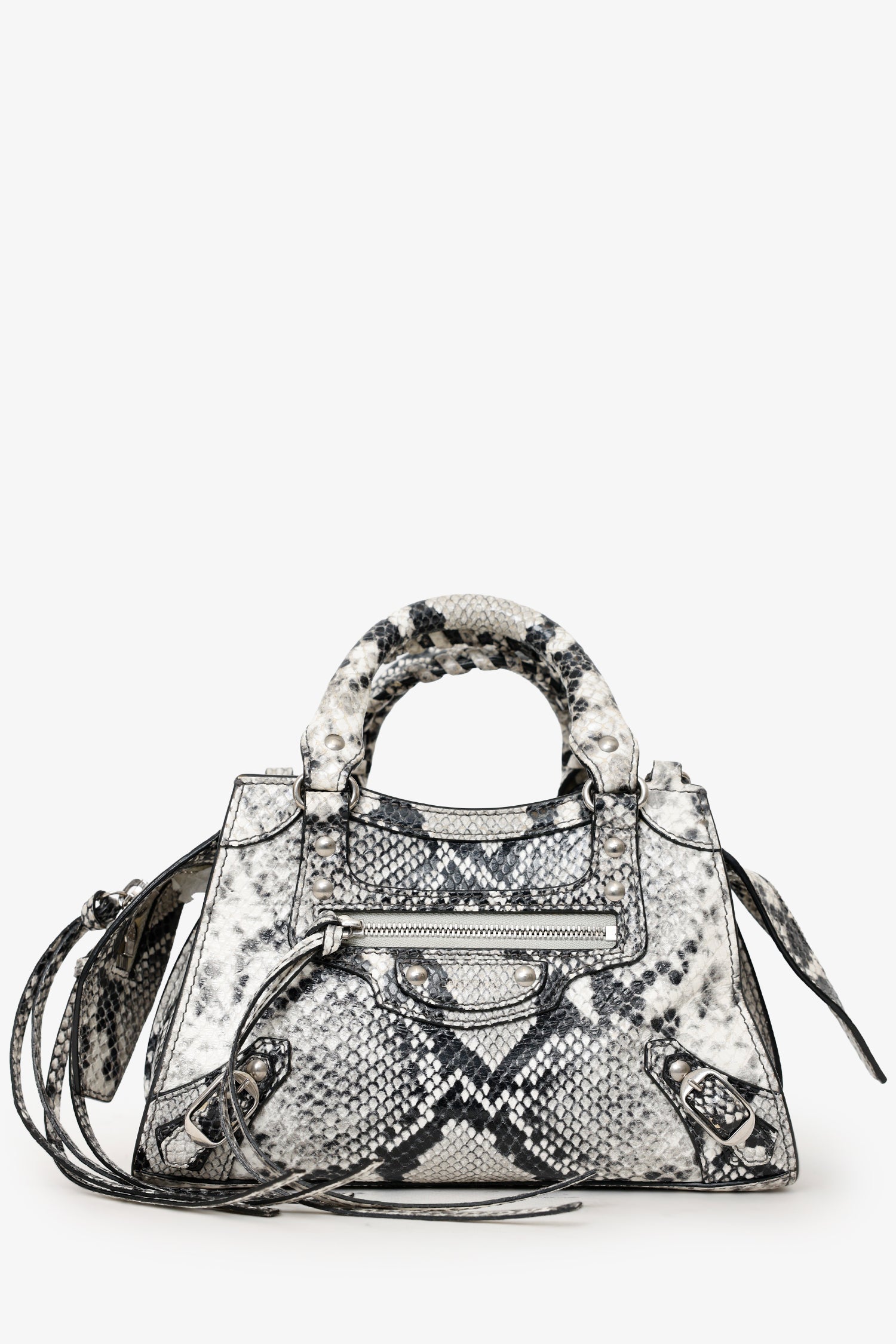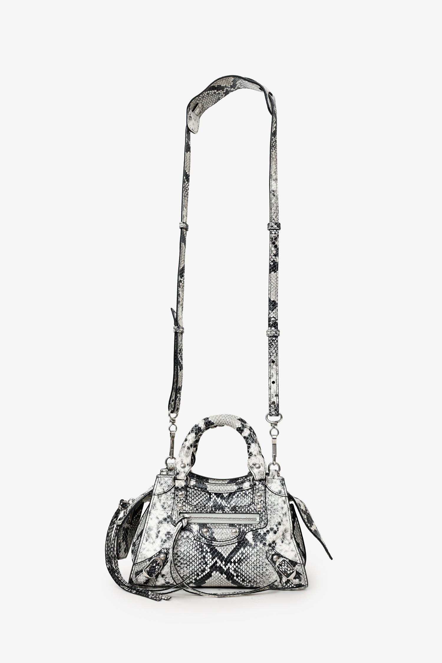 Refresh availabilityBalenciaga Python Embossed Leather Neo Classic Mini City Bag. Top zip closure. Twin top handles. Removable and adjustable push-pin crossbody strap with clasp closure. Single front exterior pocket with zip pocket. 2 exterior d-rings. Lined interior. Single interior slip pocket. Silver-tone hardware. Tonal stitching.