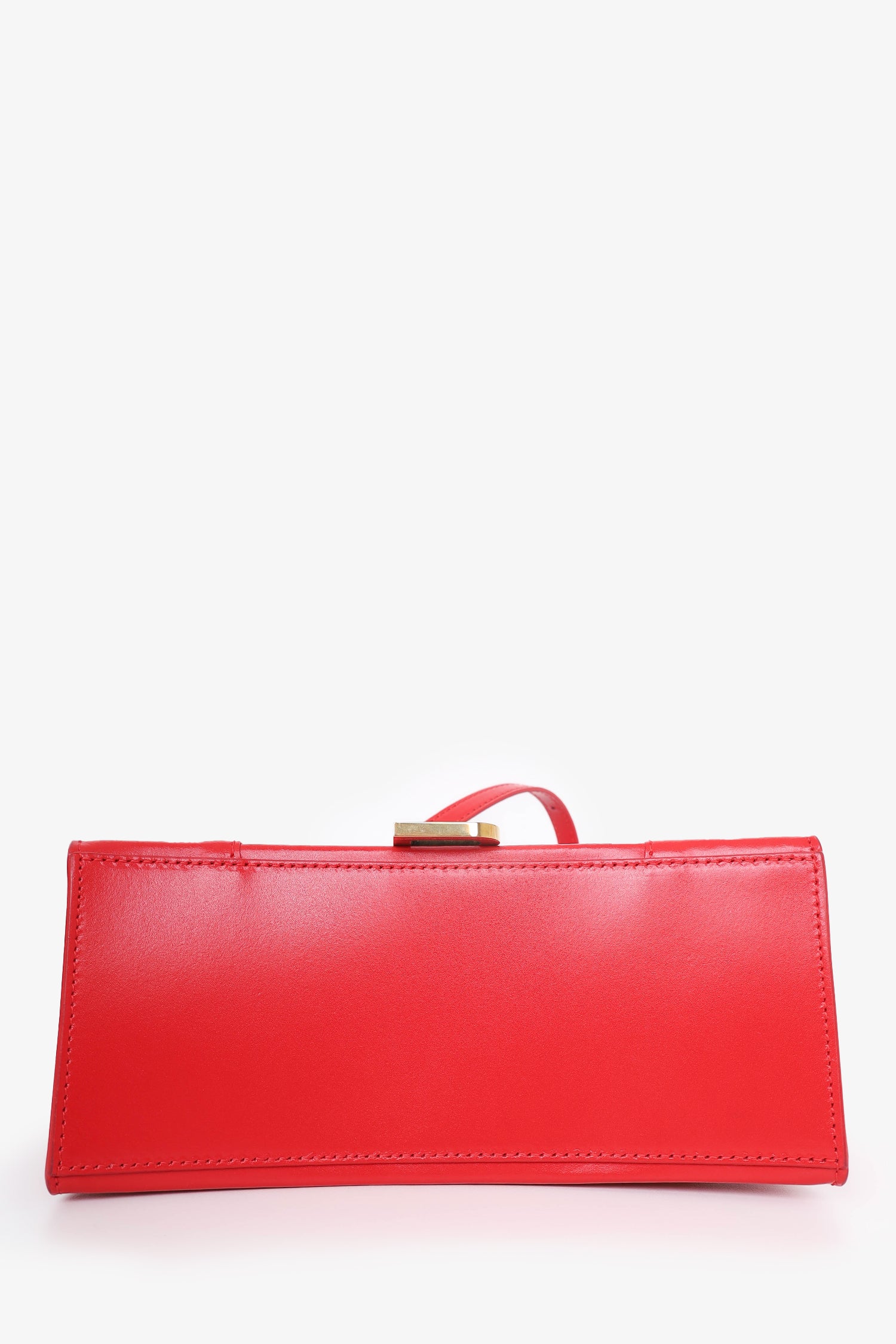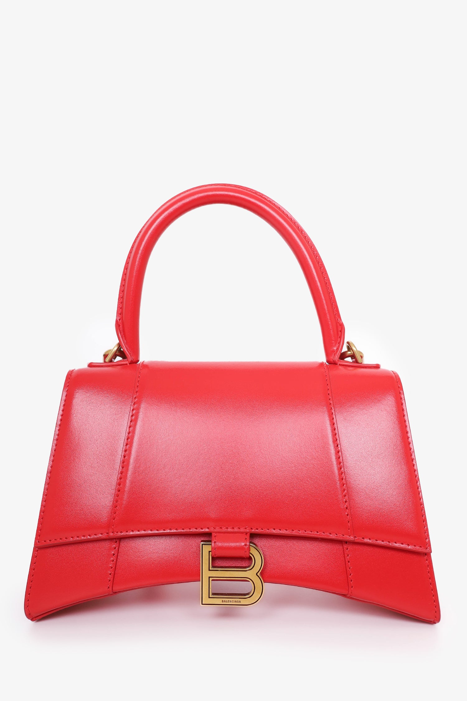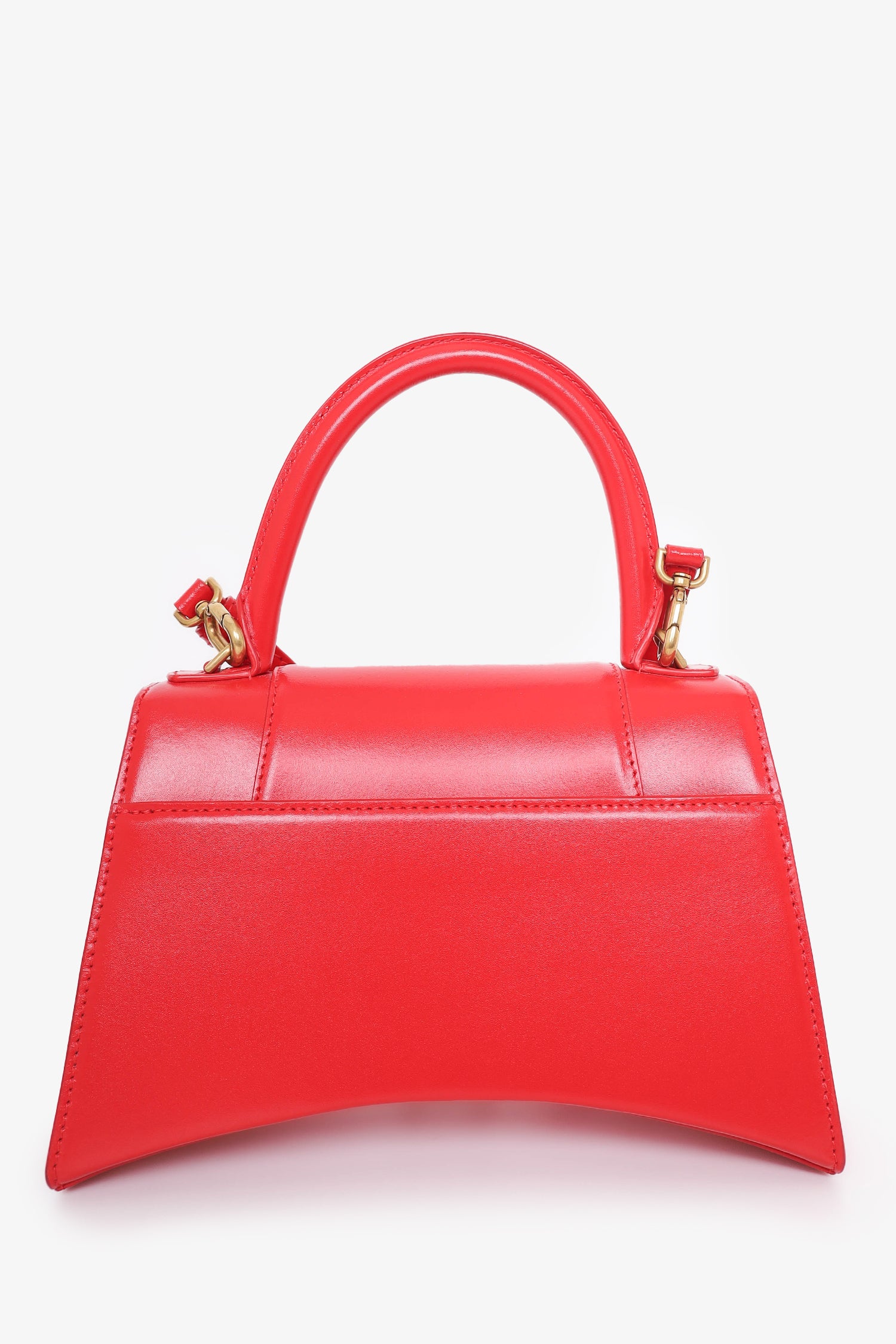 Refresh availabilityBalenciaga Red Leather Hourglass S Top Handle Bag with strap hooks. Front fold-over flap with magnetic button closure. Open leather interior with single wall zip pocket. Comes with a removable crossbody strap. Single rear slip pocket. Gold-tone hardware. Tonal stitching.