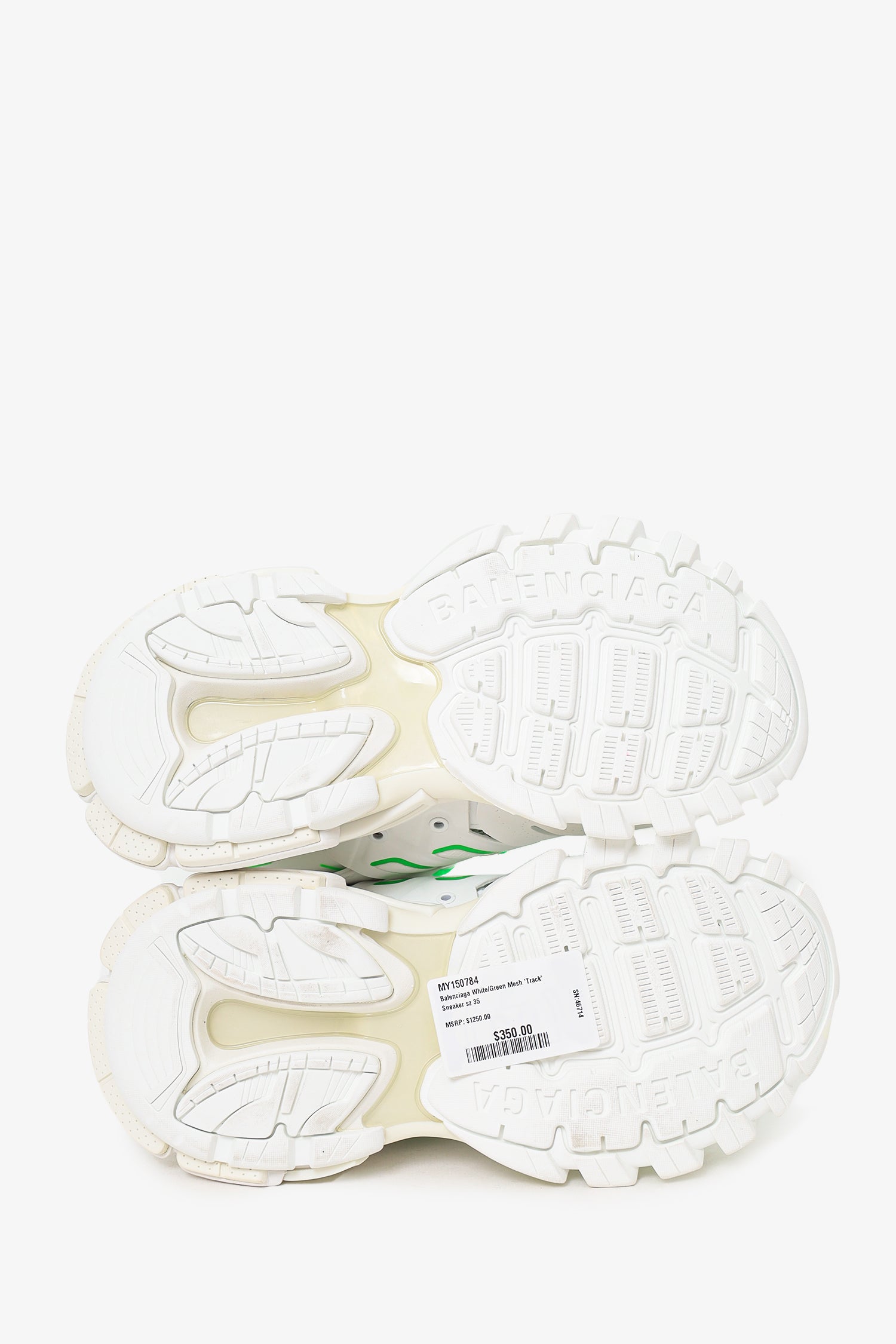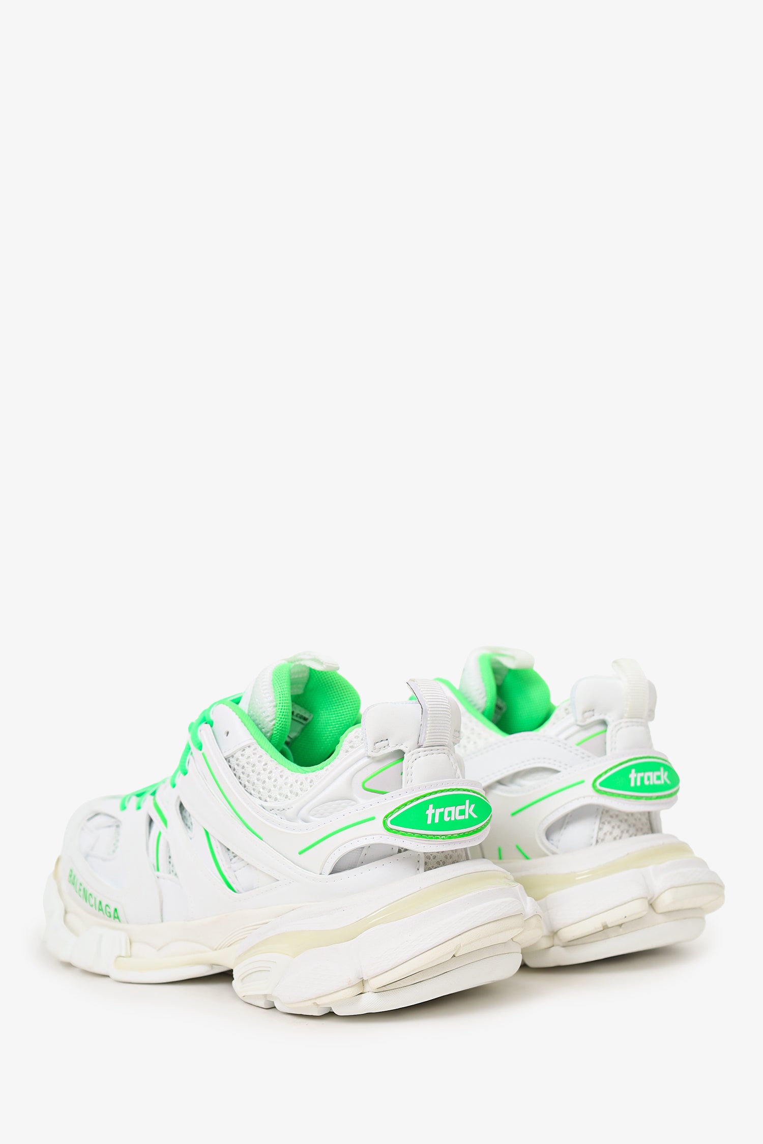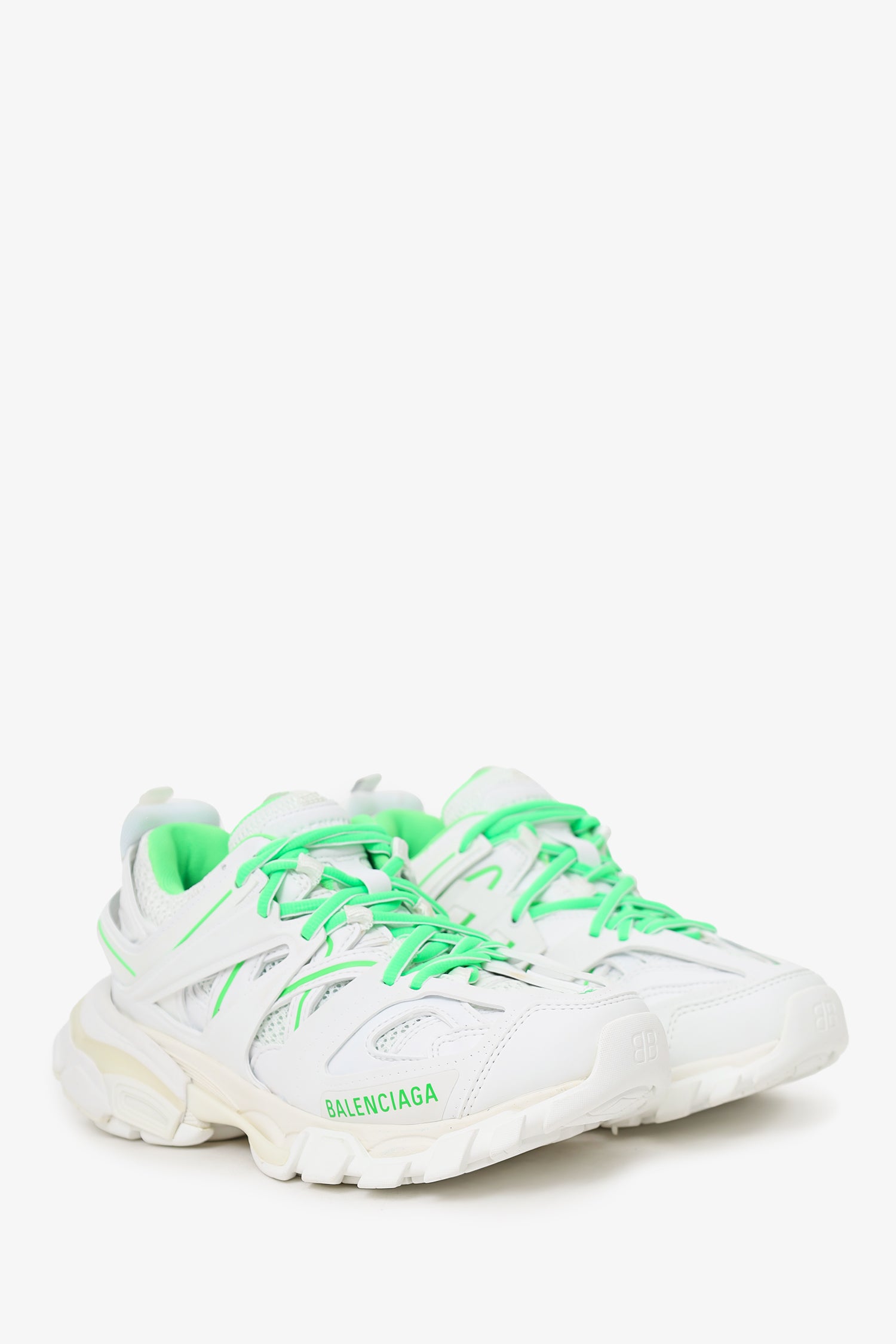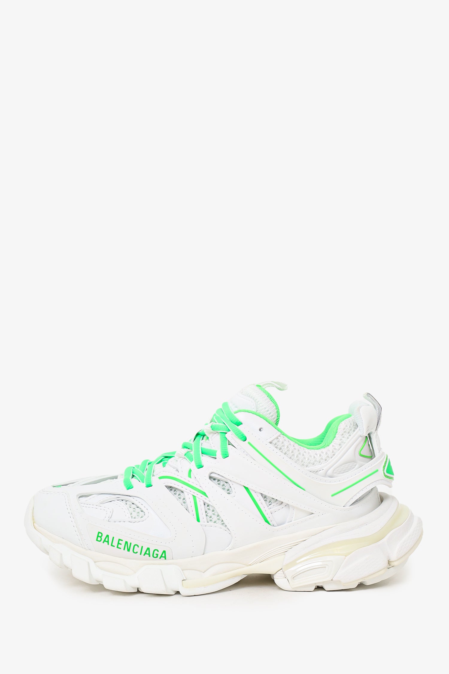 Refresh availabilityBalenciaga White/Green Mesh 'Track' Sneaker. Lace up closure. Round toe. Tonal stitching.