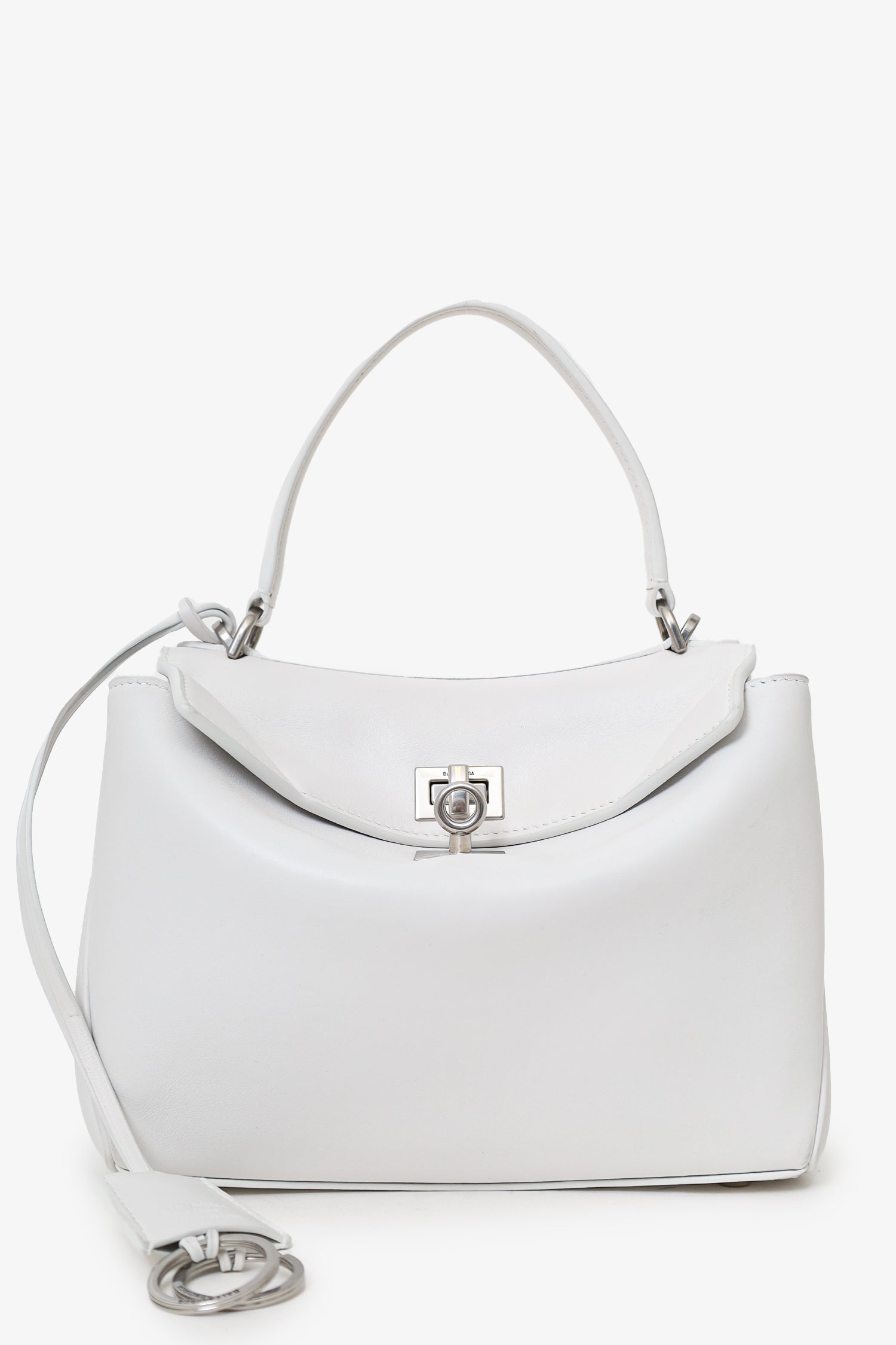 Refresh availabilityBalenciaga White Leather 'Rodeo' Mini Top Handle Bag With Strap. Front fold-over flap with turn-lock closure. Top handle. Removable strap with lobster clasp closure. Potective studs on bottom. 2 rear exterior slip pockets. 2 interior compartments; single rear slip pocket in rear compartment. Leather-lined interior. Includes removable clochette. Silver-tone hardware. Tonal stitching.
