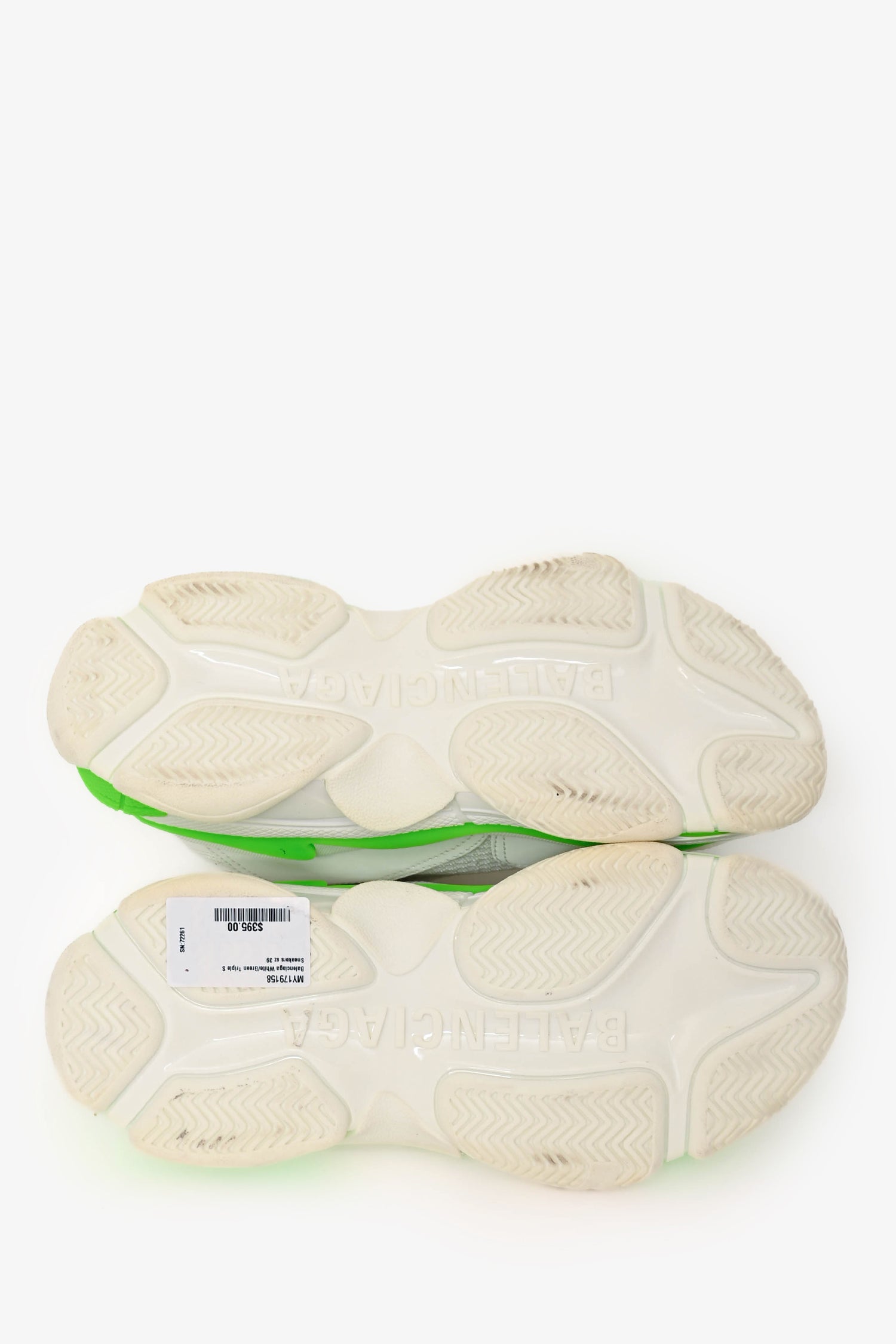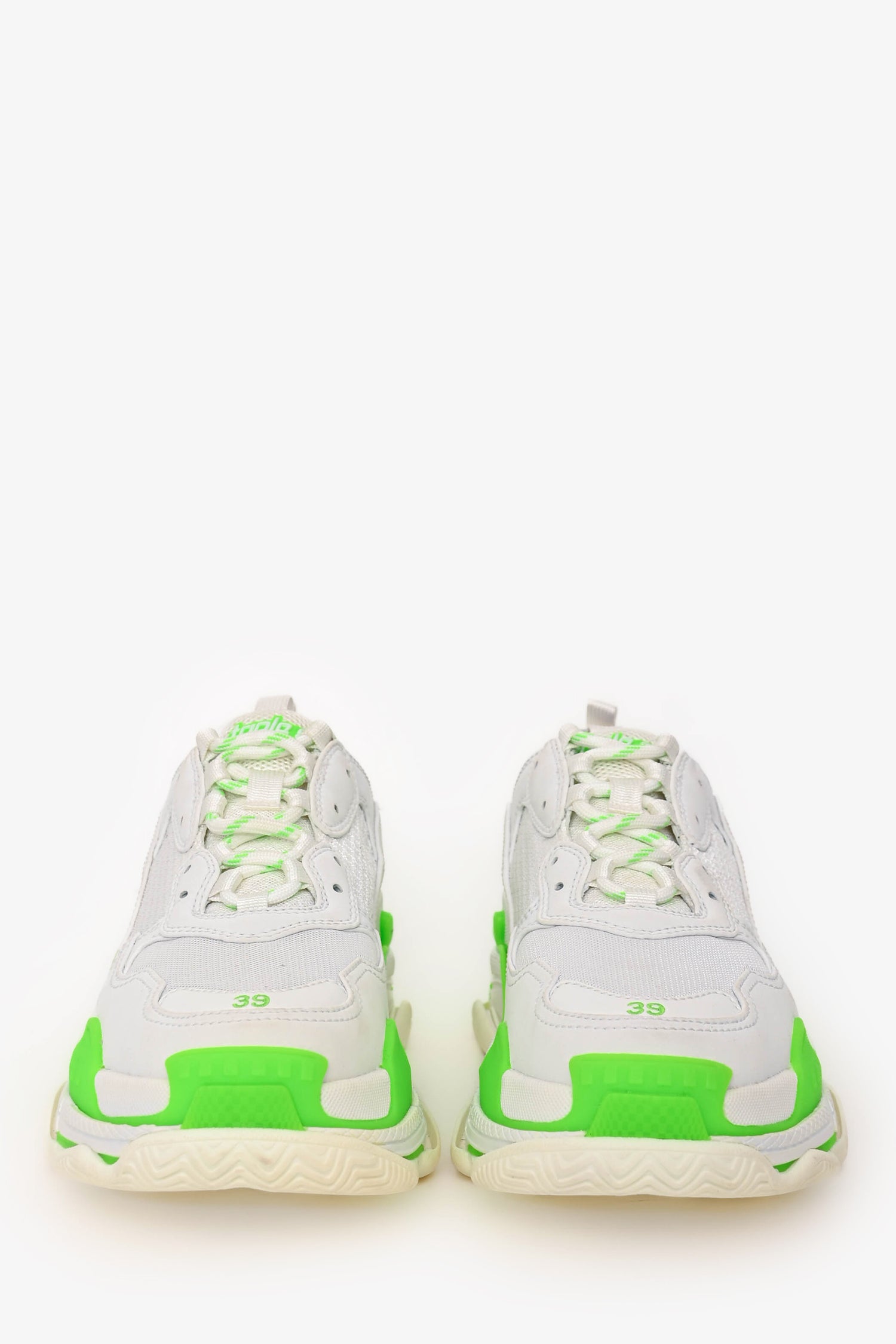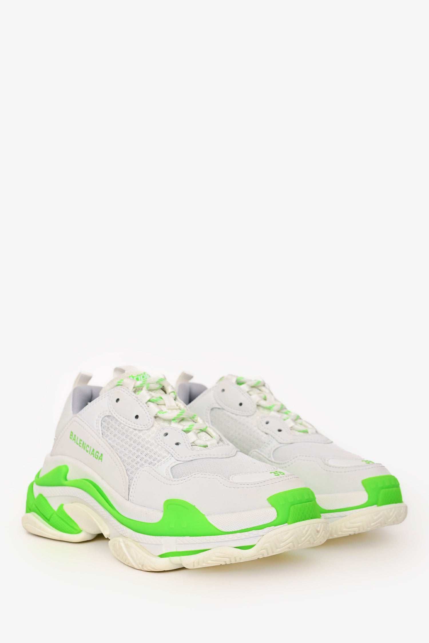 Refresh availabilityBalenciaga White/Green Triple S Sneakers. Slip-on. Lace-up. Round toe. Mesh and leather exterior with a layered sole design. Pull tabs at the tongue and rear heel. Fabric lining and insole. Rubber sole. Tonal stitching.