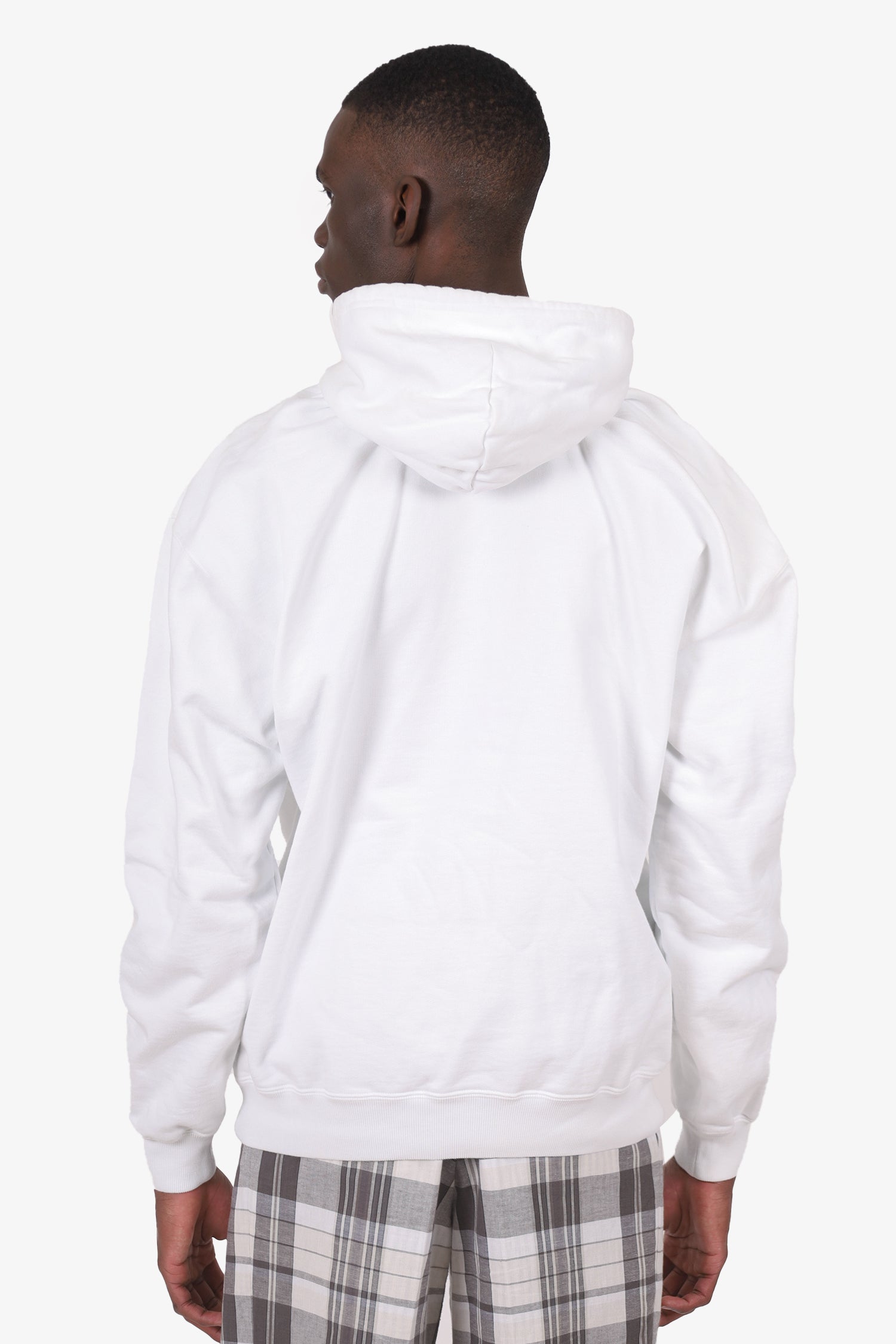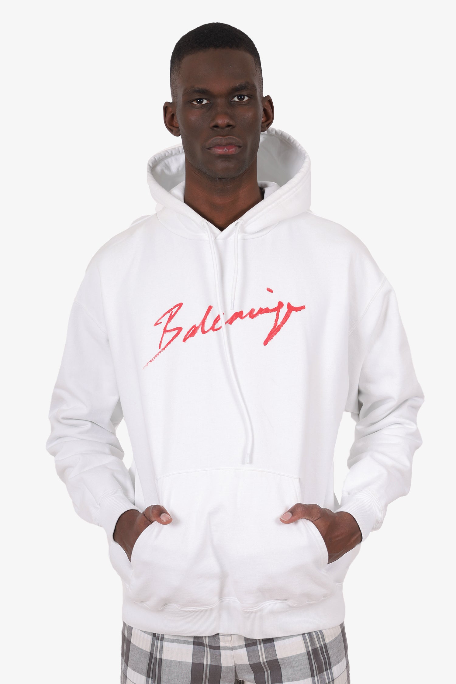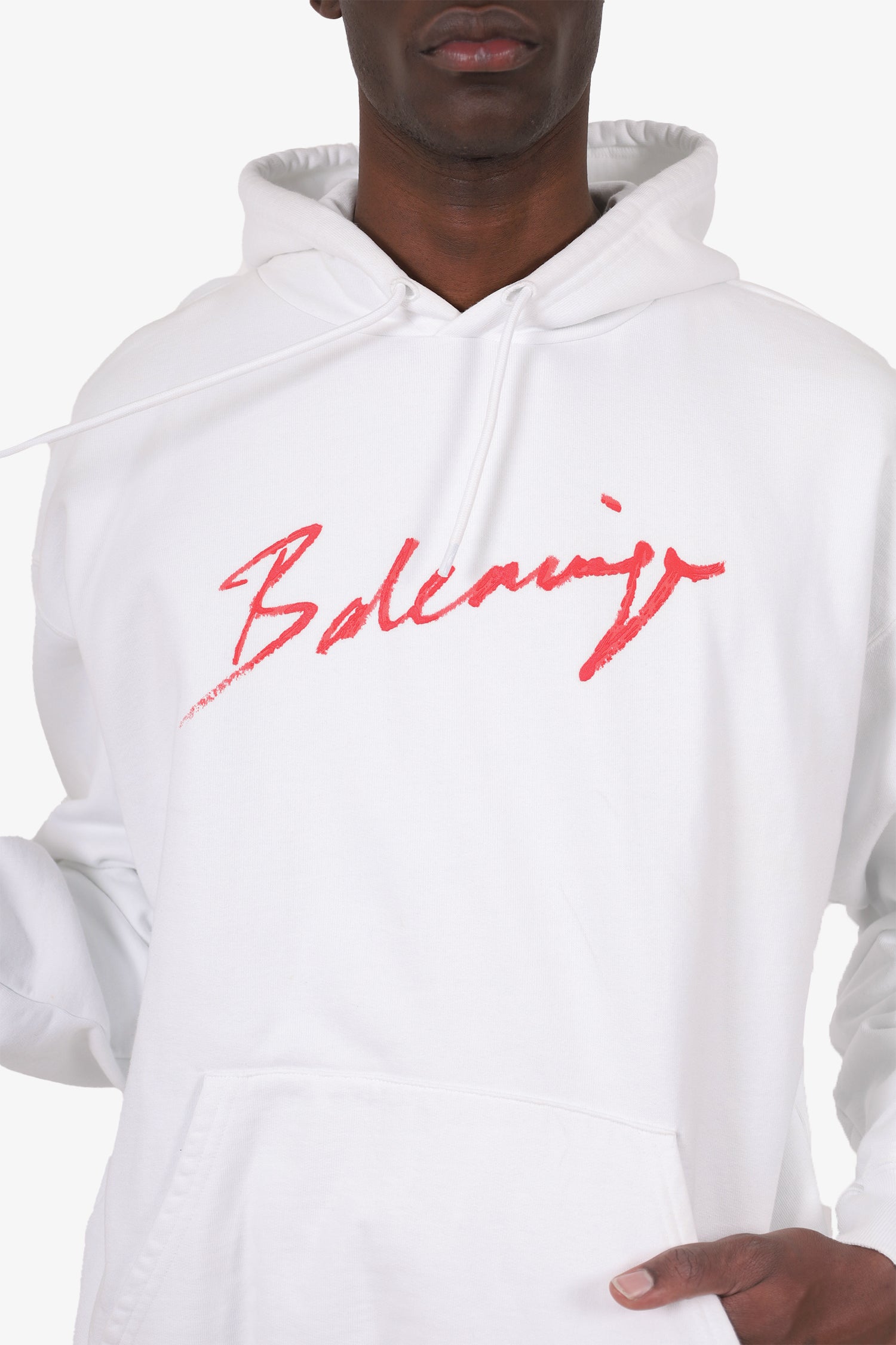 Refresh availabilityBalenciaga White/Red Logo Hoodie. Pull-on. Hooded with adjustable cinching drawstring closure. Front kangaroo pocket. Tonal stitching.