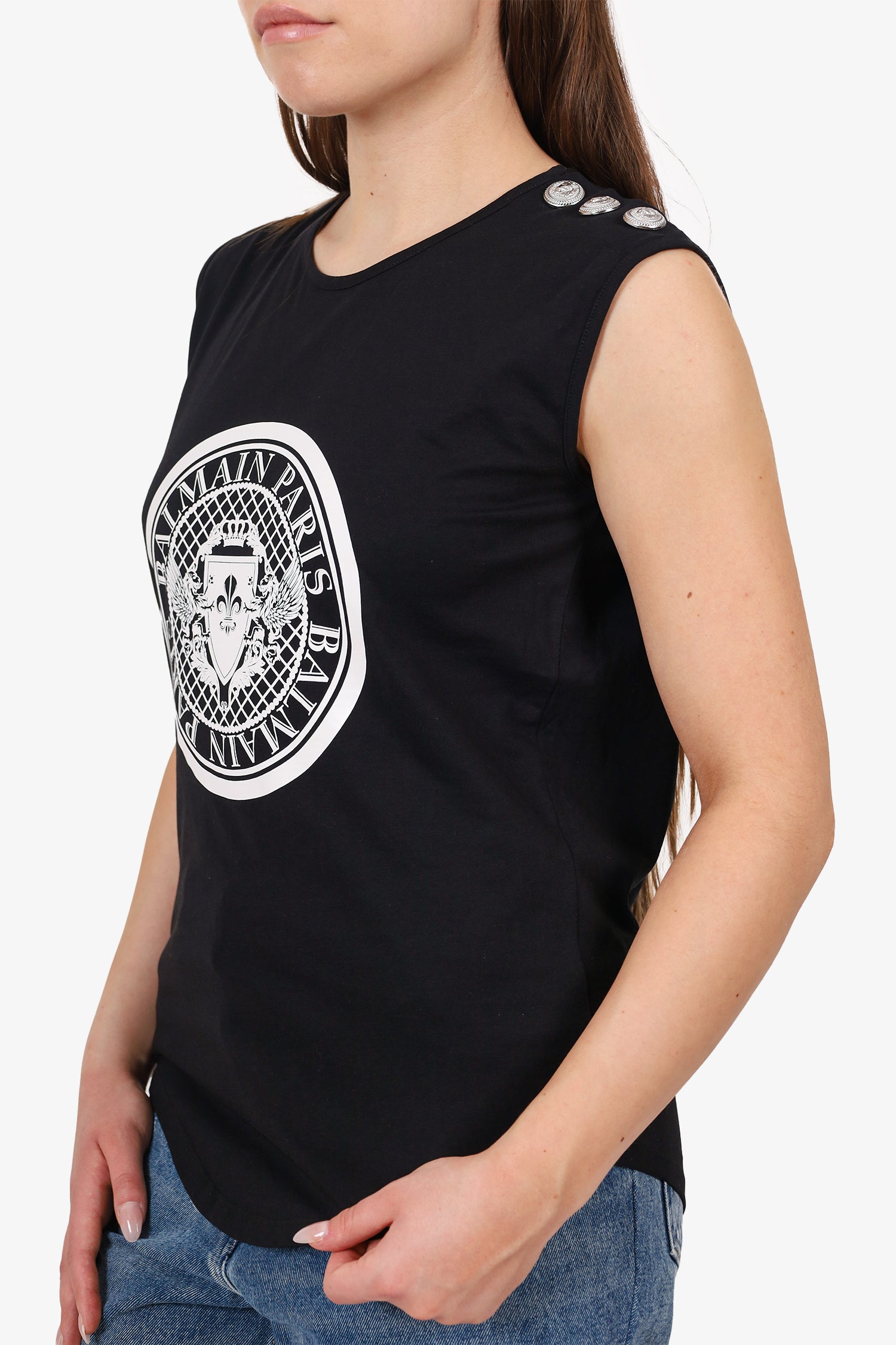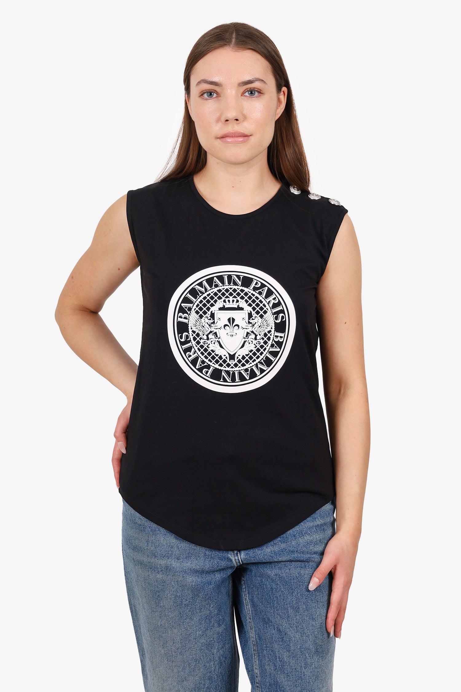 Refresh availabilityBalmain Black Button Logo Sleeveless T-Shirt. Pull-on. Round neckline. Button detail on left shoulder. Front printed graphic. Silver-tone hardware. Tonal stitching.