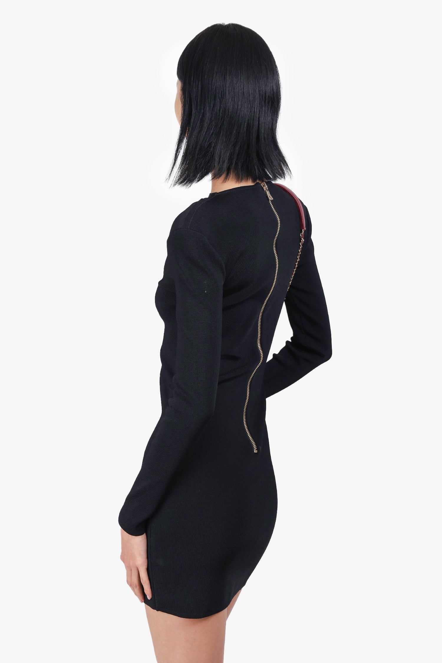 Refresh availabilityBalmain Black Criss-Cross Long Sleeve Mini Dress. V-neckline with criss-cross detail. Rear zip closure. Shoulder pads. Unlined. Tonal stitching. Gold-tone hardware.