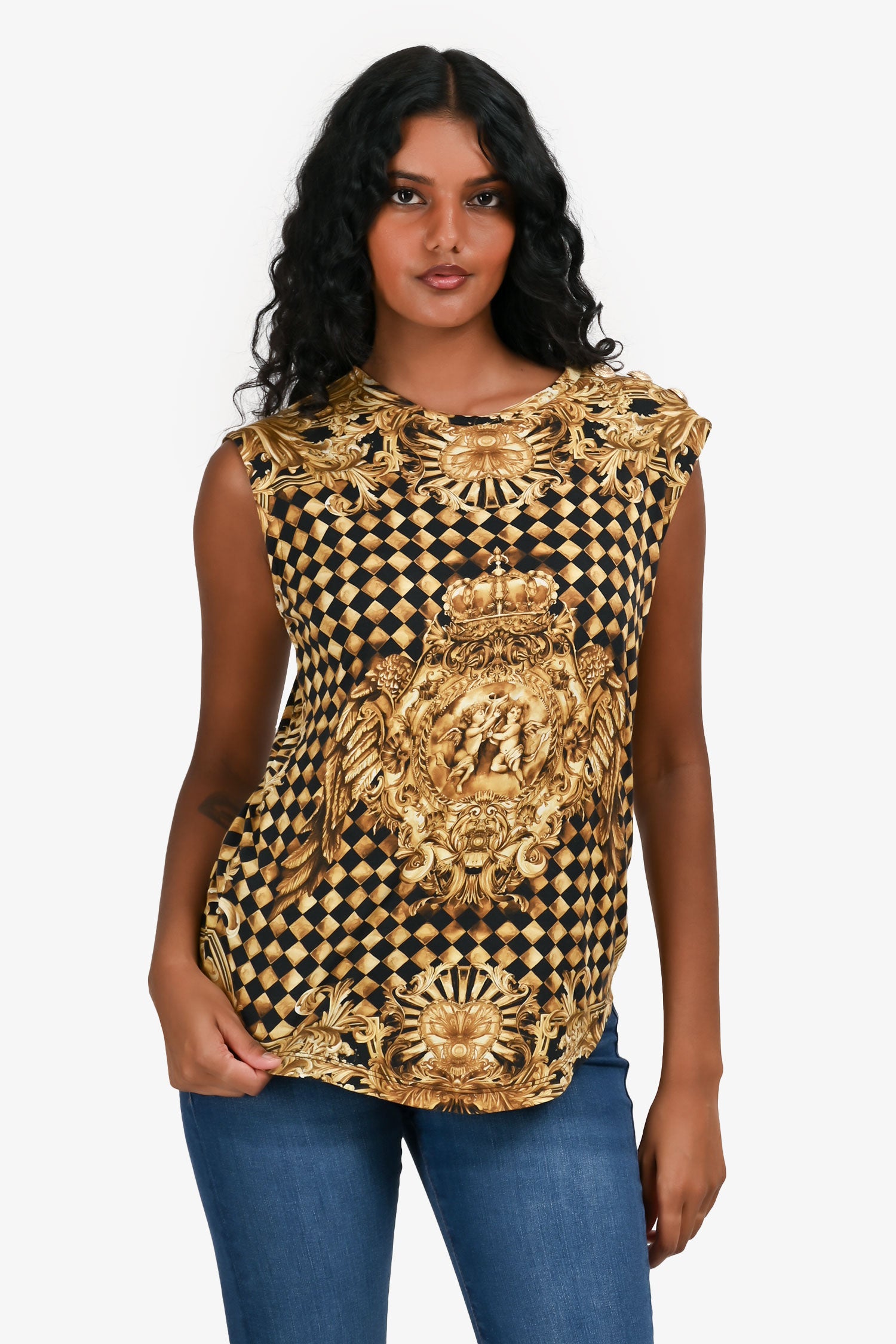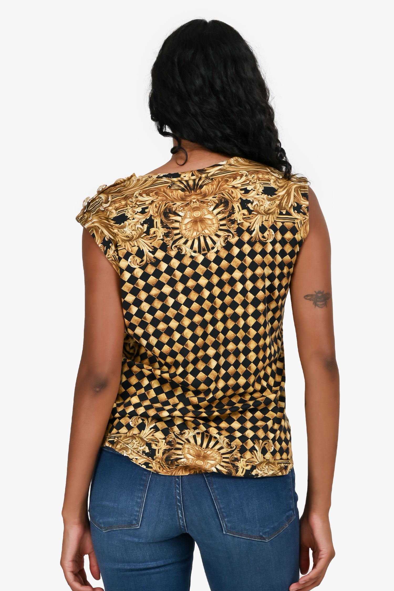 Refresh availabilityBalmain Black/Gold Boroque Printed Sleeveless Top. Left shoulder with gold-tone snap buttons. Tonal stitching.