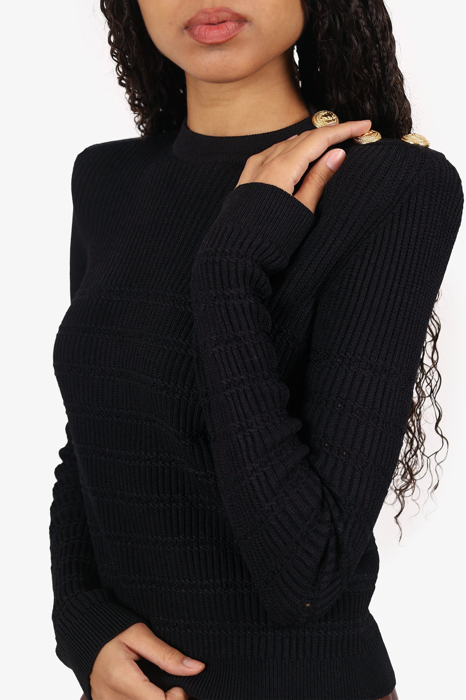 Refresh availabilityBalmain Black Gold Button Shoulder Pads Ribbed Knit Sweater. Pull-on. Round-neckline. Button detail on shoulder. Gold-tone hardware. Tonal stitching.