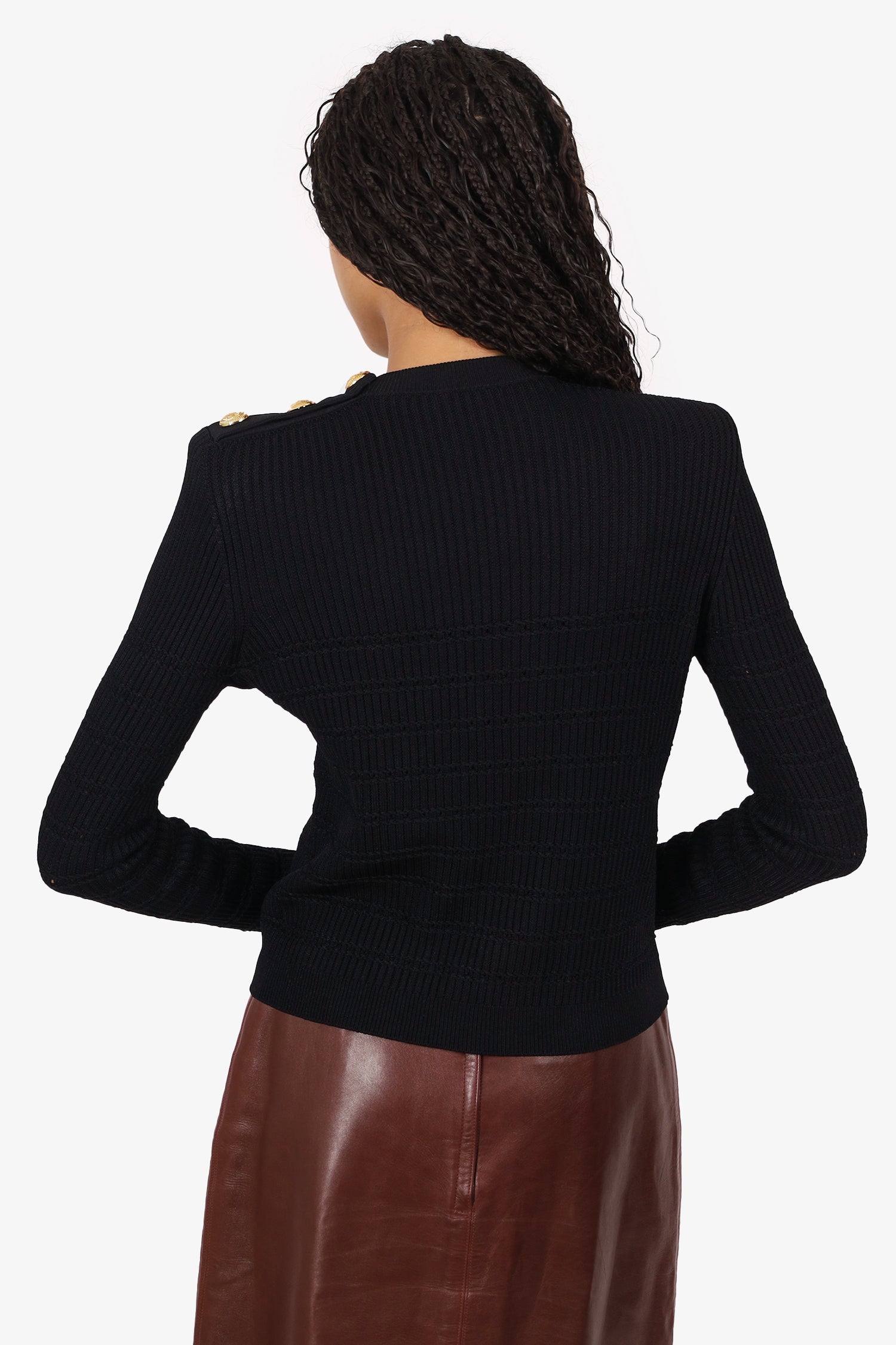 Balmain Black Gold Button Shoulder Pads Ribbed Knit Sweater Size 36