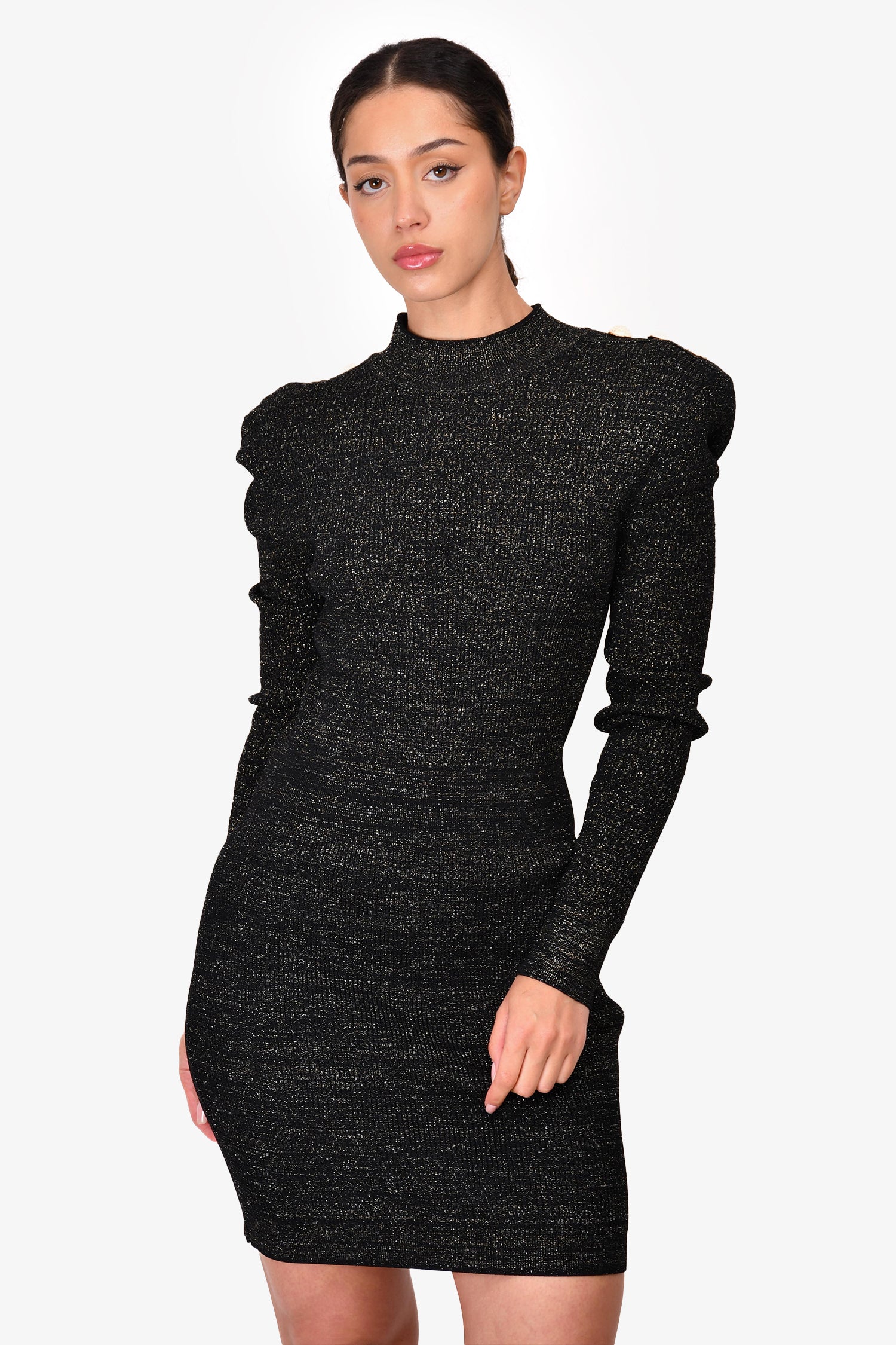 Refresh availabilityBalmain Black/Gold Metallic Shoulder Pad Mini Dress. Mock neck. Rear zip closure. Unlined.