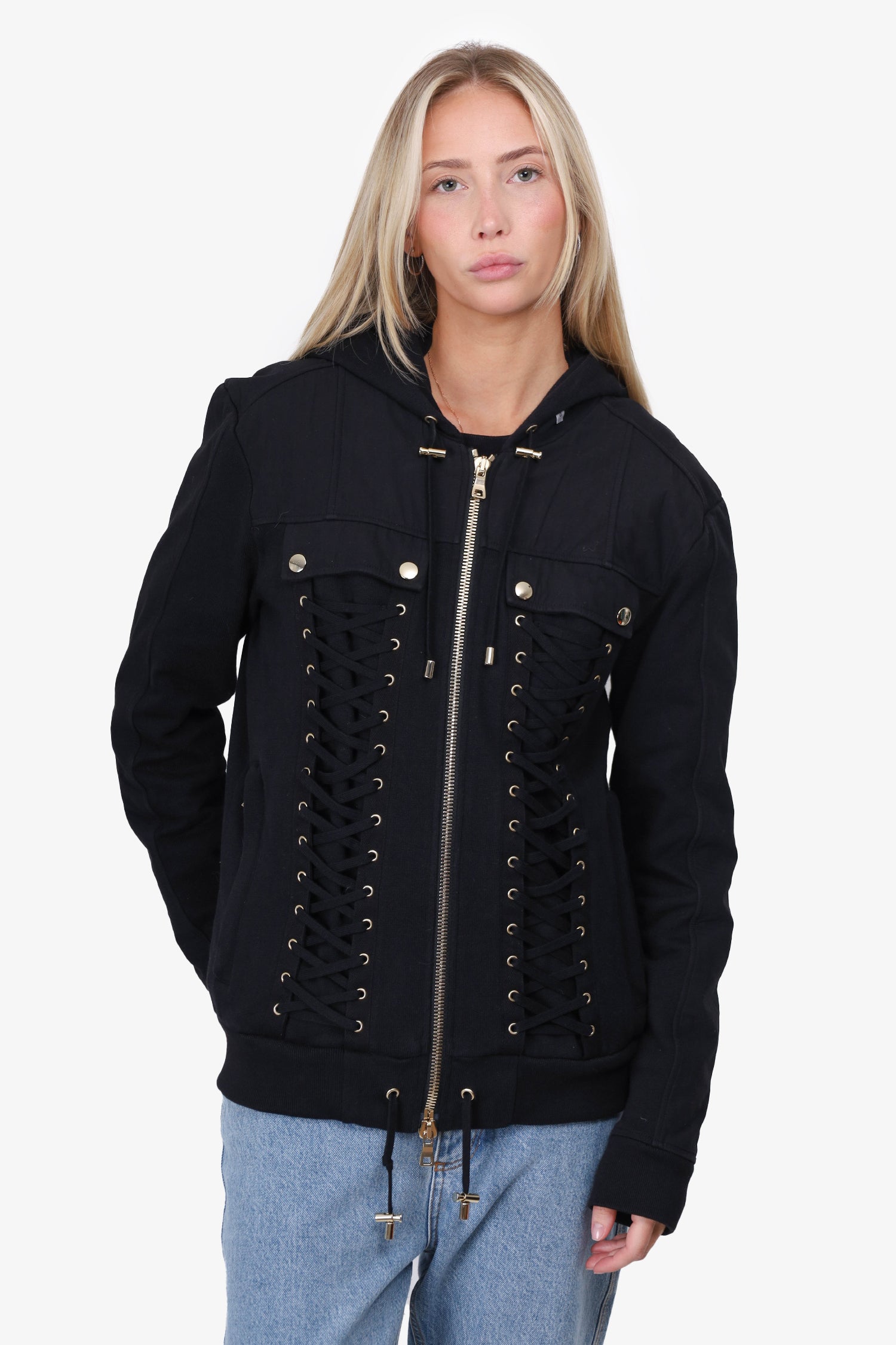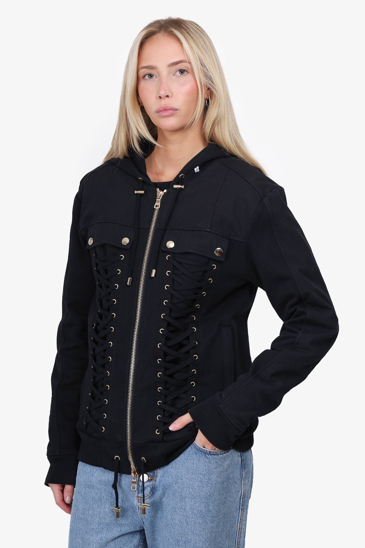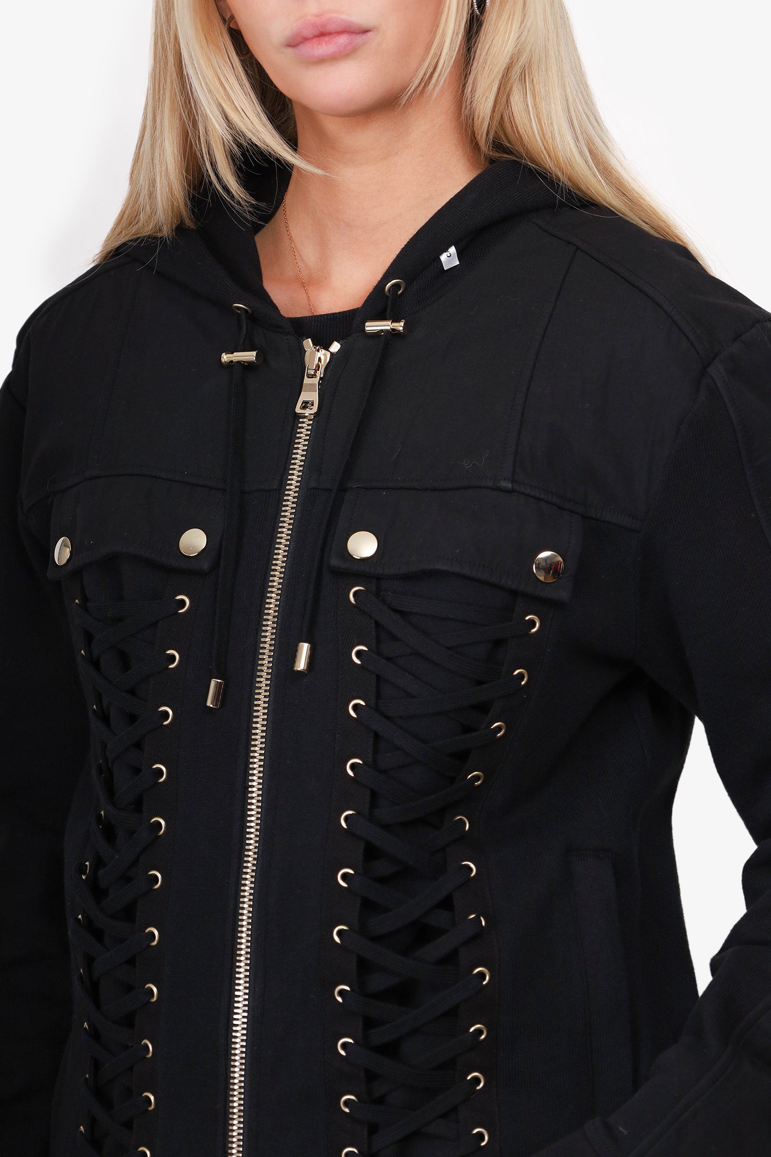 Refresh availabilityBalmain Black Lacing Zip Hoodie. Ribbed trimmings. Two front slip pockets. Gold-tone stitching. Unlined. Tonal stitching.