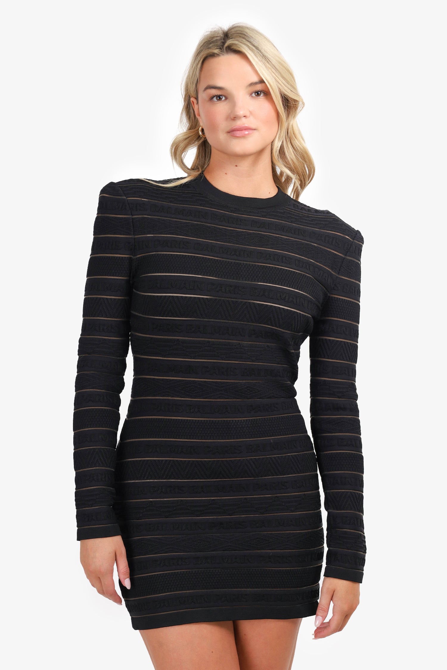 Refresh availabilityBalmain Black Logo Mesh Striped Long Sleeve Mini Dress. Round neckline. Back zip closure. Elasticated neckline, wrist cuffs, and bottom hem. Shoulder pads. Gold-tone hardware. Unlined. Tonal stitching.