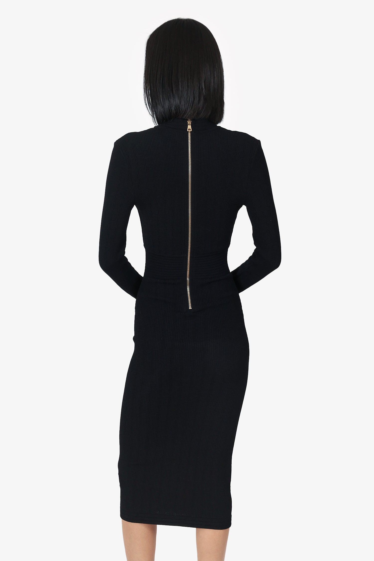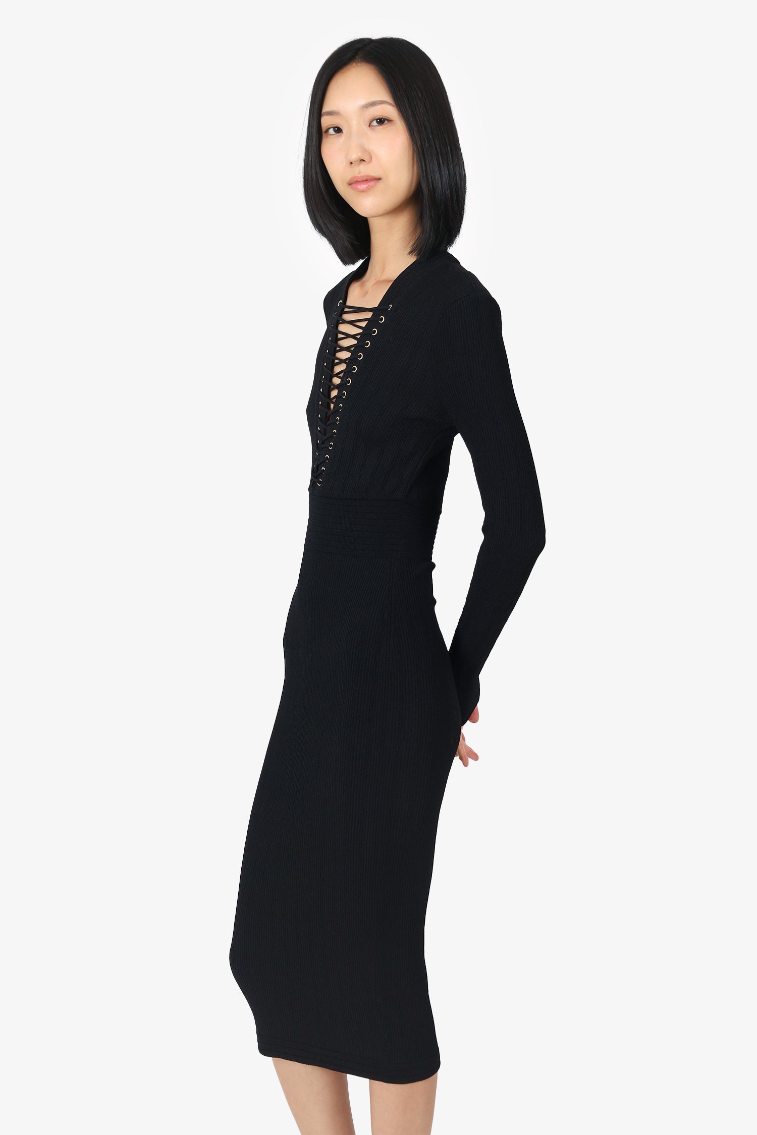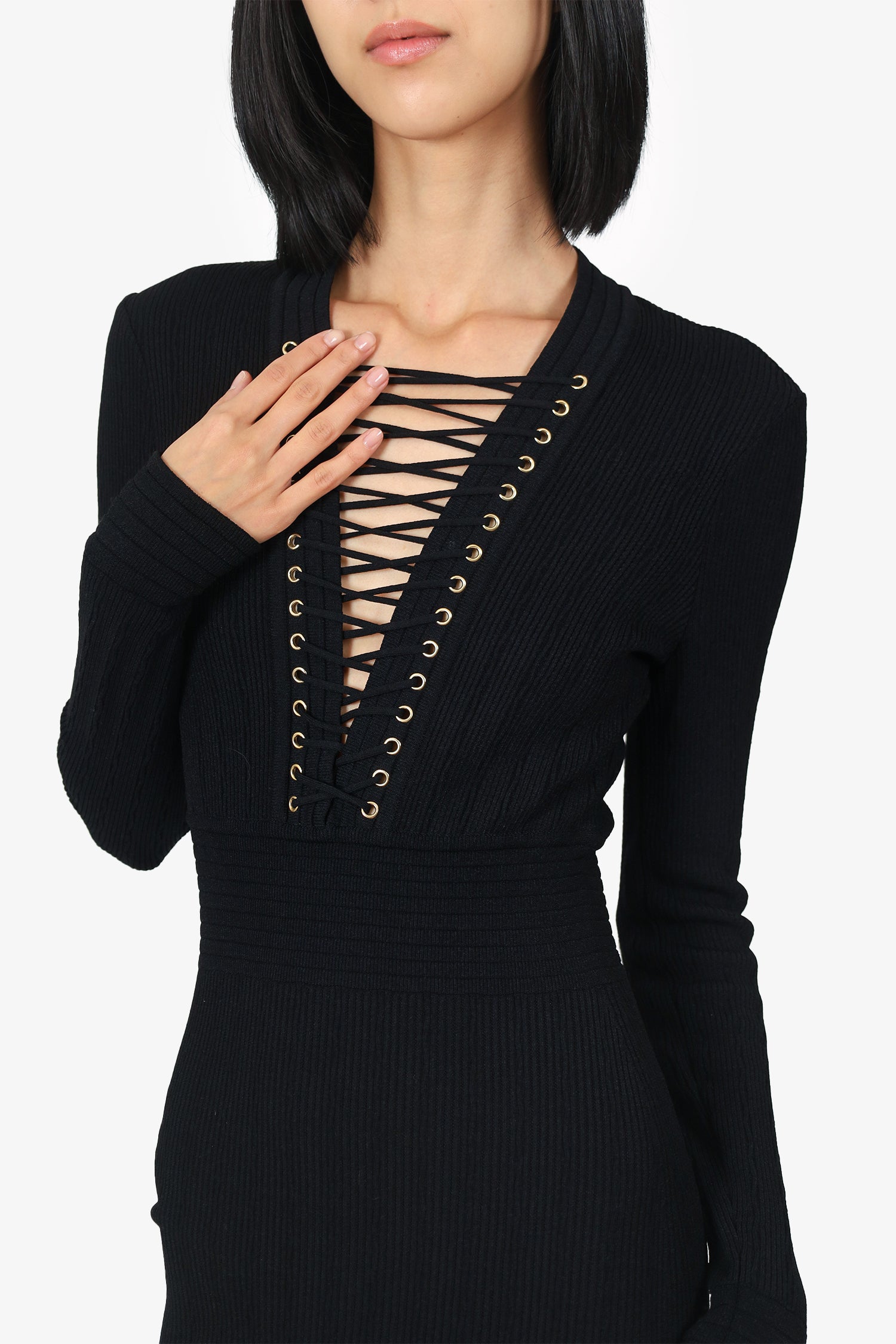 Refresh availabilityBalmain Black Rib Knit Lace Up Neckline Fitted Dress. Slip-on. Rear zip-closure. V-neckline. Tonal stitching. Gold-tone hardware.