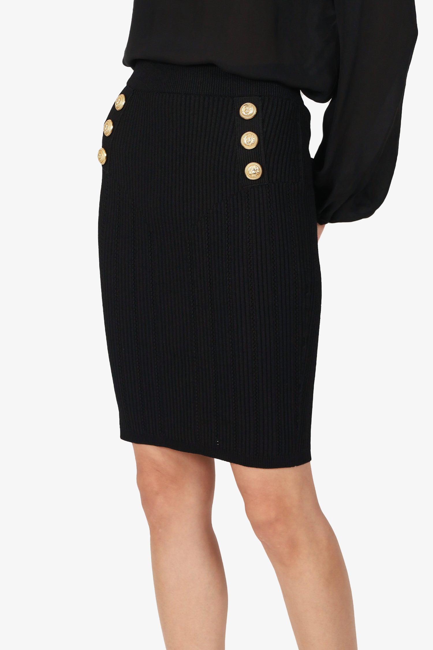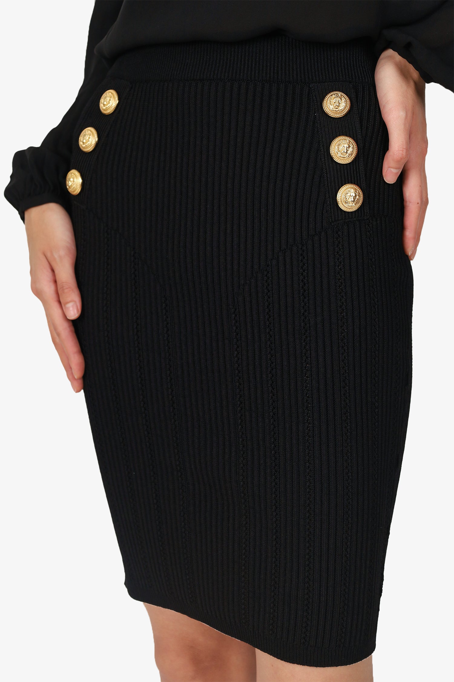 Refresh availabilityBalmain Black Ribbed Knit Midi Skirt. Slip-on. Elasticated waistband. Front button detail. Gold-tone hardware. Tonal stitching.