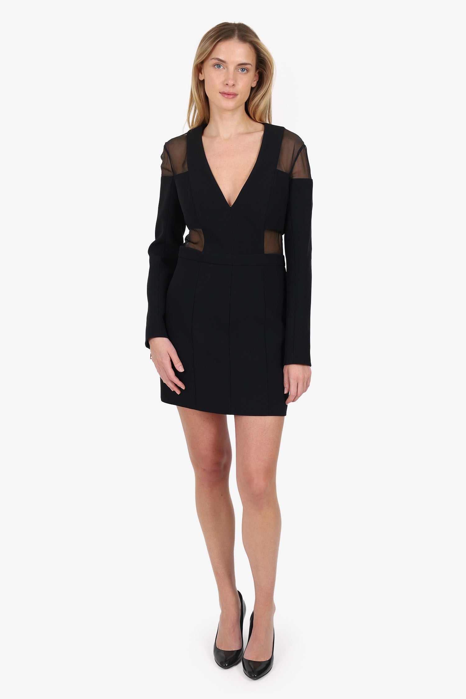 Balmain Black Sheer Panel V-Neck Long Sleeve Mini Dress Size 8