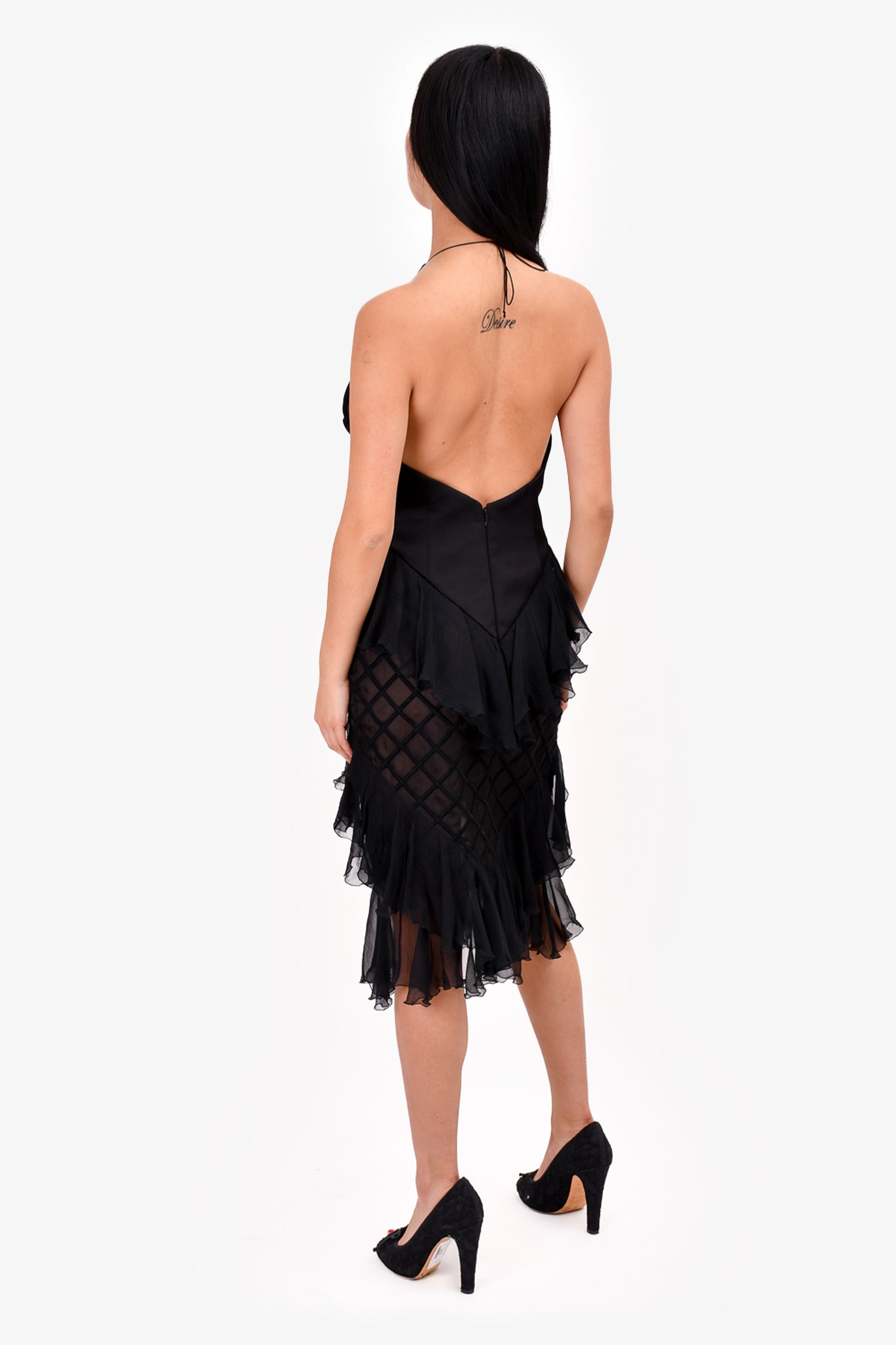 Refresh availabilityBalmain Black Sheer Quilted Ruffle Detail Halter Dress. Tie-up halter. Rear zip and hook closure. Lined.