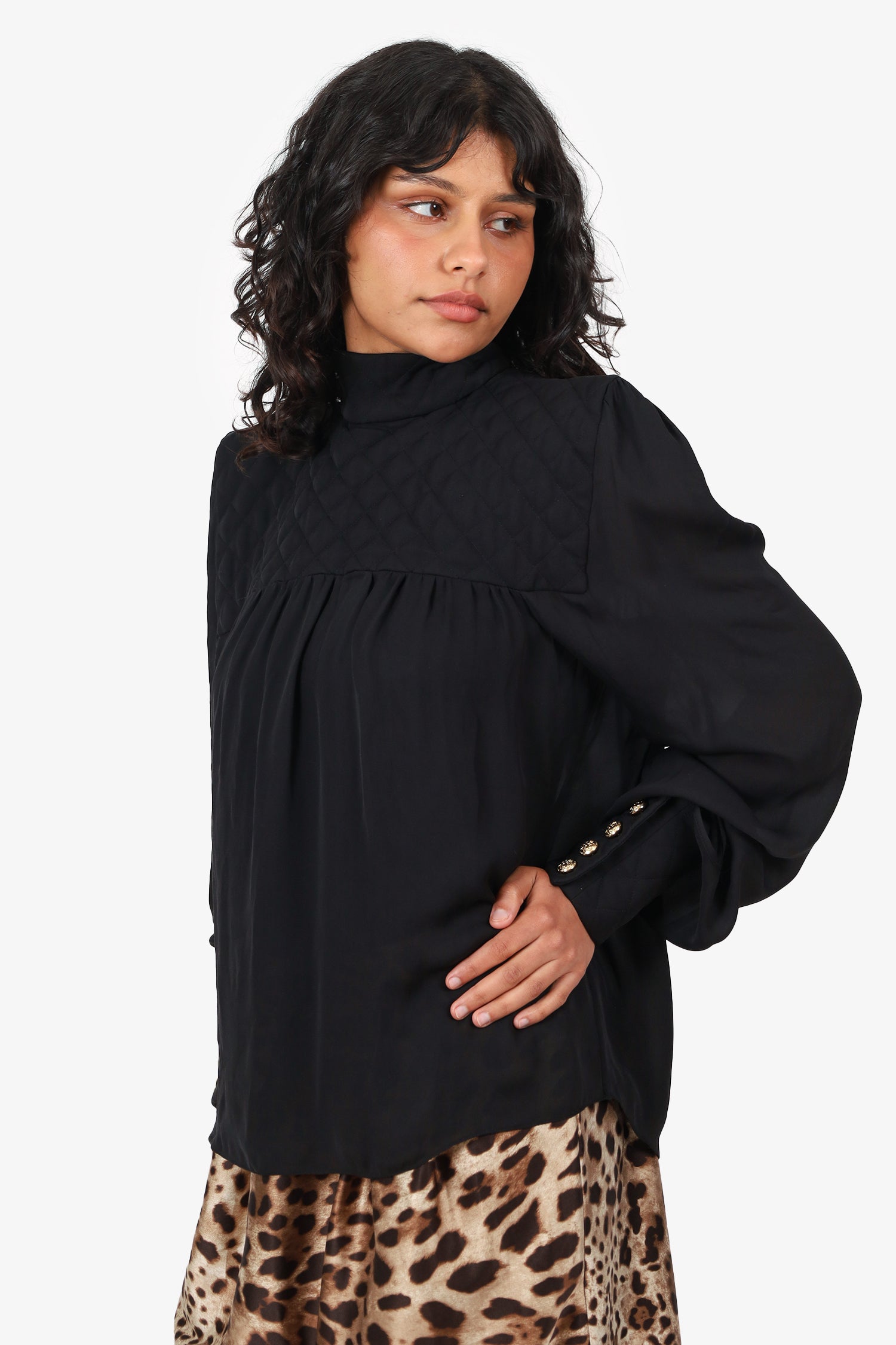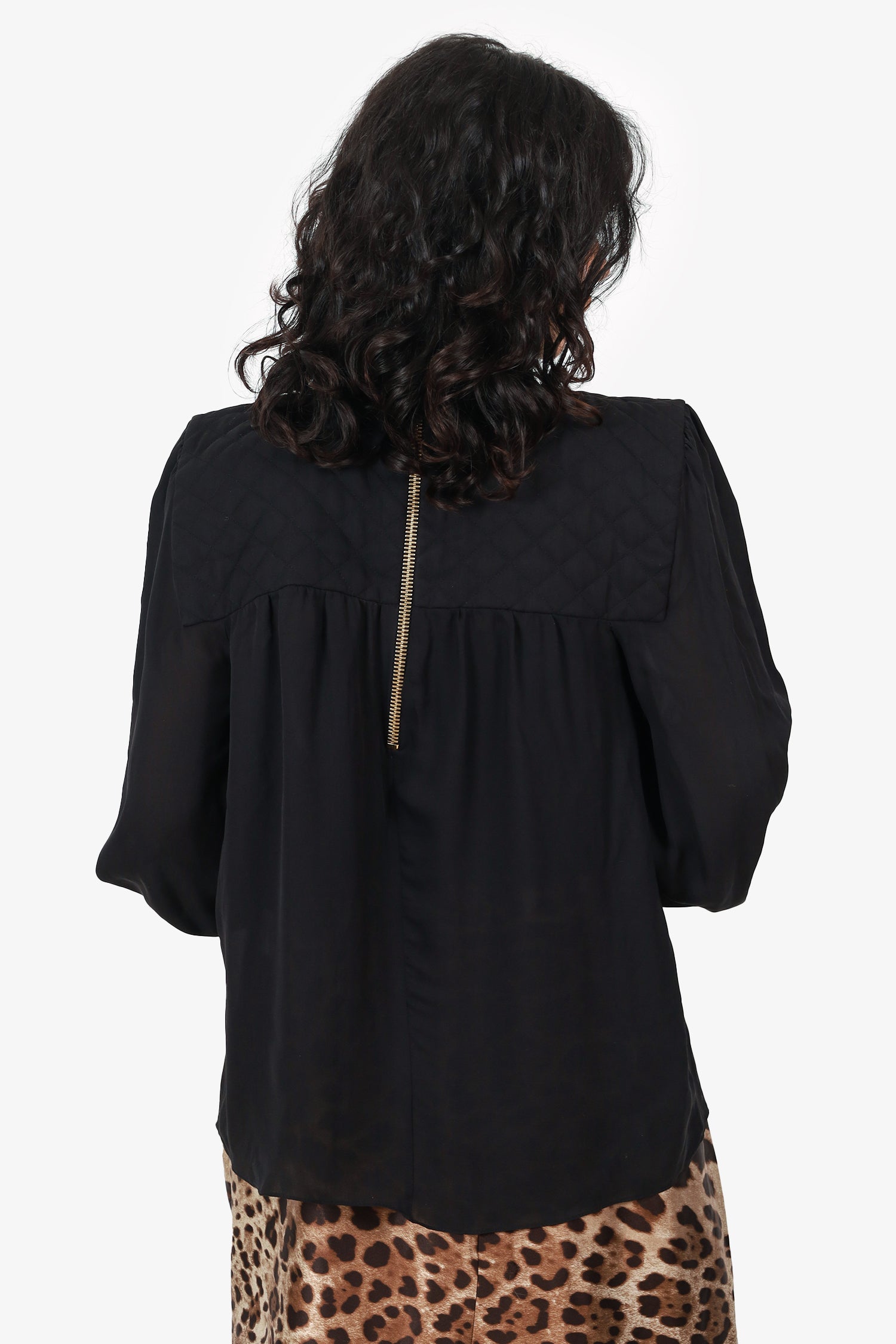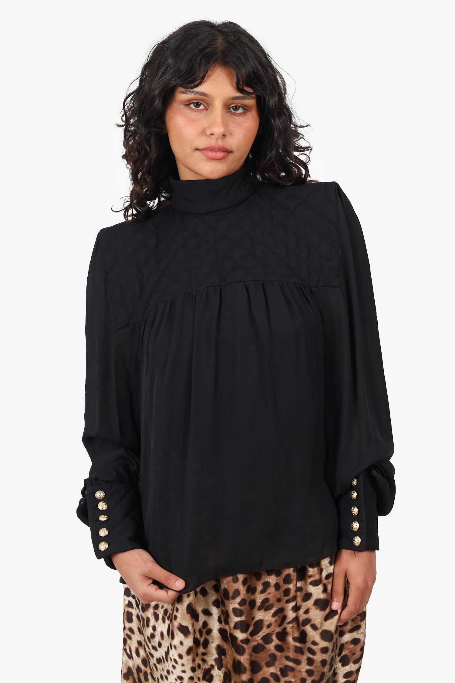 Refresh availabilityBalmain Black Silk Quilted/Sheer Long Sleeve Mock Neck Top. Pull-on. Mock neckline. Rear zip closure. Sleeve cuffs with button-up closure. Gold-tone hardware. Tonal stitching.