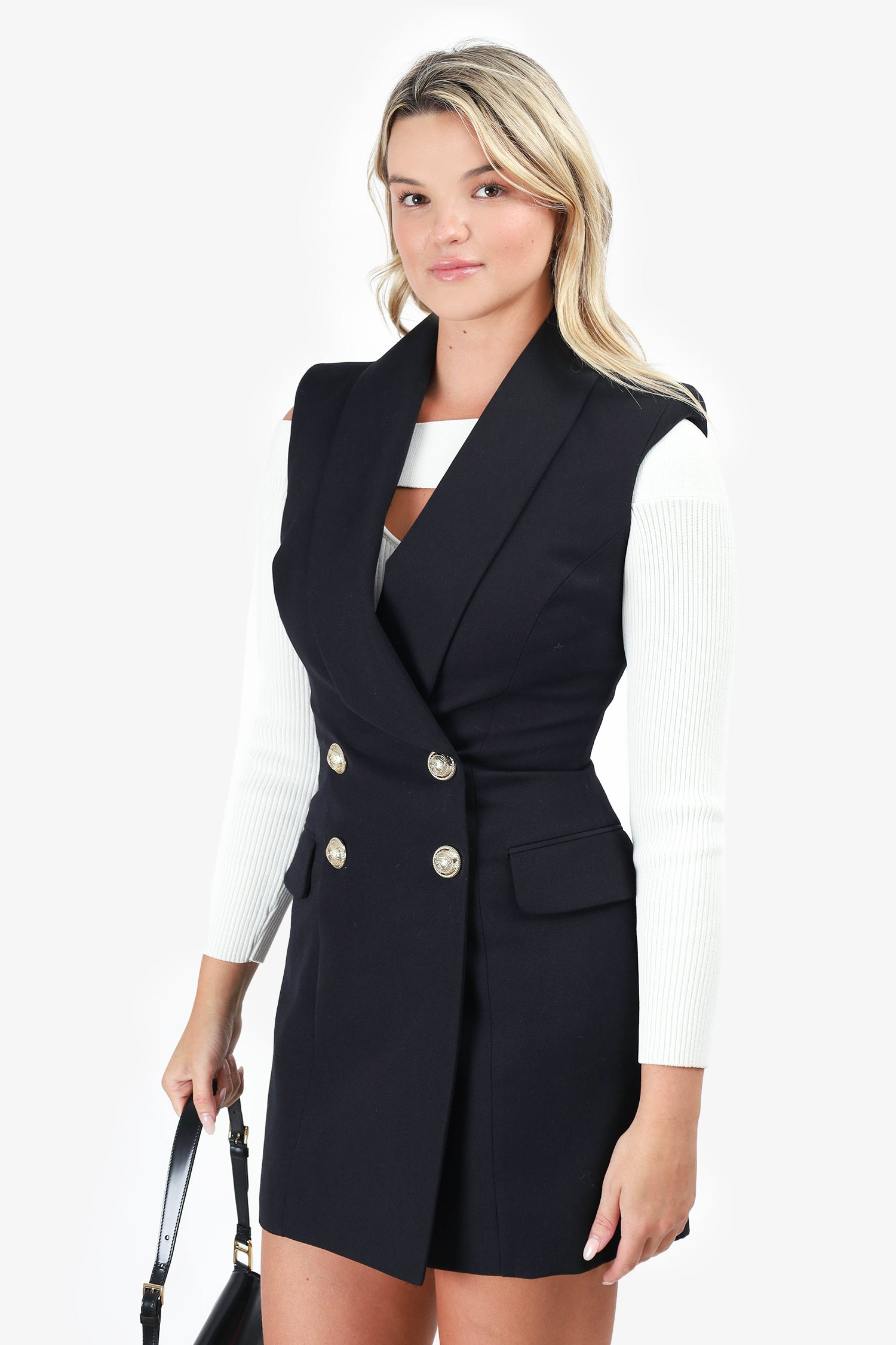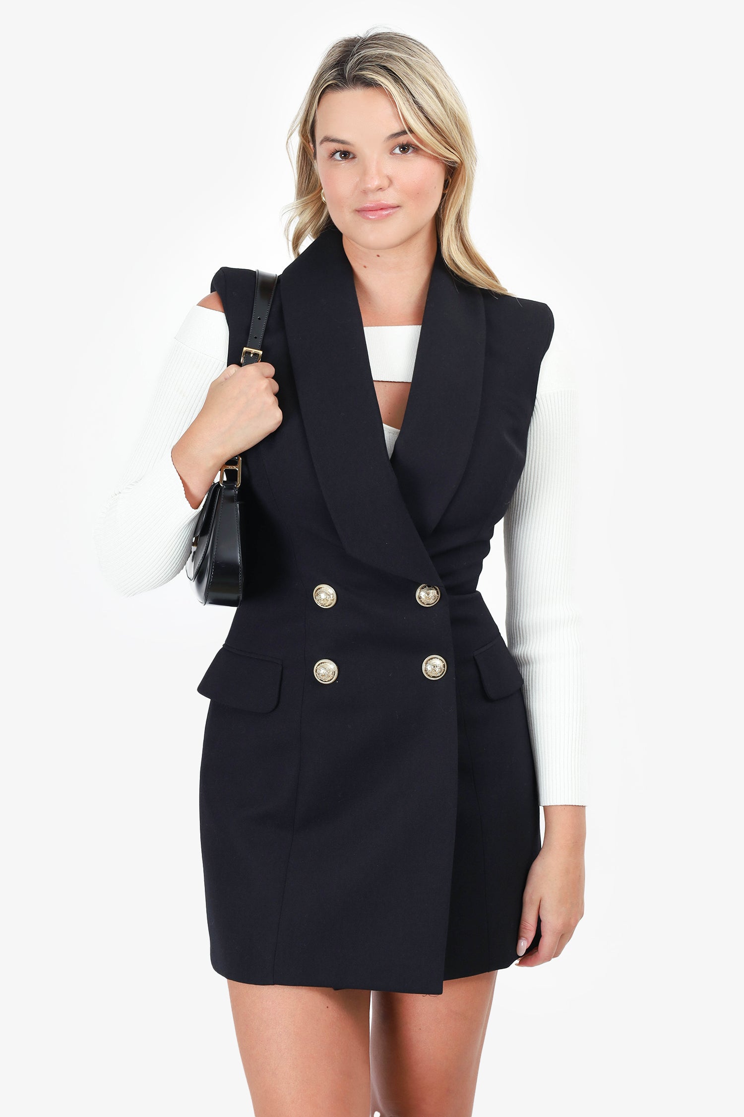 Refresh availabilityBalmain Black Sleeveless Blazer Mini Dress. Collared v-neckline. Rear zip closure. 2 front faux pockets with fold-over flap. Interior shoulder pads. Lined. Tonal stitching. Gold-tone hardware.