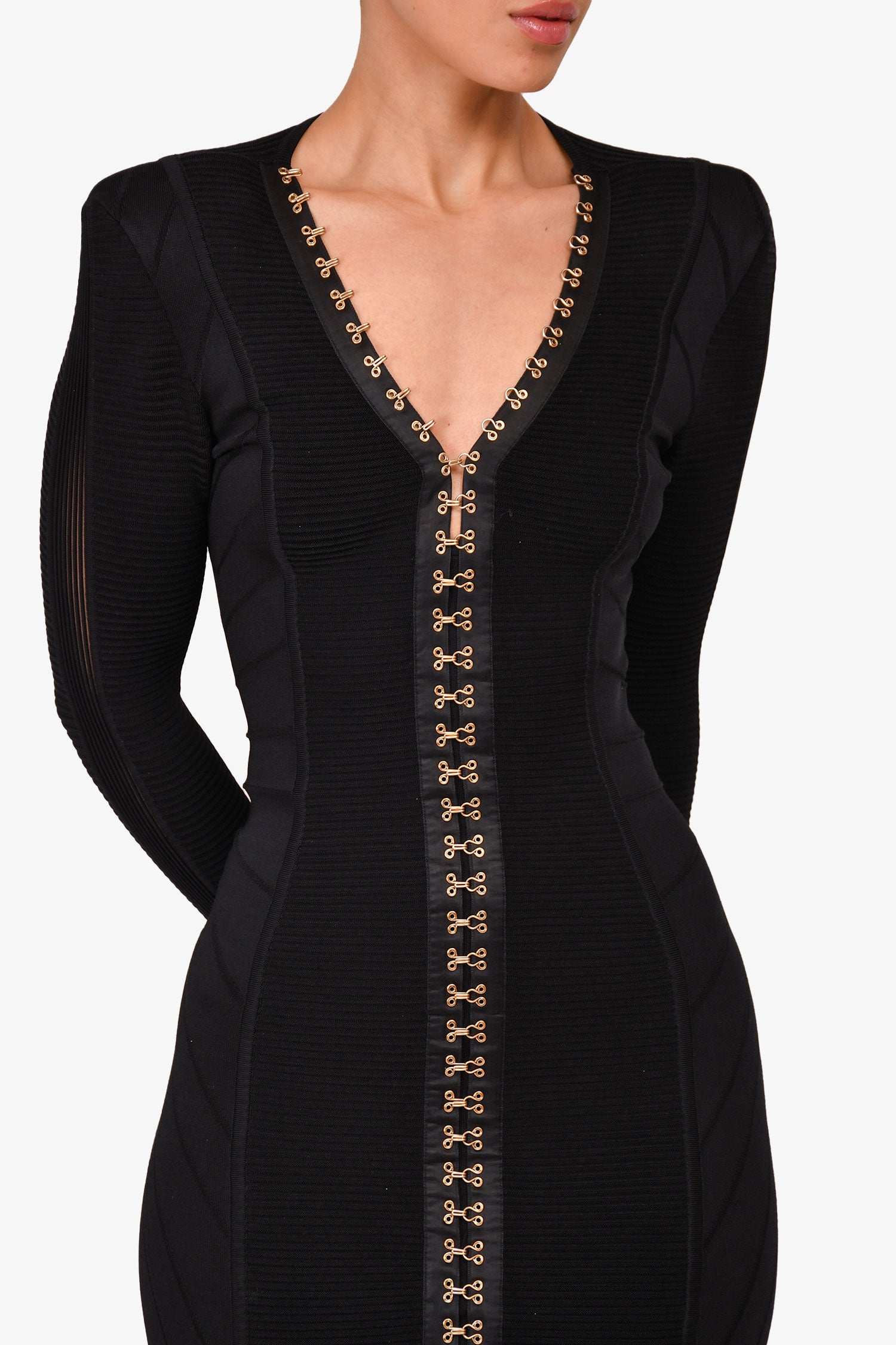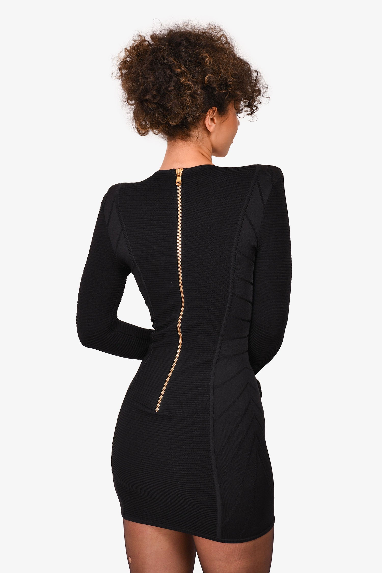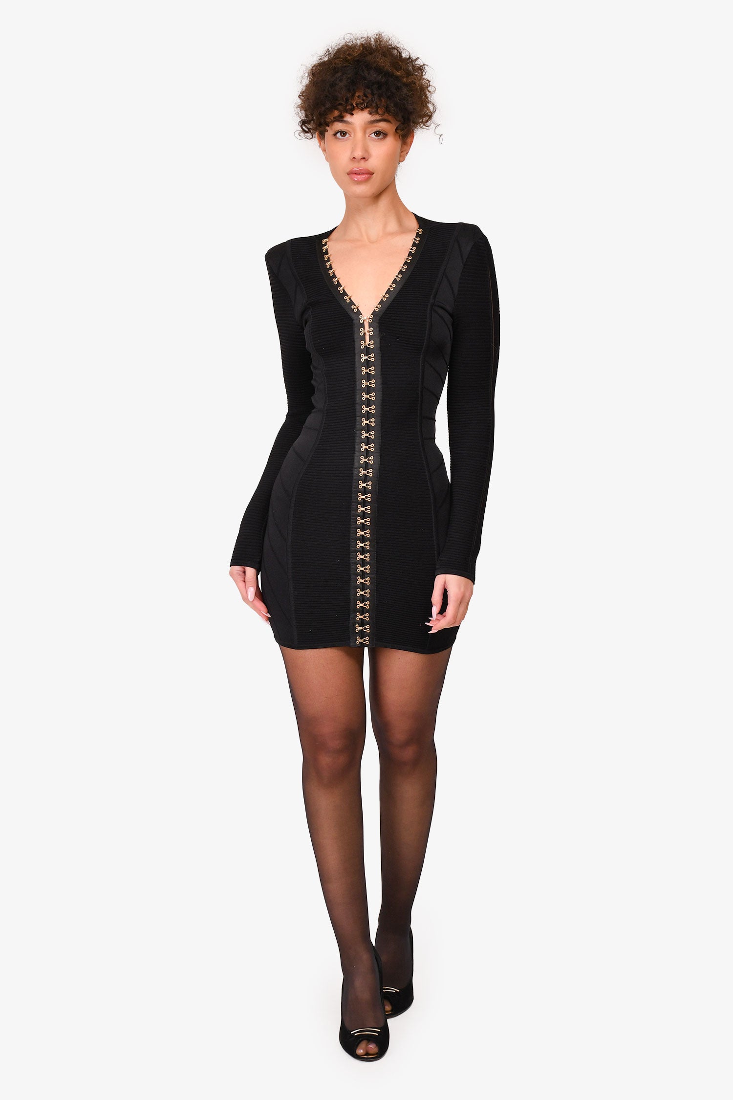 Refresh availabilityBalmain Black V-Neck Hook Closure Mini Dress. Front hooks. Gold-tone back zip-up. Elasticated. Tonal stitching.