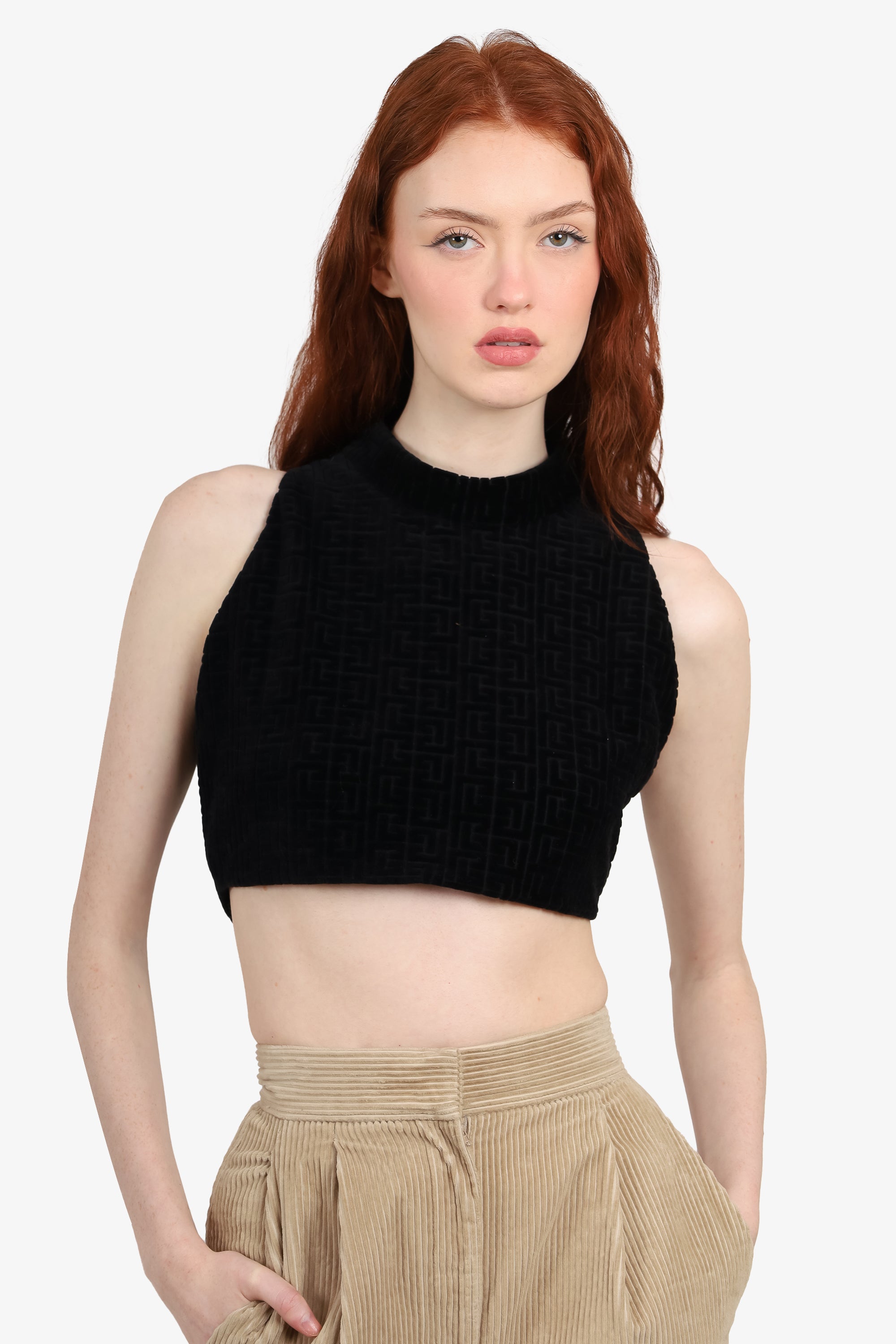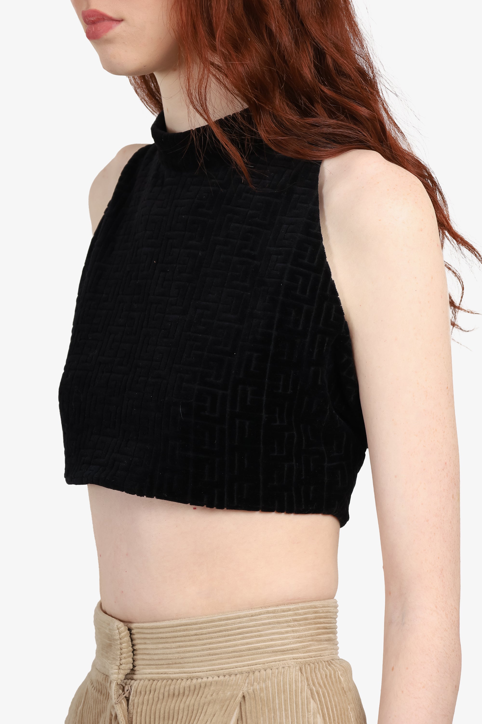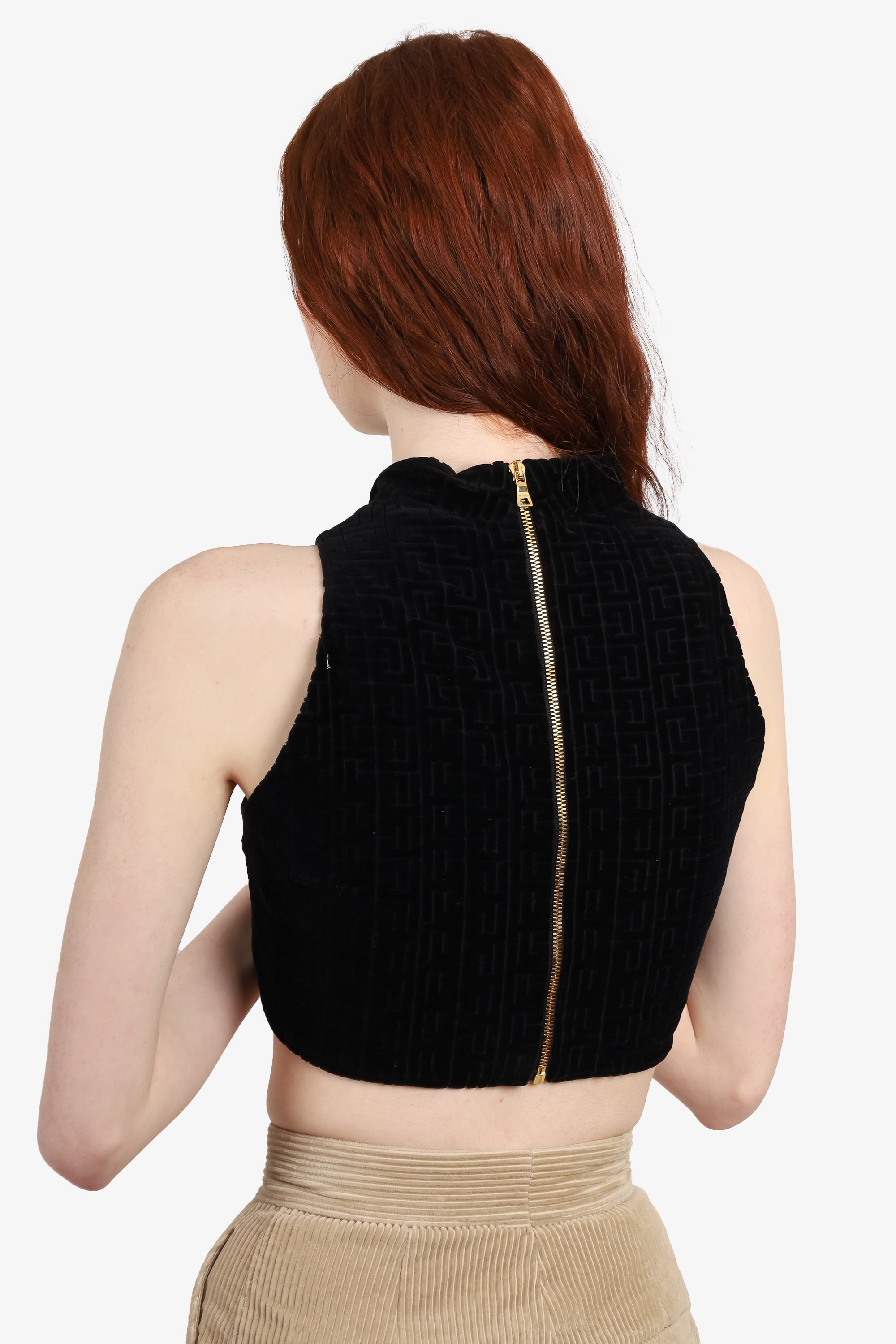 Refresh availabilityBalmain Black Velvet Monogram Sleeveless Crop Top. High neckline. Rear zip closure. Unlined. Tonal stitching.