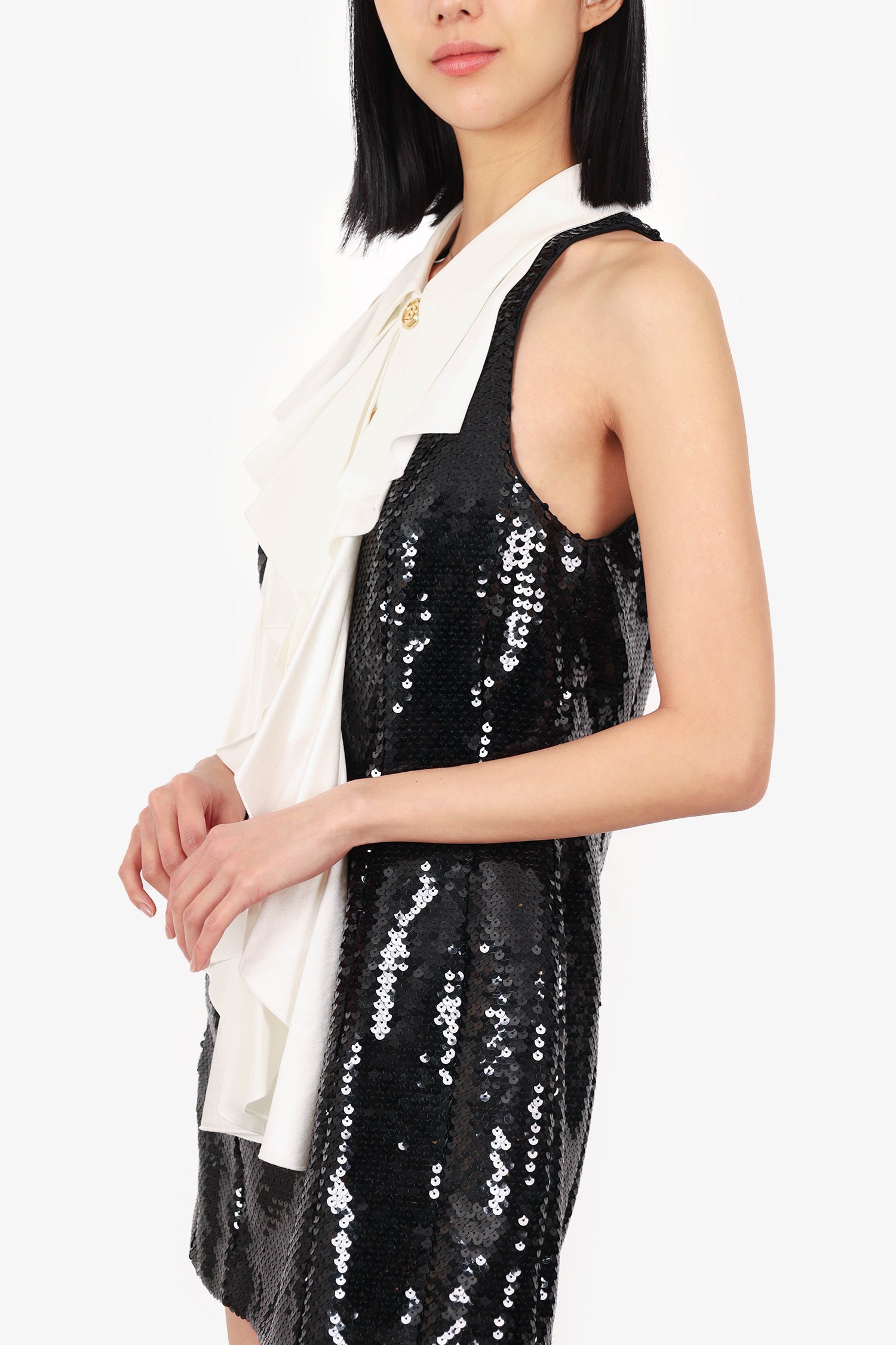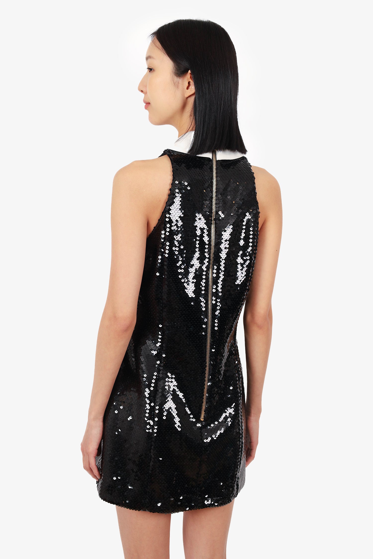 Refresh availabilityBalmain Black/White Ruffle-panel Sequinned Mini Dress. Collared neckline. Rear zip closure. Front button-up detail. Gold-tone hardware. Lined. Tonal stitching.