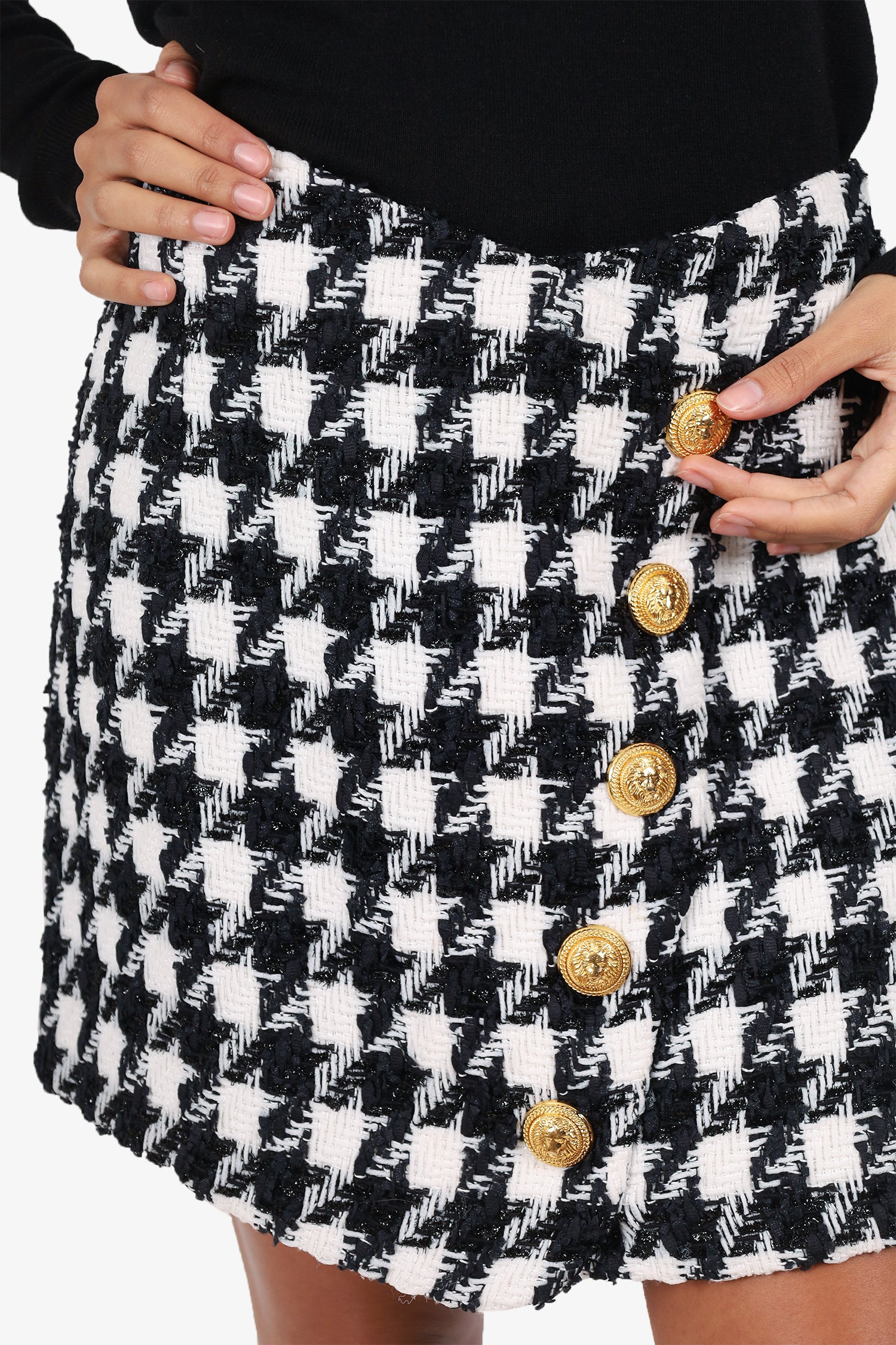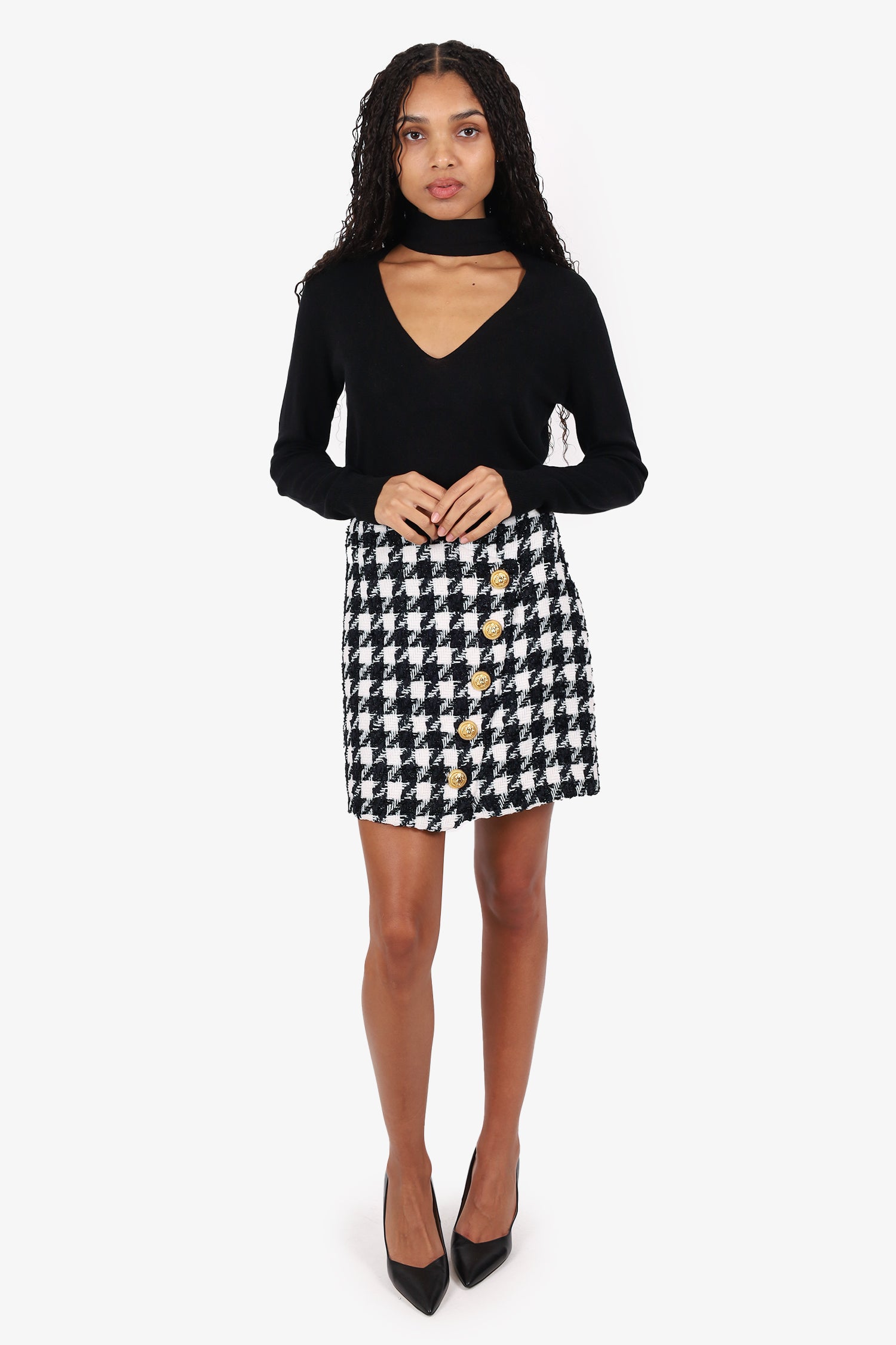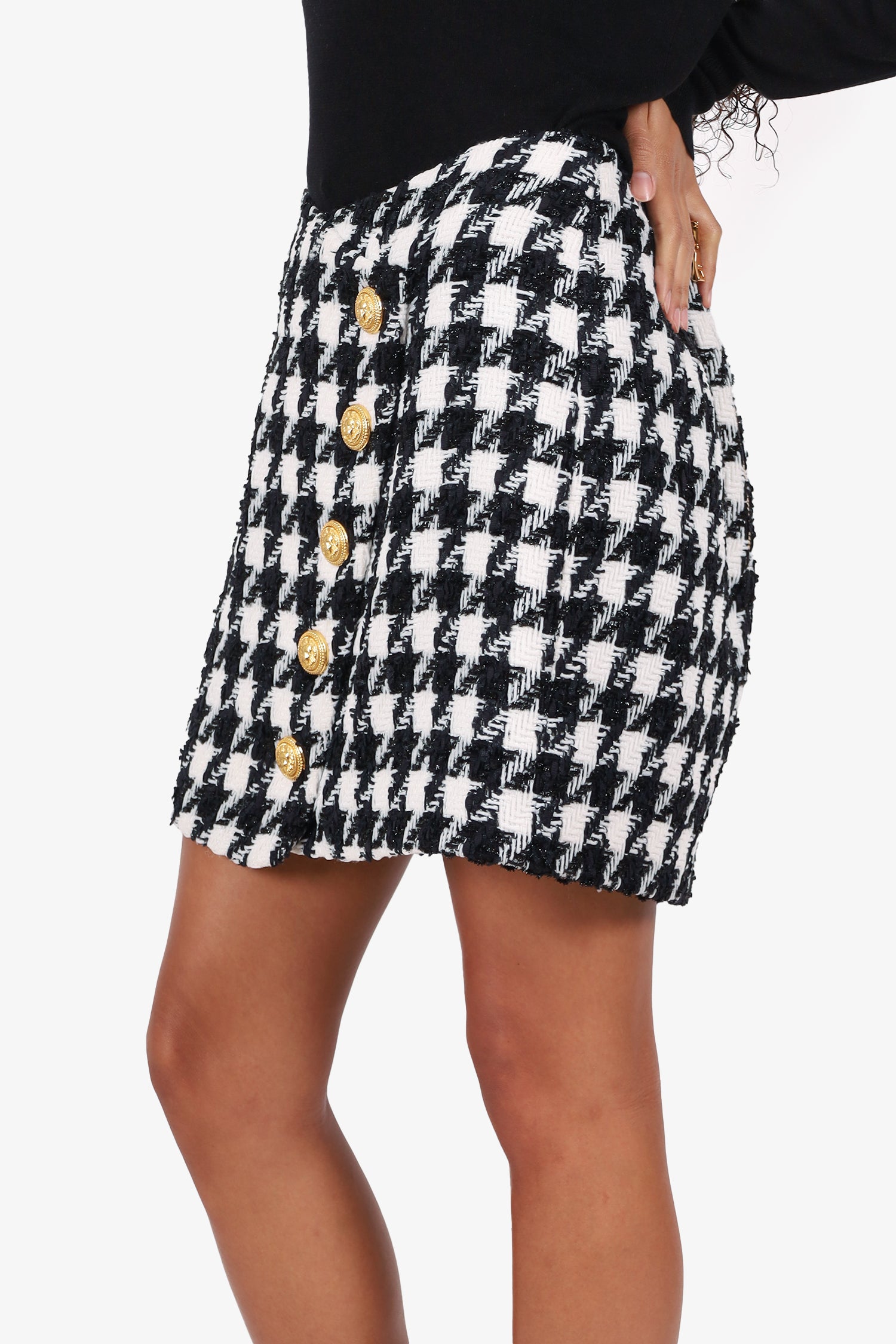 Refresh availabilityBalmain Black/White Tweed Houndstooth Mini Skirt. Slip-on. Rear zip closure. Button detail on front exterior. Lined interior. Gold-tone hardware. Tonal stitching.