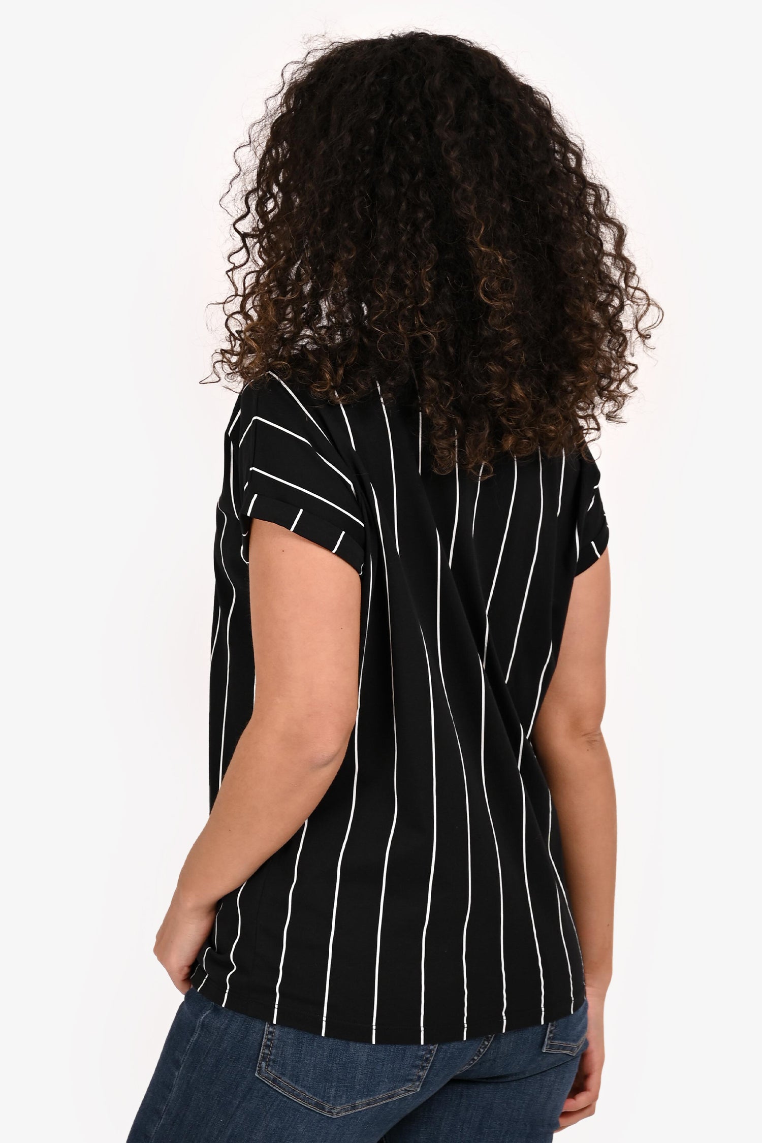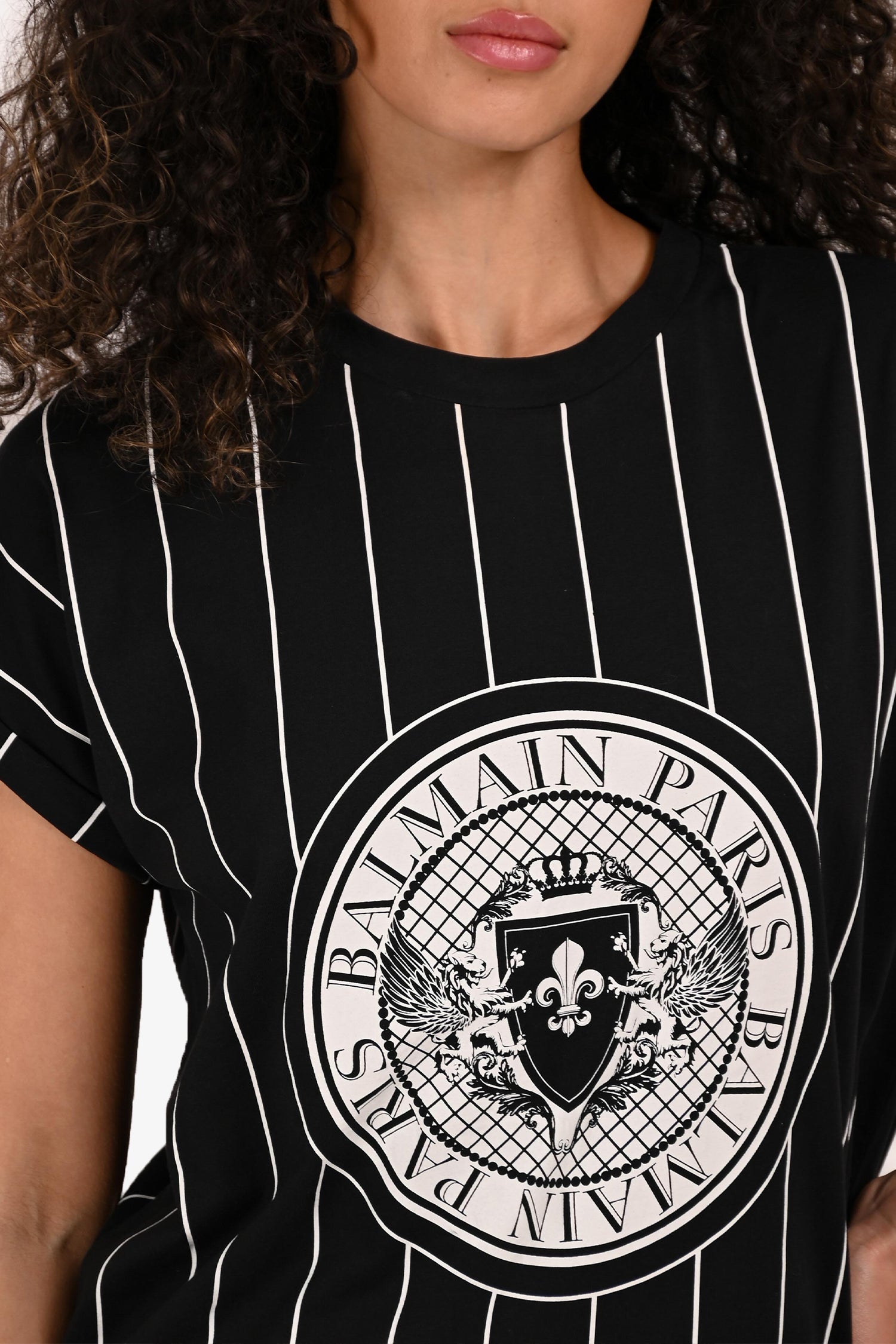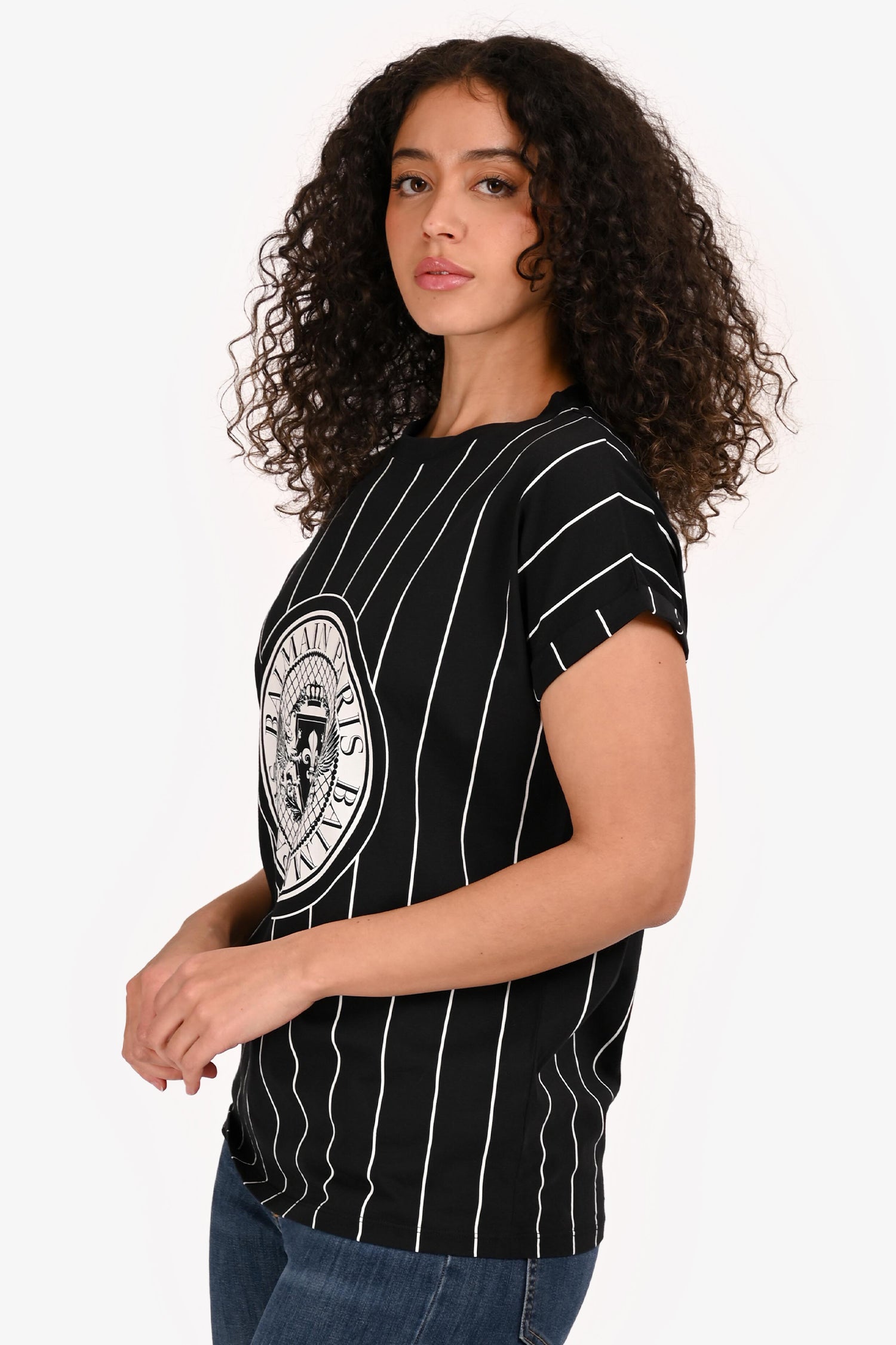 Refresh availabilityBalmain Black/White Stripe Logo T-Shirt. Pull-on. Round neckline. Tonal stitching.