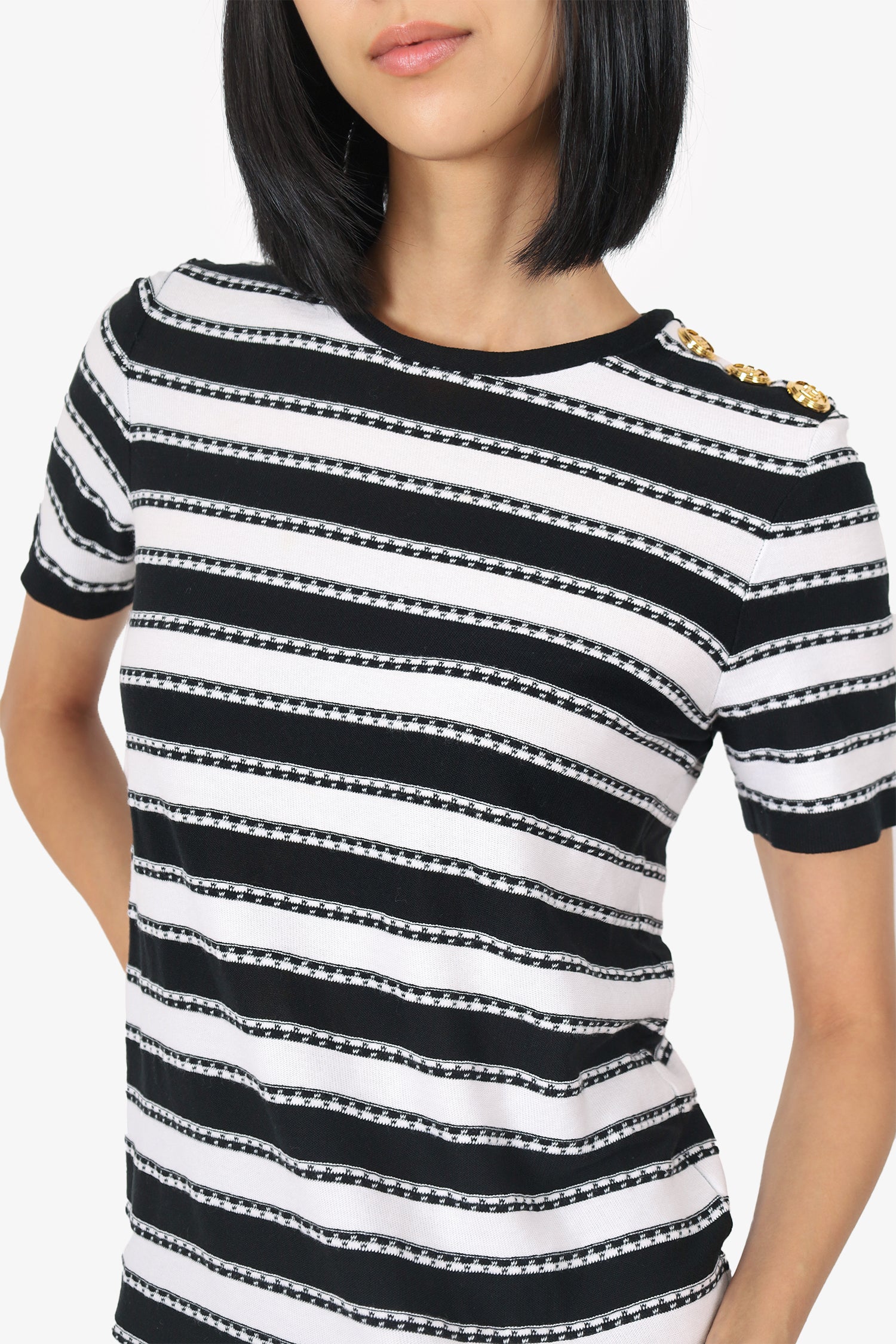 Refresh availabilityBalmain Black/White Striped Knit T-Shirt. Pull-on. Round-neckline. Button-embellishment to sleeve. Gold-tone hardware. Tonal stitching.