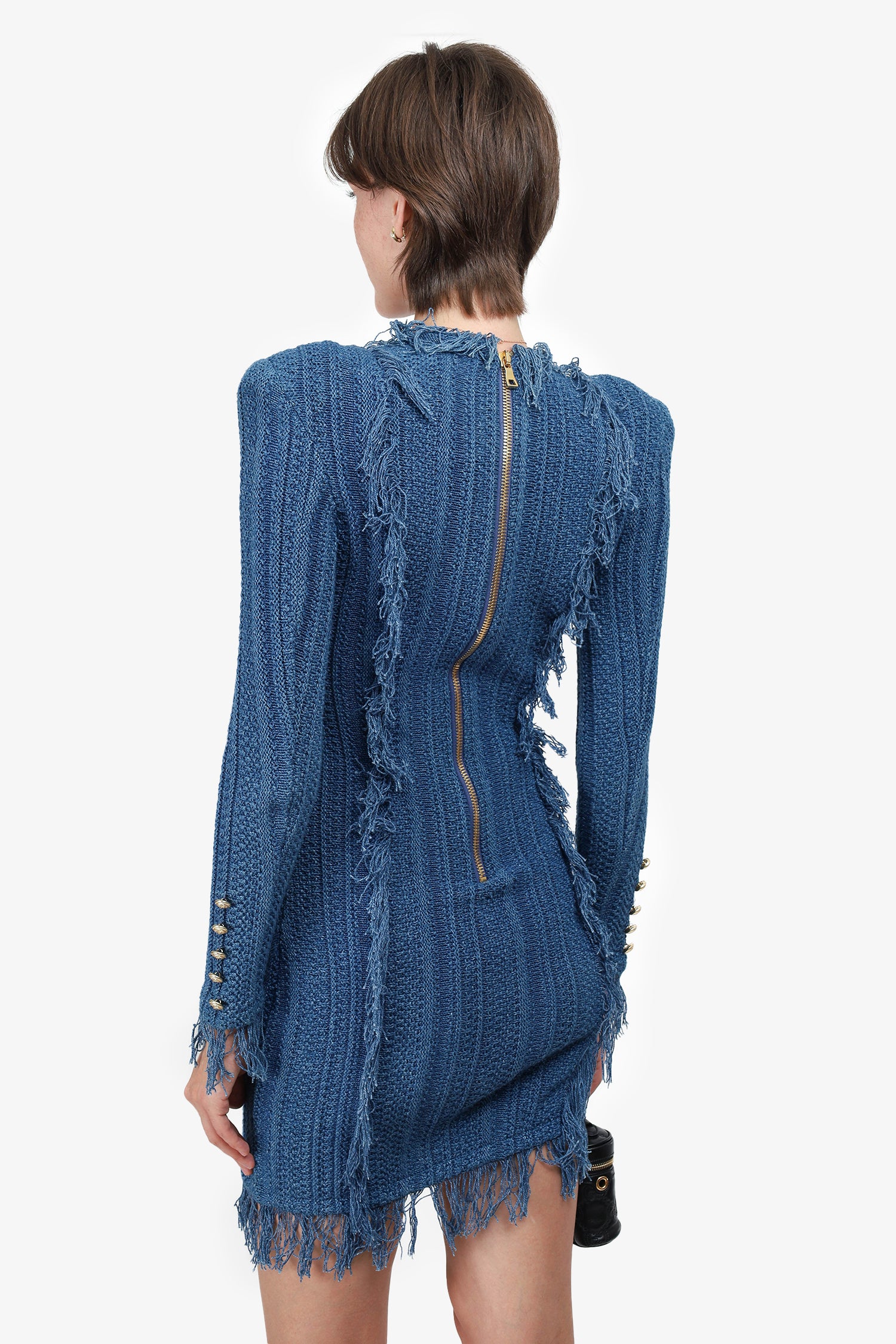 Refresh availabilityBalmain Blue Fringed Tweed Mini Dress. Rear zip closure. Long-sleeves. V-neckline. Tonal stitching.