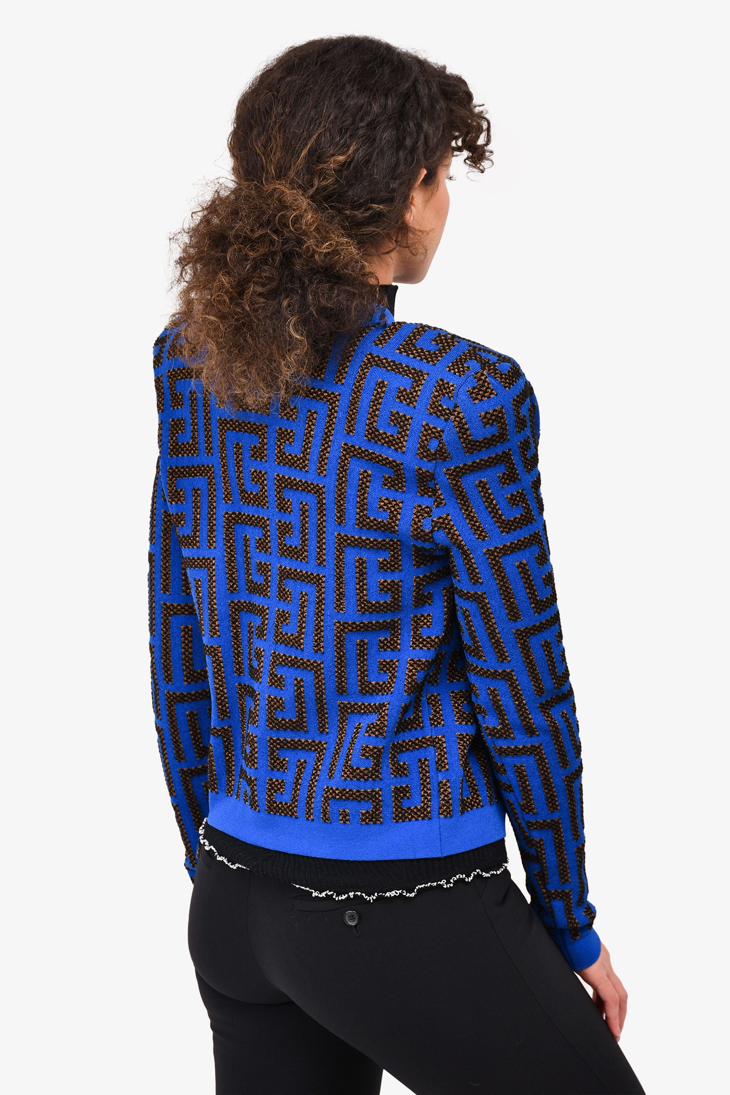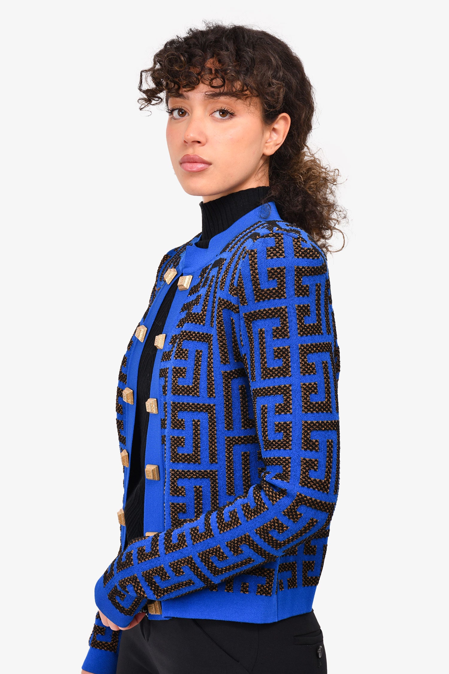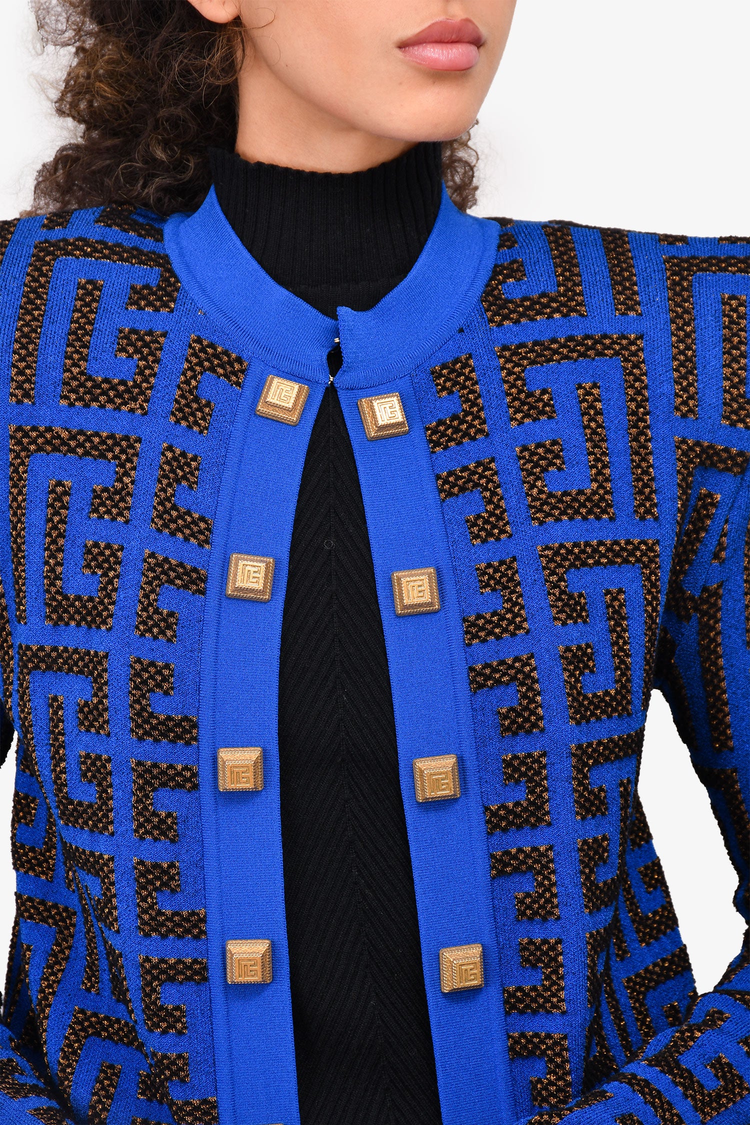 Refresh availabilityBalmain Blue Metallic Monogram Jacquard Cardigan Sweater with Shoulder Pads. Hook closures on the neckline. Ribbed neck, cuffs and hem.