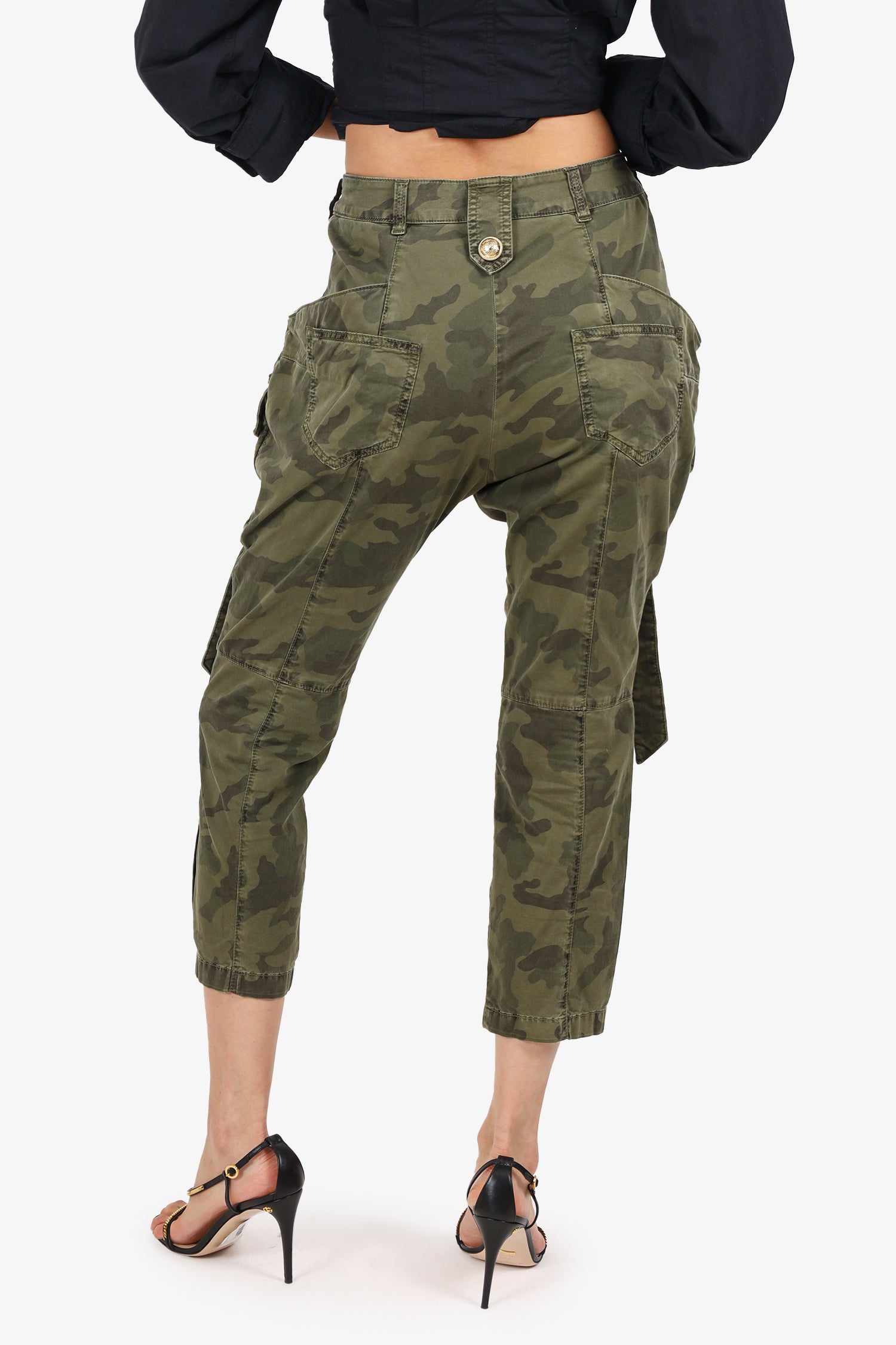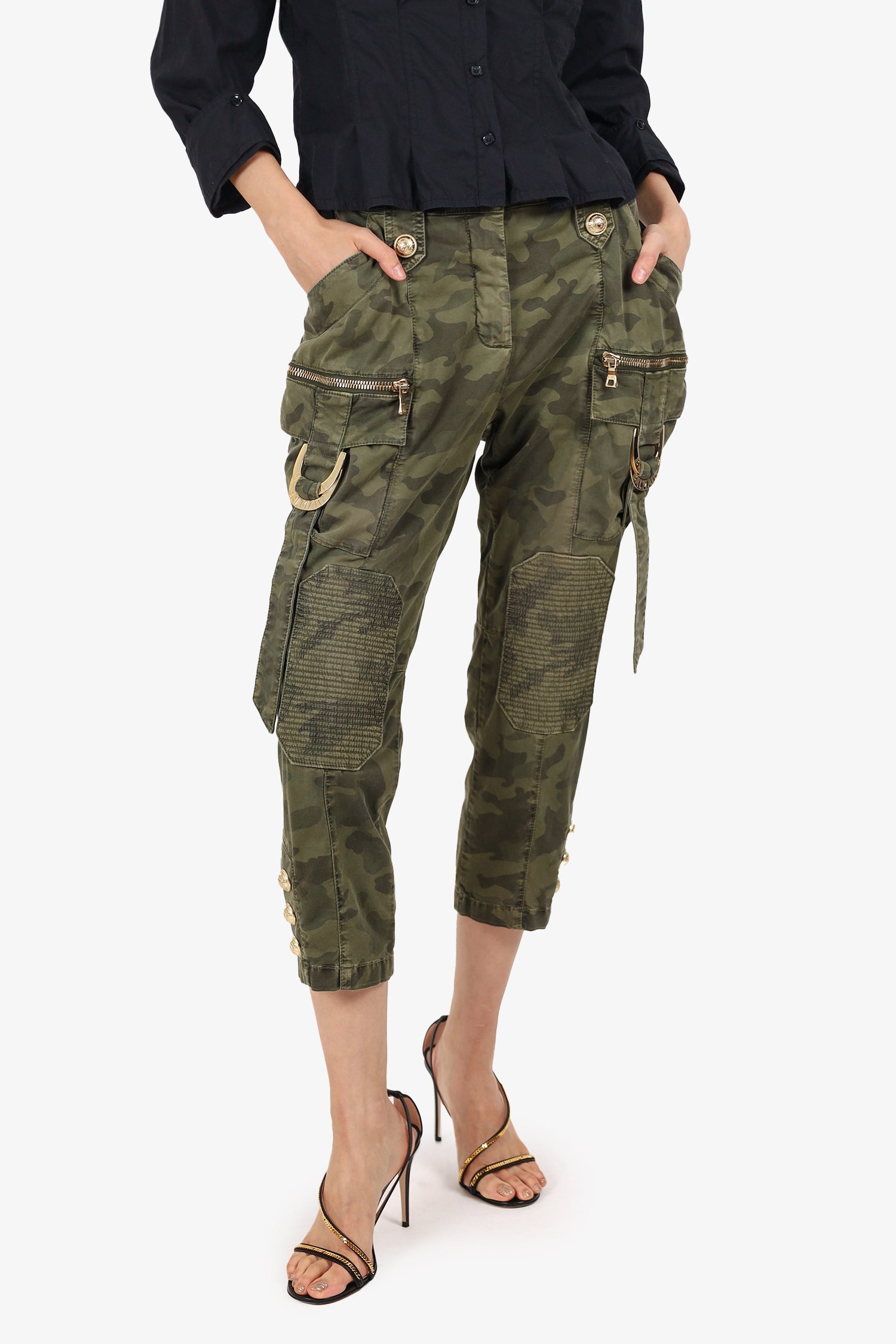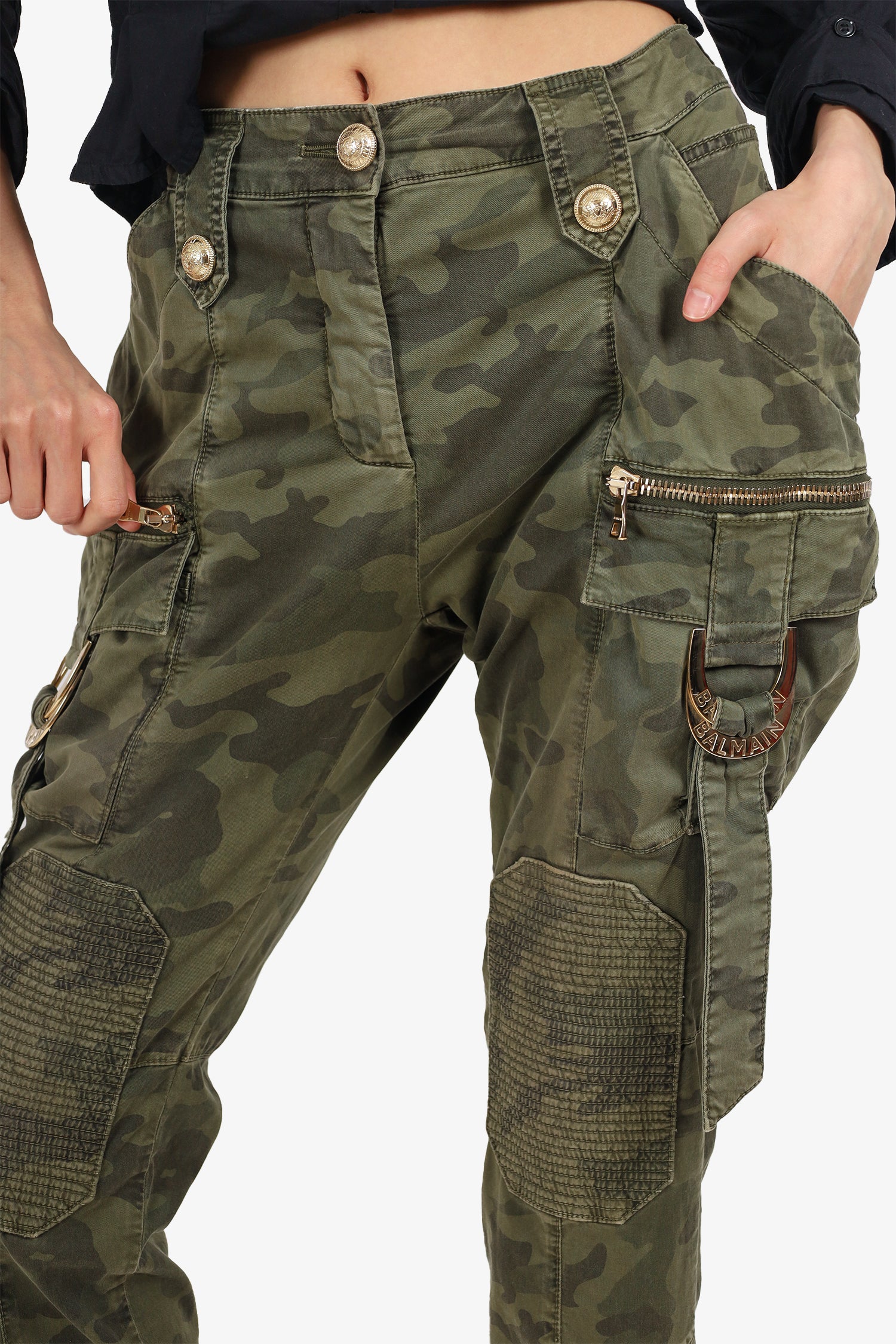 Refresh availabilityBalmain Camo Cargo Pants. Pull-on. Front zip and button-up closure. Waistband belt loops. 5 exterior pockets; 4 front side slip, 4 rear slip, 2 knee flap with buckle closure and additional zip pocket on flap. Strap with button detail at waistband. Button-up closure at ankle cuffs.
