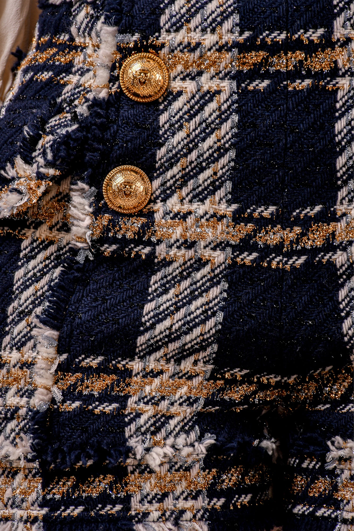 Refresh availabilityBalmain Navy Blue/Gold Houndstooth Wool High Waisted Shorts. Front snap button closures. Front pockets. Lined. Tonal stitching.