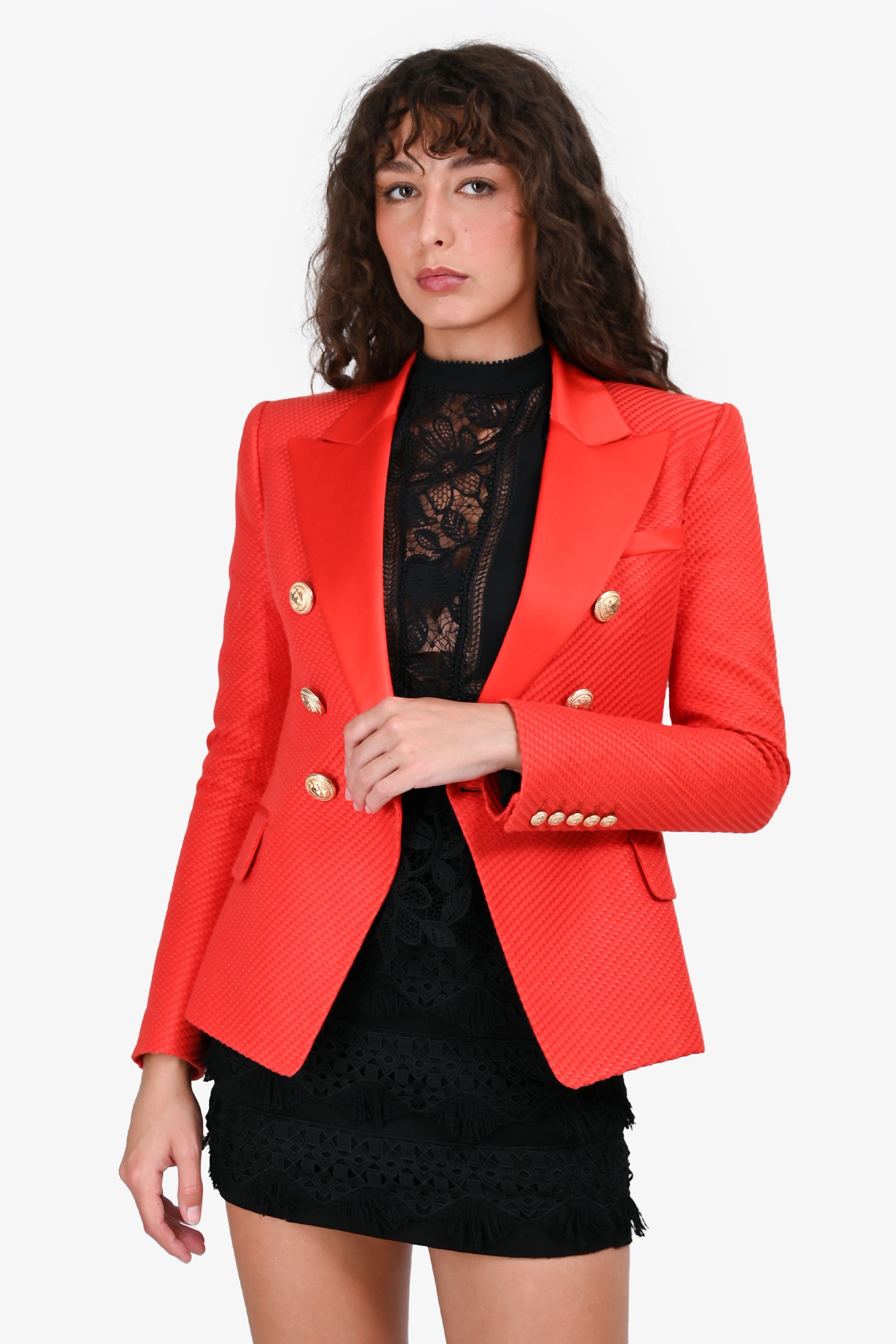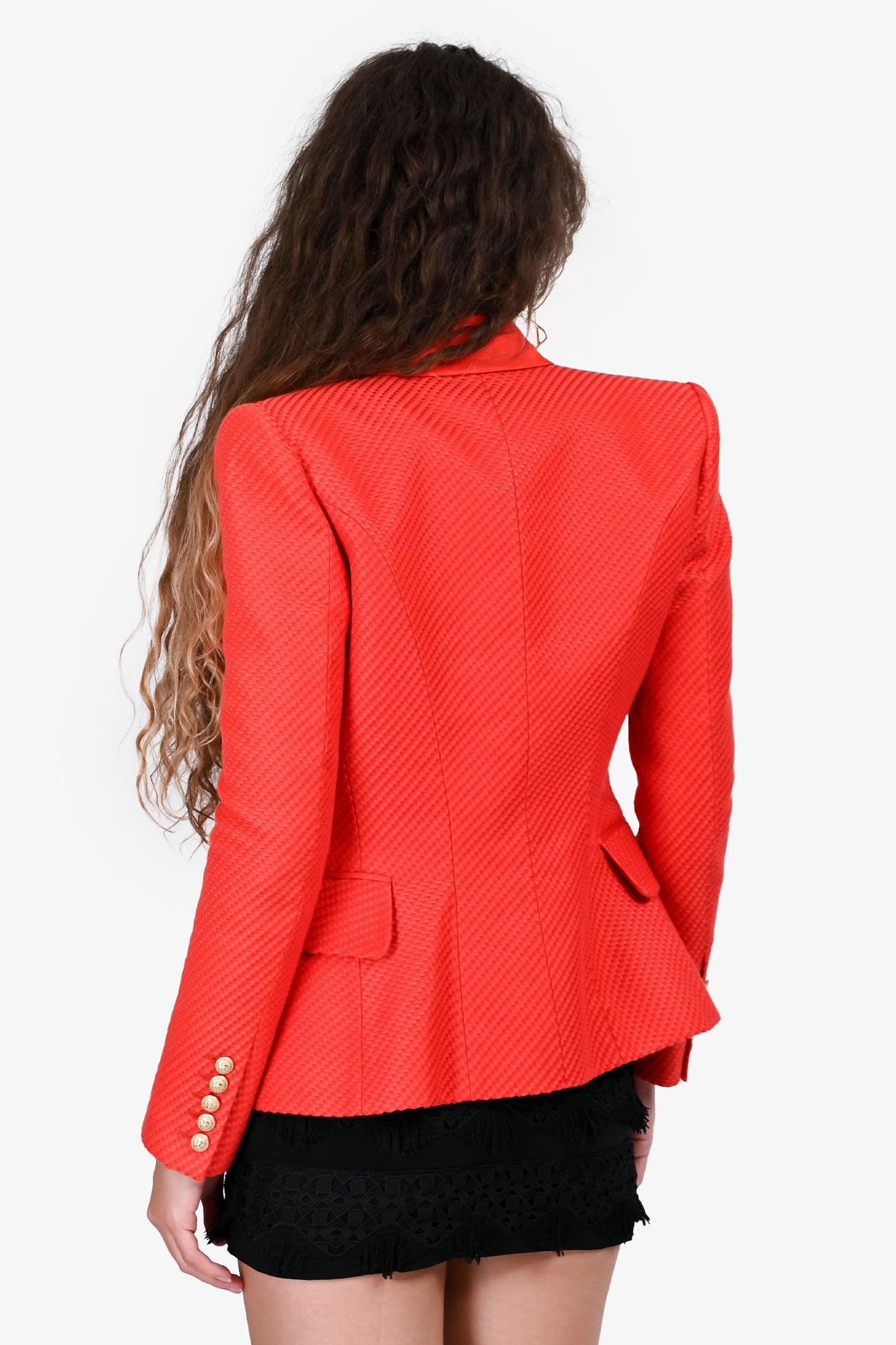 Refresh availabilityBalmain Orange Lapelled Gold Buttoned Blazer. Notched lapel. Long sleeves with button cuffs. Double-breasted front with signature gold-tone buttons. Structured shoulders. Tonal stitching.