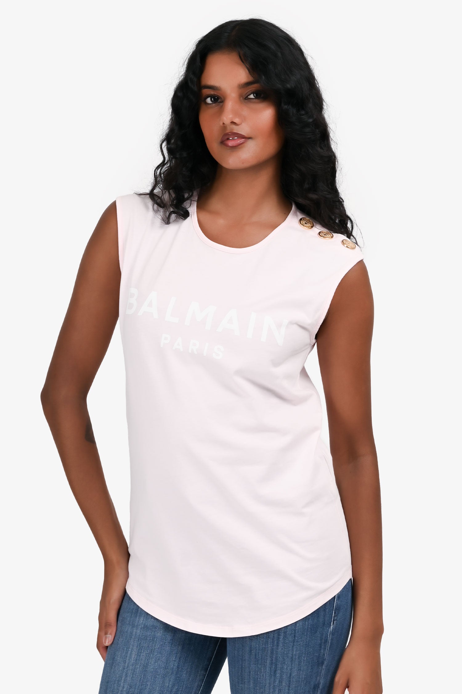 Refresh availabilityBalmain Pink/White Sleeveless Tank Top with Gold Buttons. Crew neckline. Contrast trim. Signature gold-tone button detailing at shoulder. Ribbed knit construction. Pull-on style. Tonal stitching.