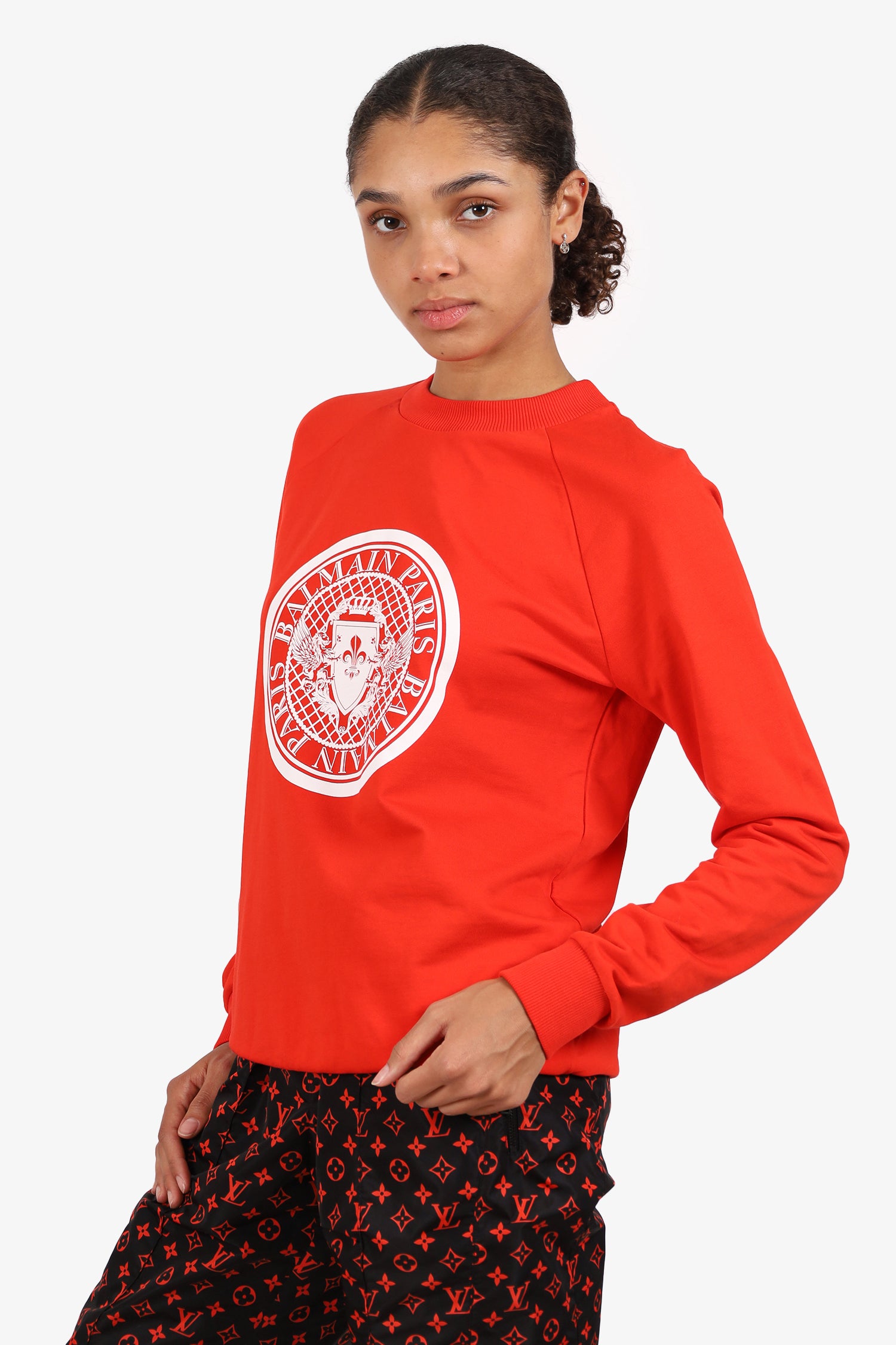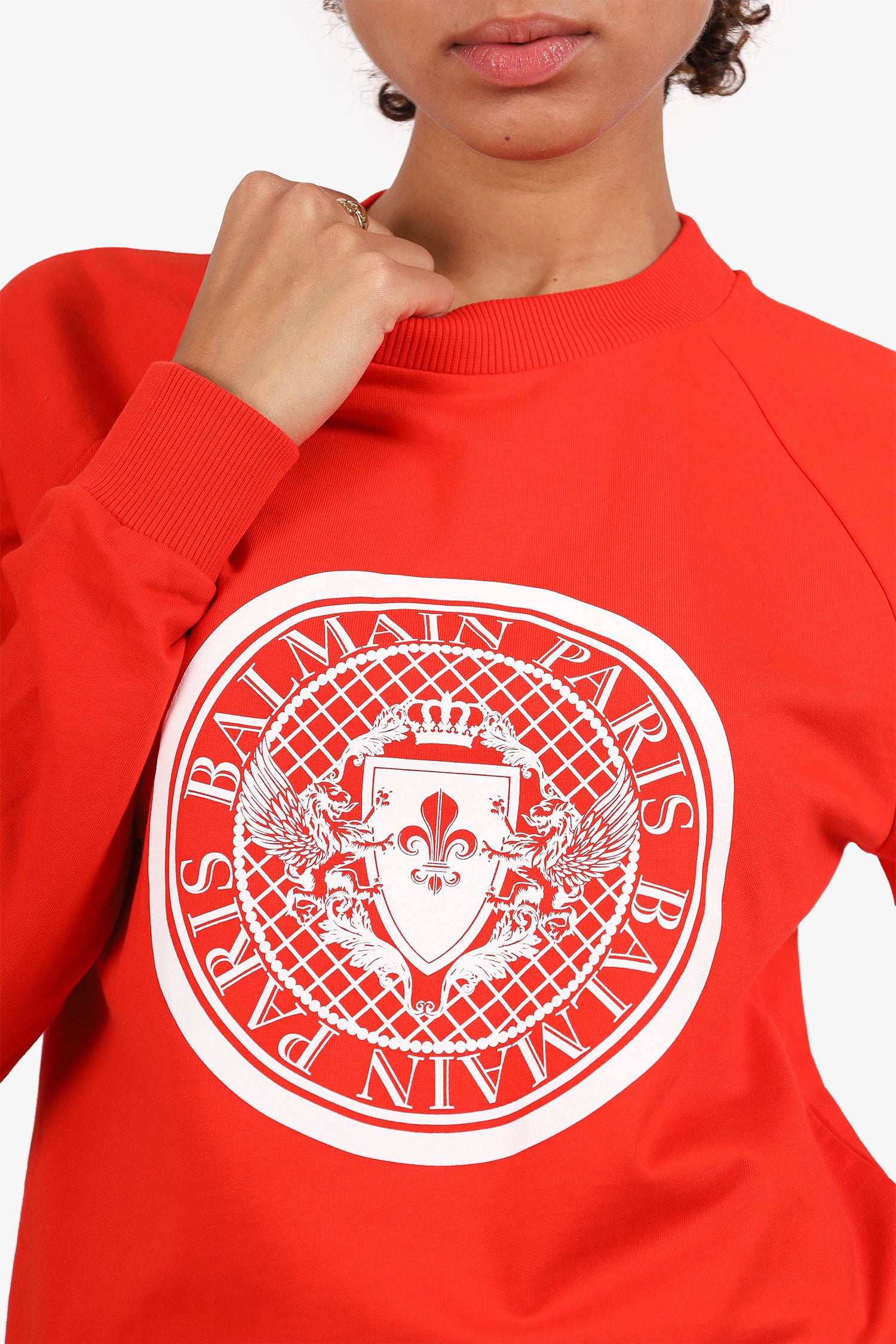 Refresh availabilityBalmain Red Logo Print Sweatshirt. Pull-on. Round neckline. Ribbed and elasticated neckline, sleeve cuffs and waistband. Front centre graphic. Tonal stitching.